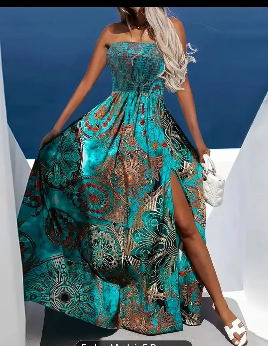 predam uplne nove , nenosene dlhe saty . krasna farba - tyrkysova (ako na prvych fotkach . Velkost Uni. Velmi prijemny taky ten chladivy material . Šaty maju po stranách aj vrecka. Moja vyska 166c...