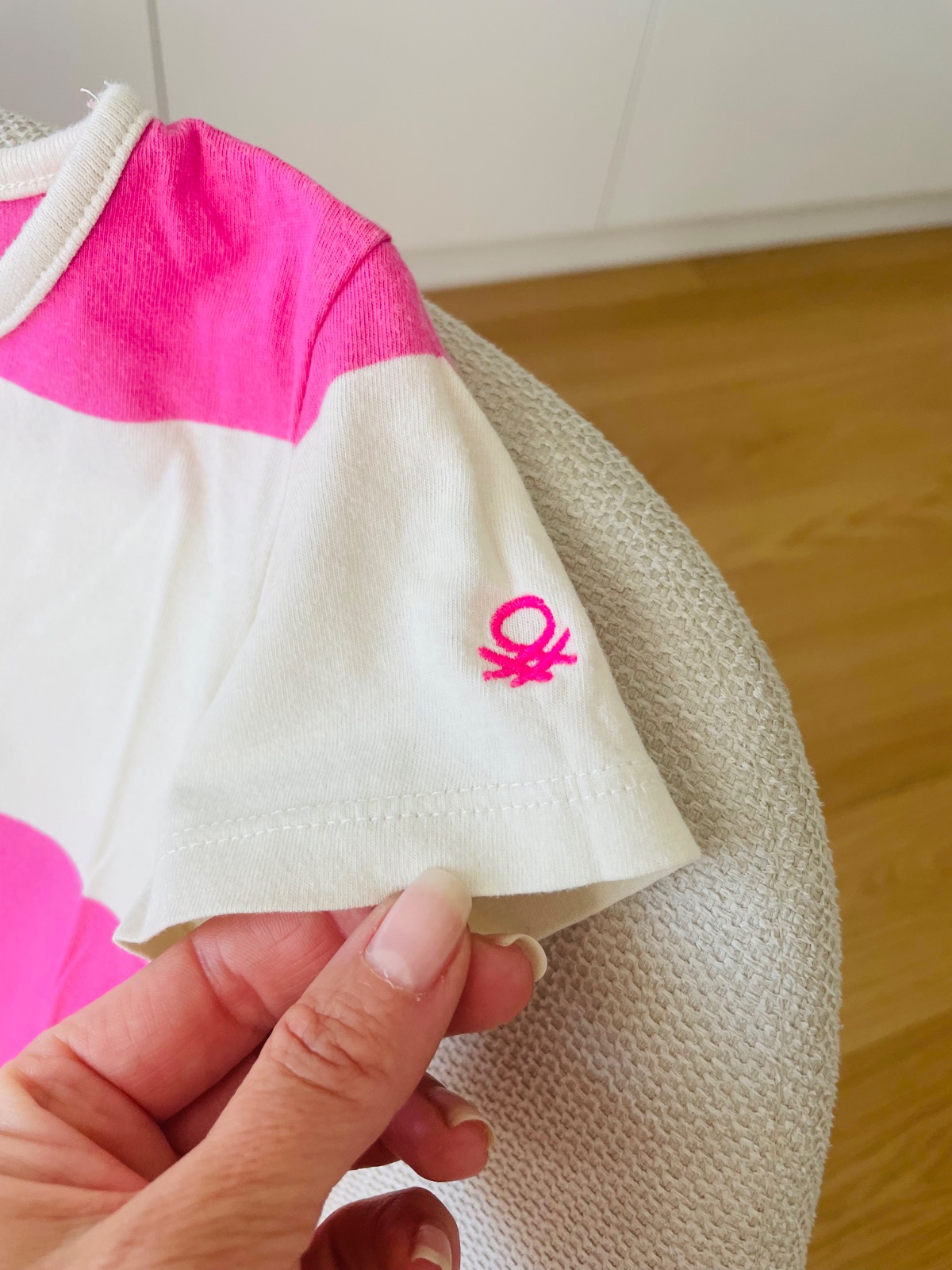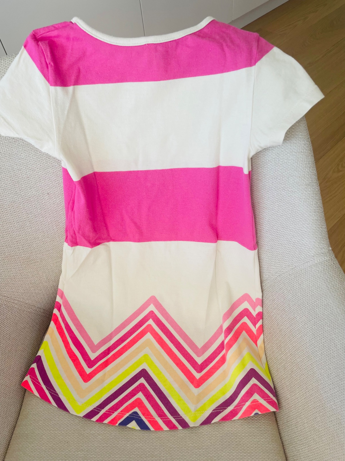 Posúvame ďalej bavlnené krásne šaty Benetton, so zníženým pásom, sivé s výrazne oranžovými pásikmi, nosili sme od 3 do 4 rokov, naše obľúbené, výborný stav.