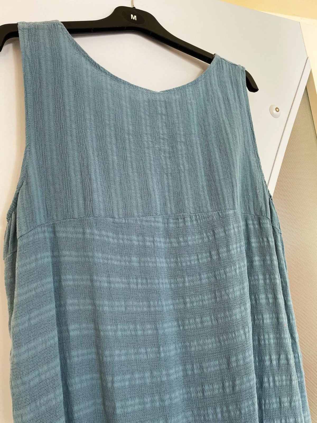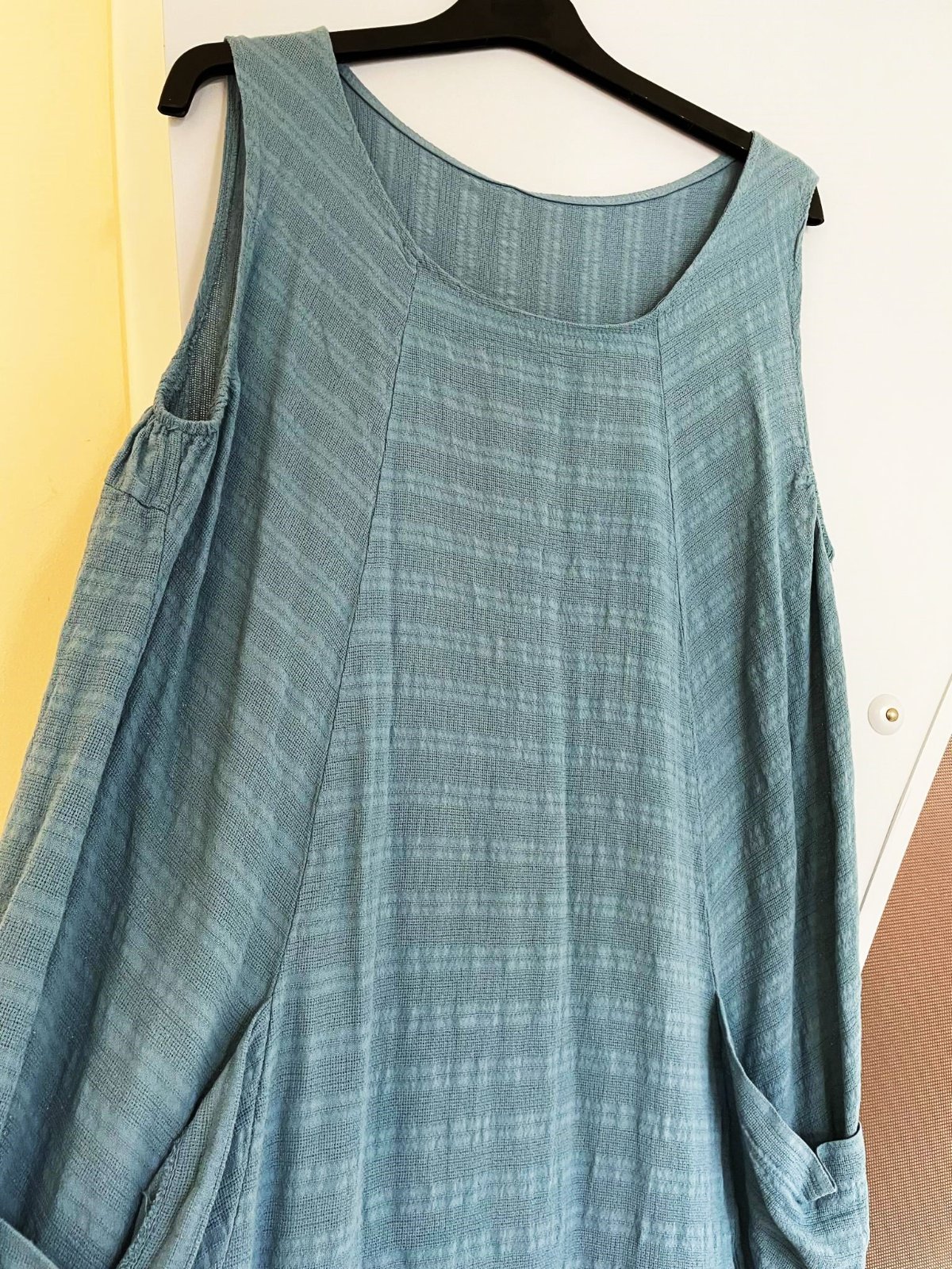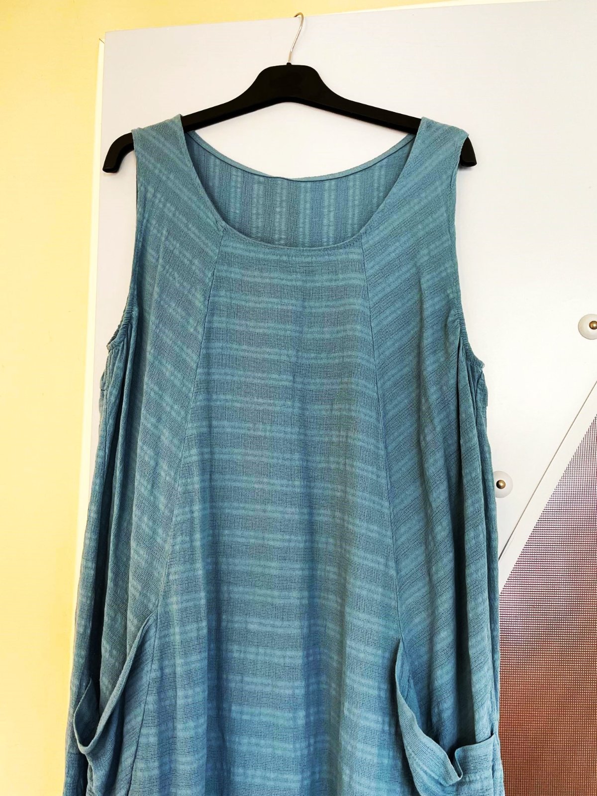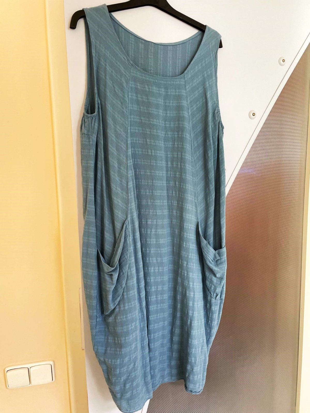perfektné - zaujímavo šité a riešené - nedostatky zakrývajúce voľné vzdušné bavlnené letné šaty, sú iba preprané po skladovaní, dovezené z Talianska - moderné plendavé ,tzv. ležérna móda, typ over size, super na denné nosenie ale aj na dovolenky - na pláž,sú ľahké a skladné a nosia sa jemne vykrčené výborná voľba pre tehotné, alebo po tehotenstve, krásne padajú, zakryjú nedostatky, maskujú veľké prsia, sú dlhšie a voľné, krásna letná vyblednutá džínsovo modrá ( oceľovo modrá ) farba, perfektná štruktúra materiálu, 100% bavlna v úprave ľanu, zaujímavo riešené vrecká, vhodné od č. XL ( ako over size ) - XXL