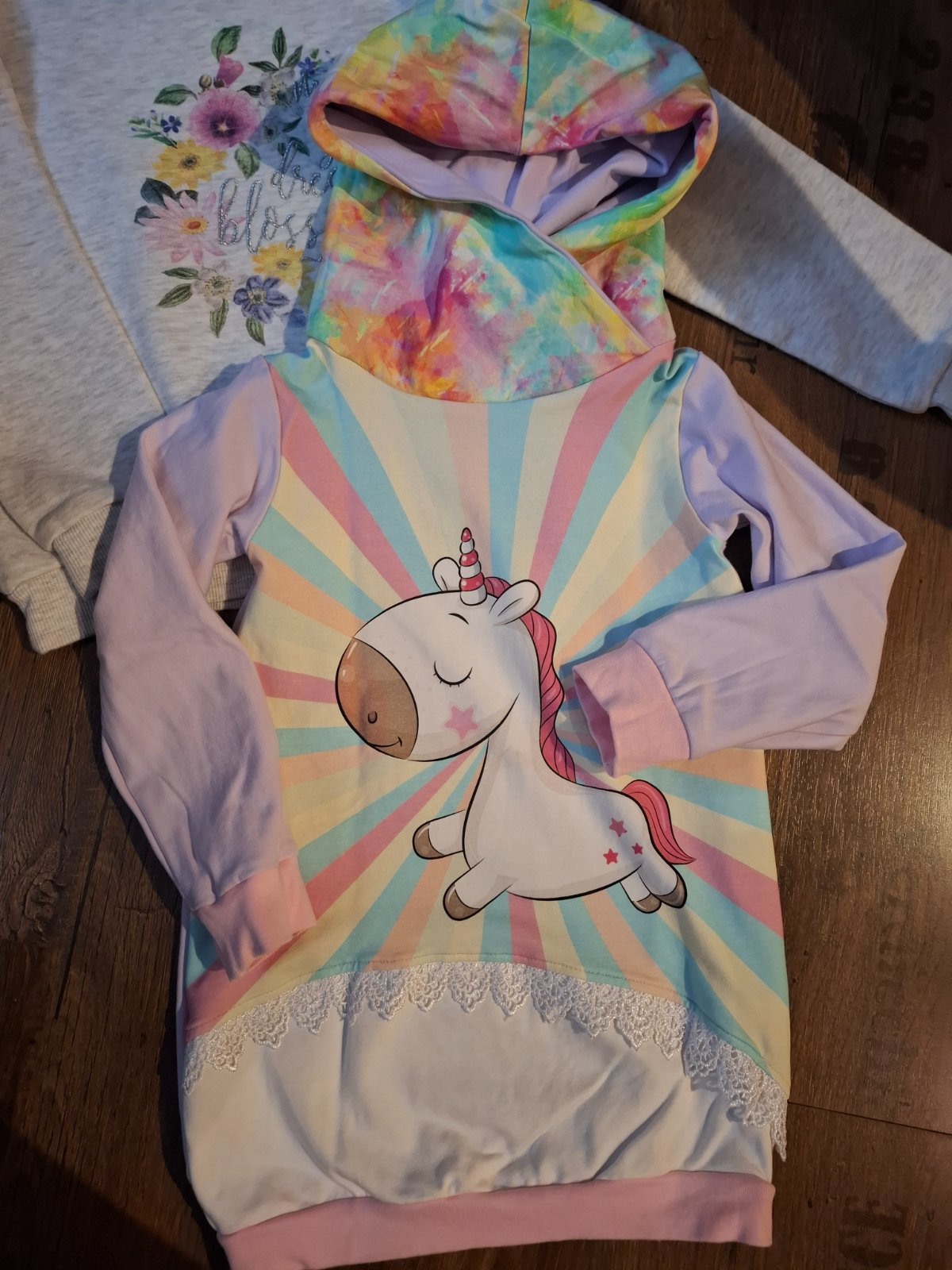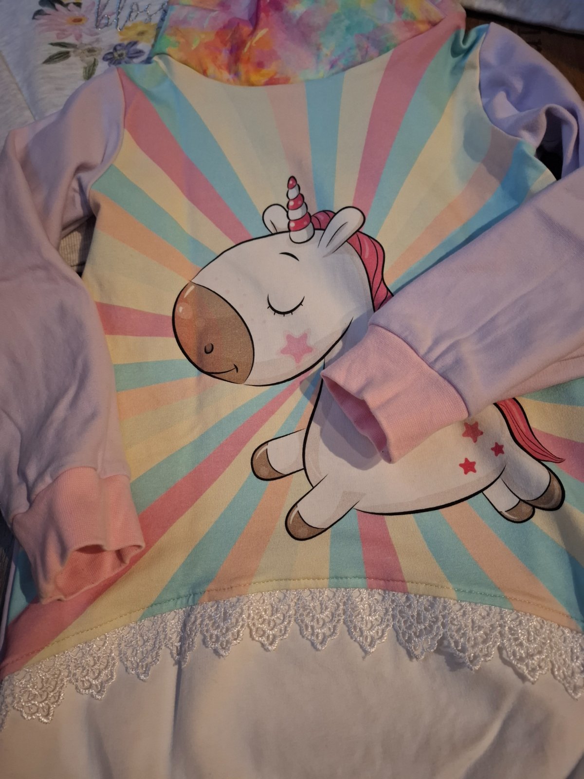 Jedinečná krásna mikina aj šaty, šitá slovenskou firmičkou Damdam Bibi. Druhé také nenájdete. Perfektne vyzerajú, vďaka strihu najskôr šaty a potom dlhšia mikina. Top stav. Jednorožec, dúhové farby.