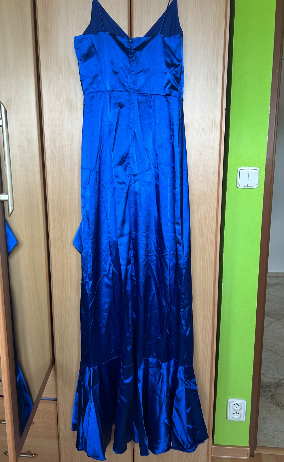 Dlhé saténové šaty. Nové, s visačkou. Z jednej časti vpredu sú skrátené a odhaľujú nohu. Šírka pod pazuchami bez natiahnutia 42cm. Dĺžka od prestrihu dole 48 a pokračujú 119cm