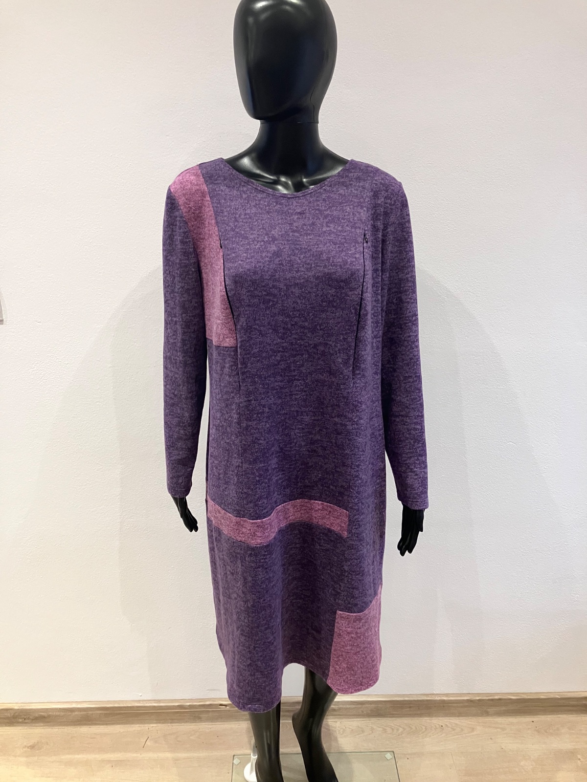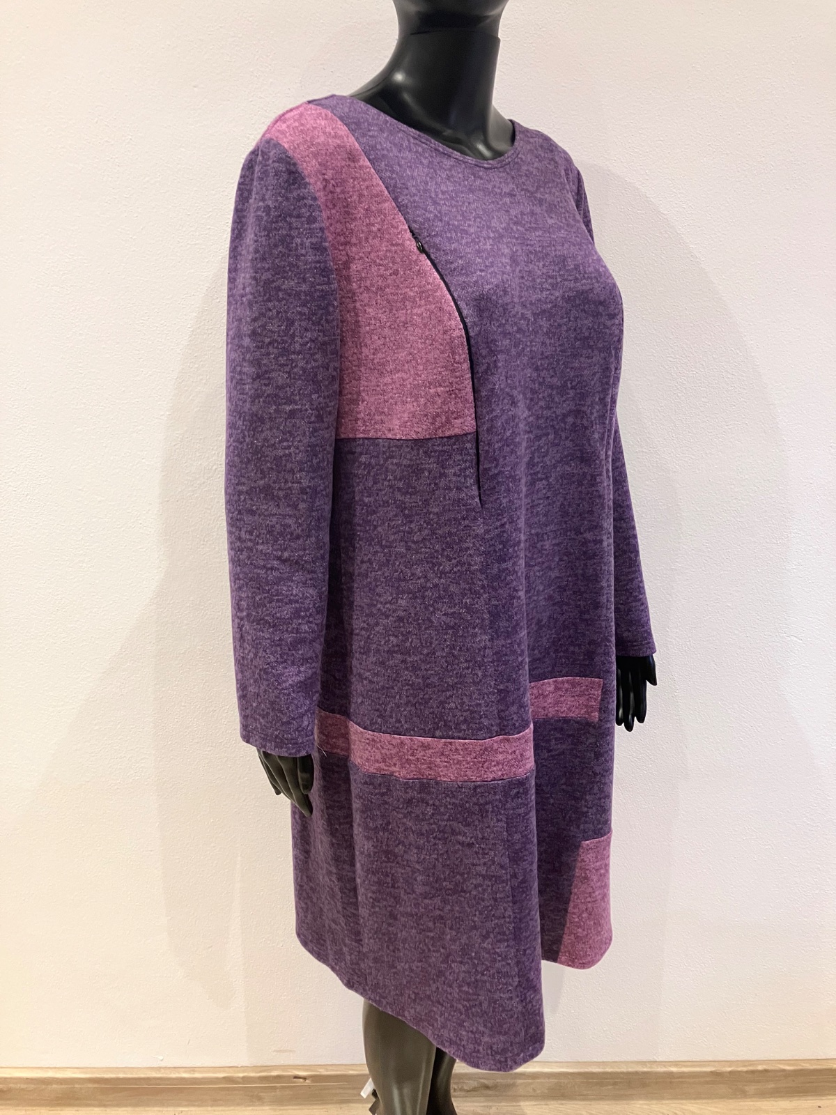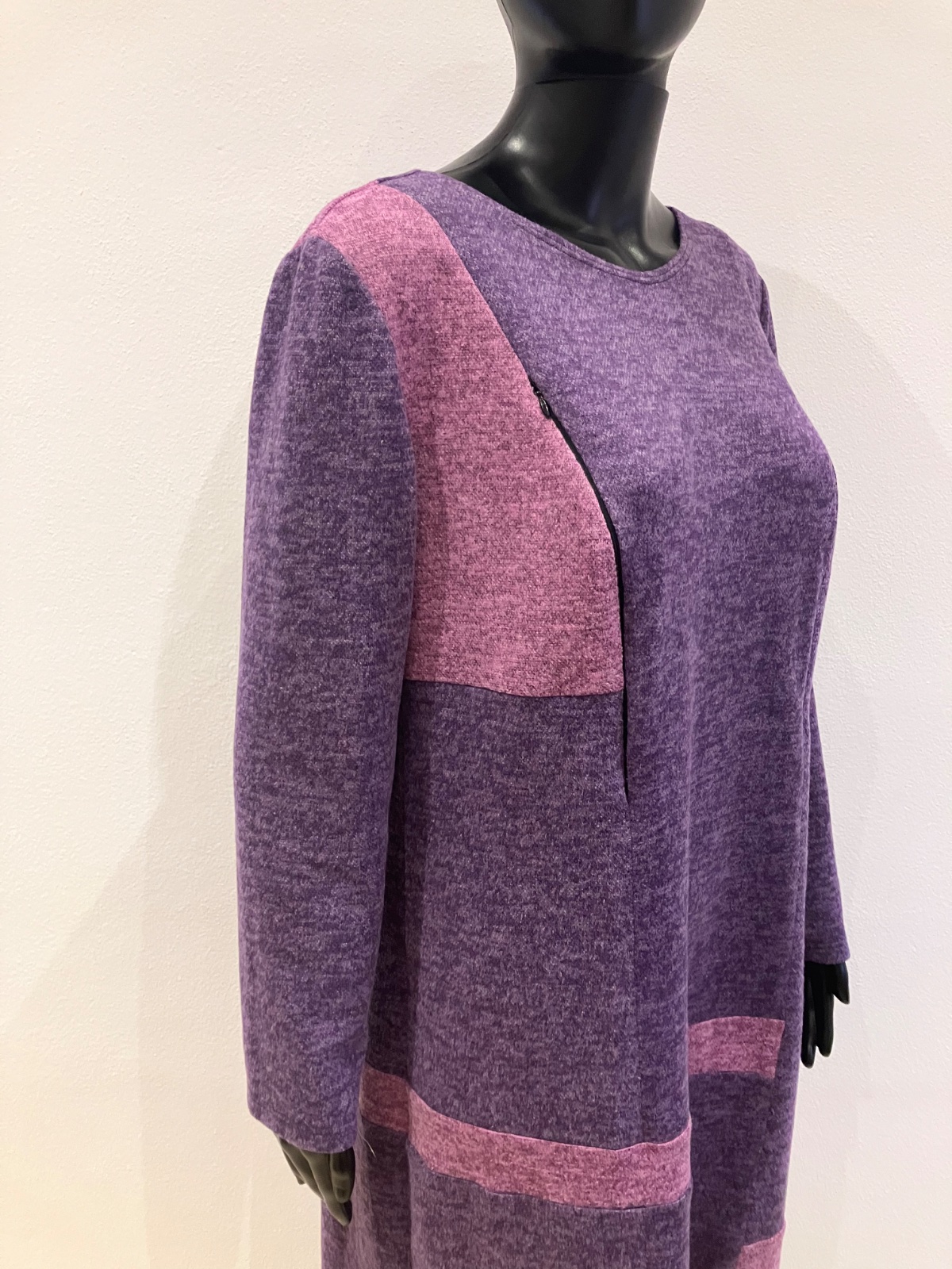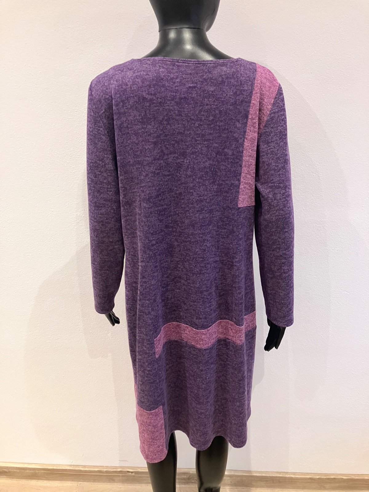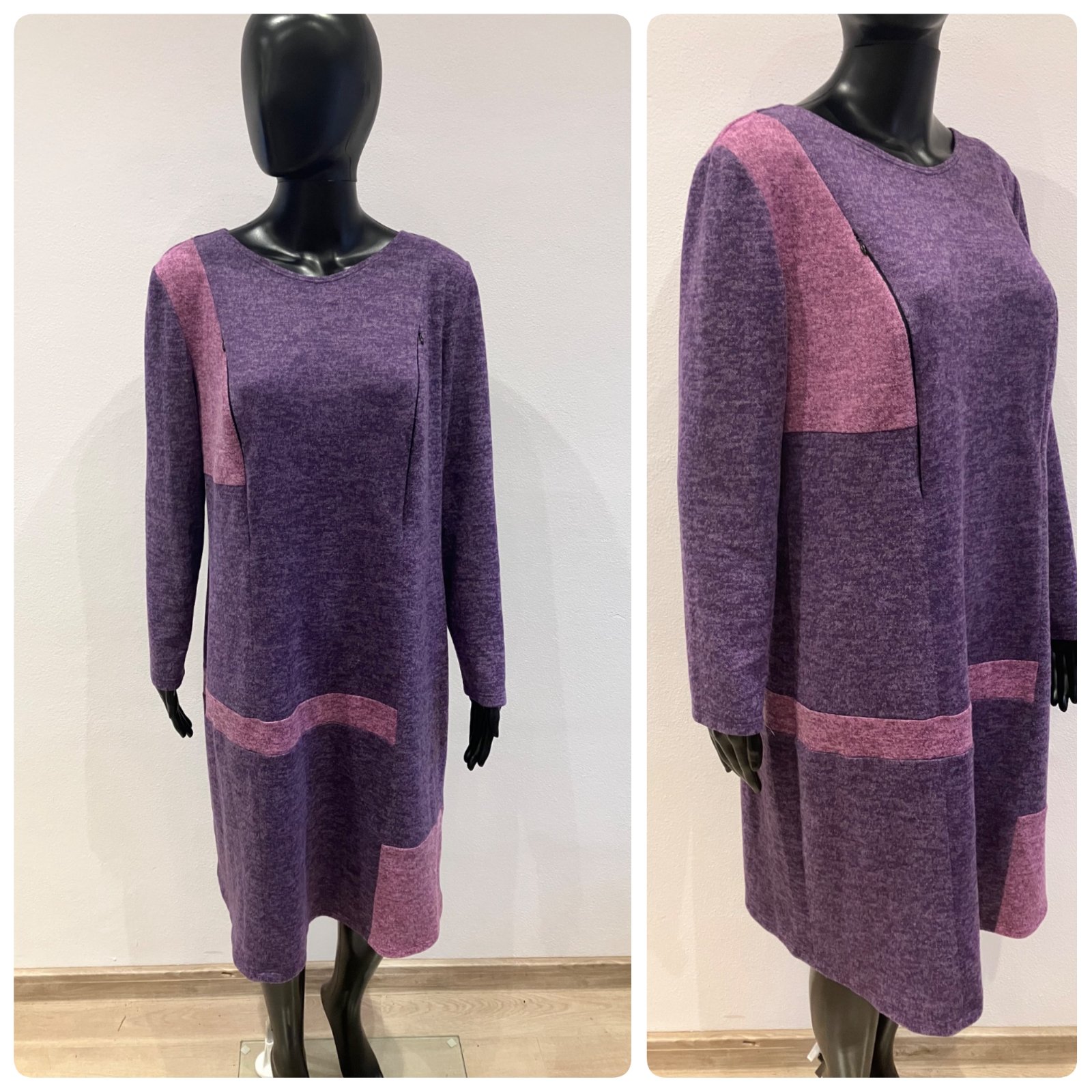Dámske zimné šaty s dlhým rukávom, vpredu na hrudi dve funkčné zipsy, okrúhly výstrih, farba fiaľovo-tmavoružová, elastické, veľkosť cca XL.