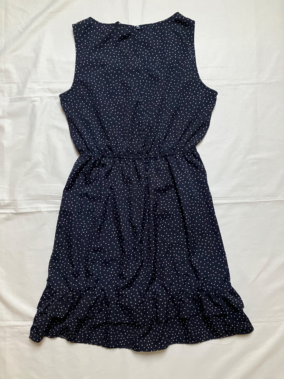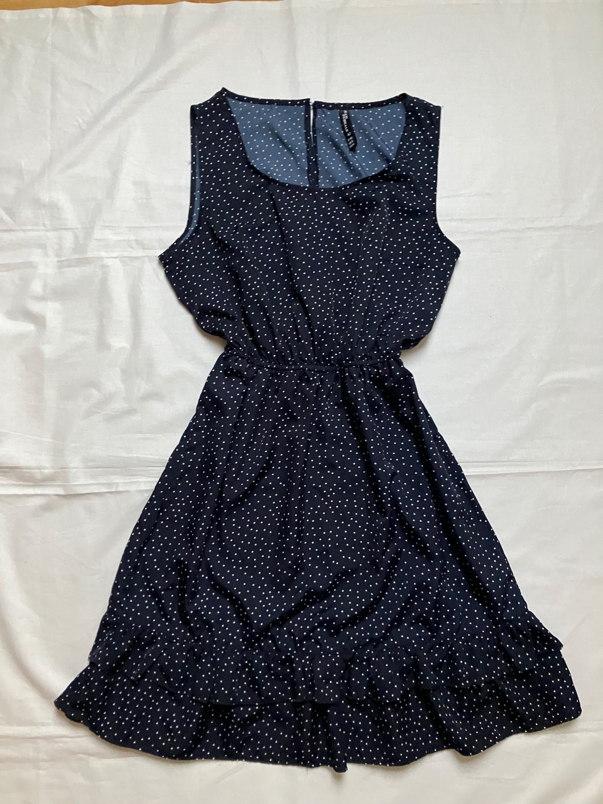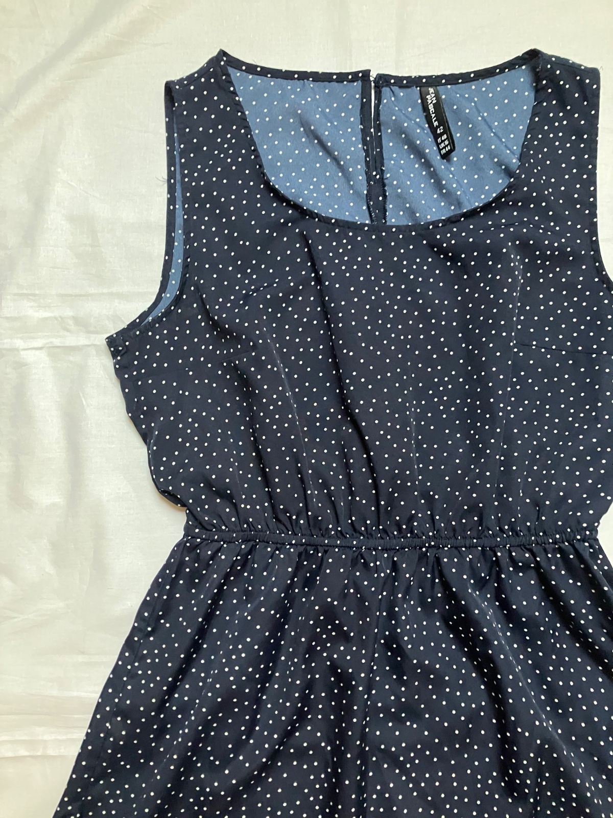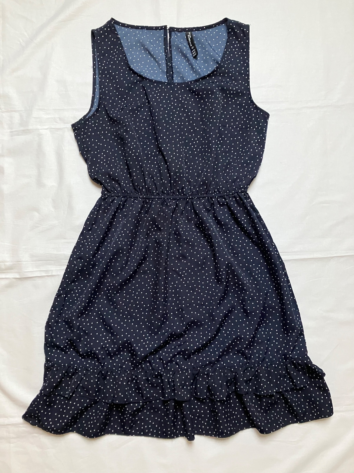 Krásne dámske tmavomodré bodkované šaty s jemnými volánmi – dokonalý letný kúsok v štýle retro / polka dot aesthetic 🤍