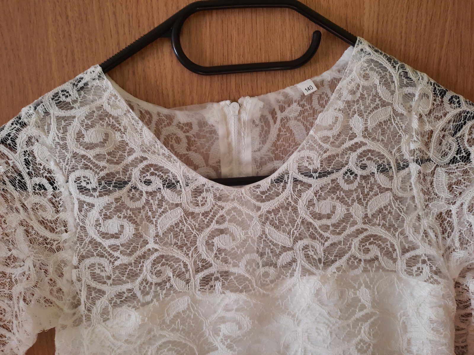 Dlhe biele saty na 1.sv.prijimanie, vrchny diel cipka, dlzka 110 cm, velkost 140. Kruhova spodnicka. K satam su k dispozicii aj biele lodicky velkost 22.