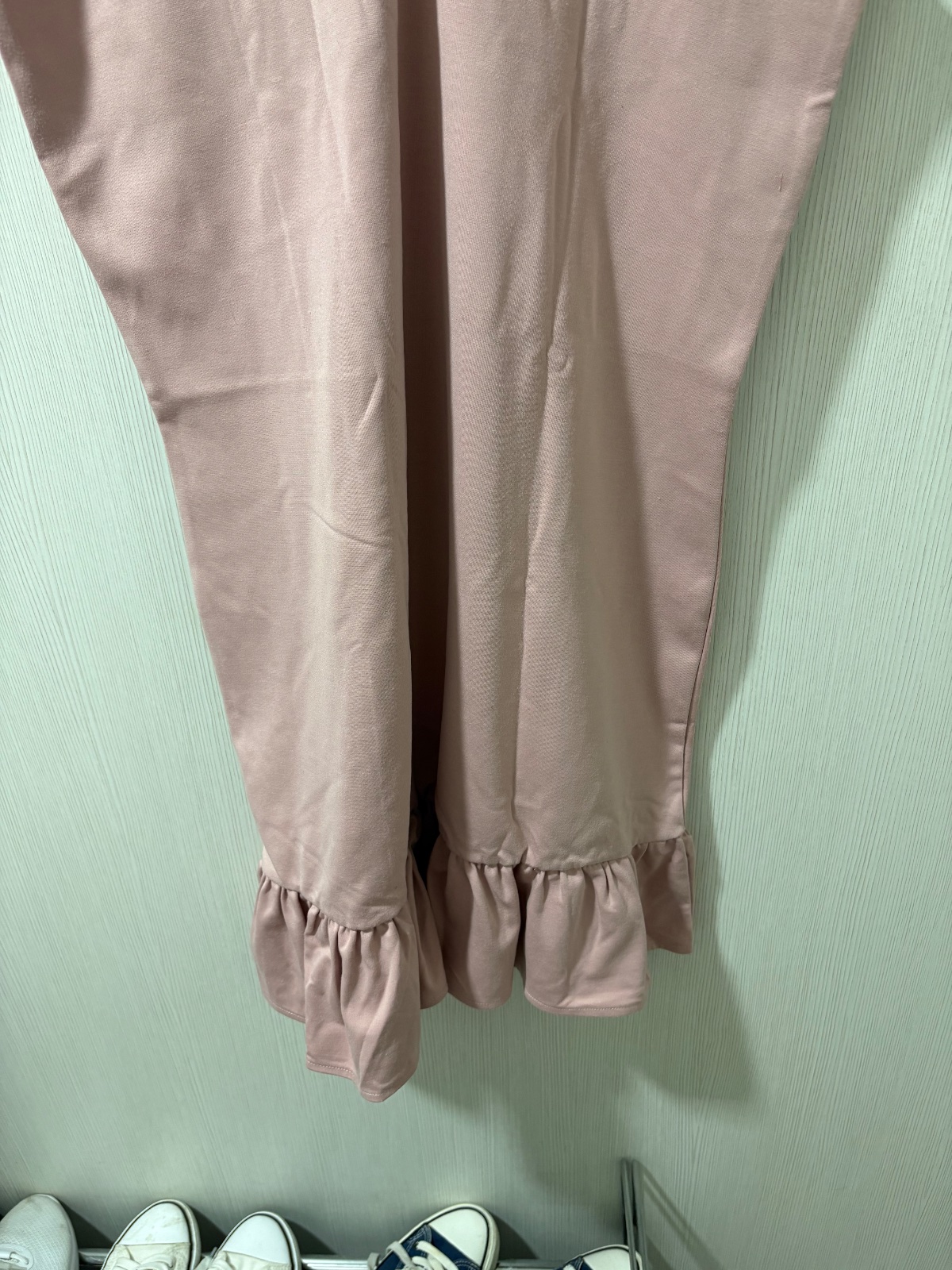 Šaty staroružovej farby s volánovým lemovaním, takže možné nosiť cez plecia, prípadne len na jedno plece. Zapínanie na zips na chrbte, na zadnej strane sukne je rázporok. Mierne elastické. Dĺžka 10...