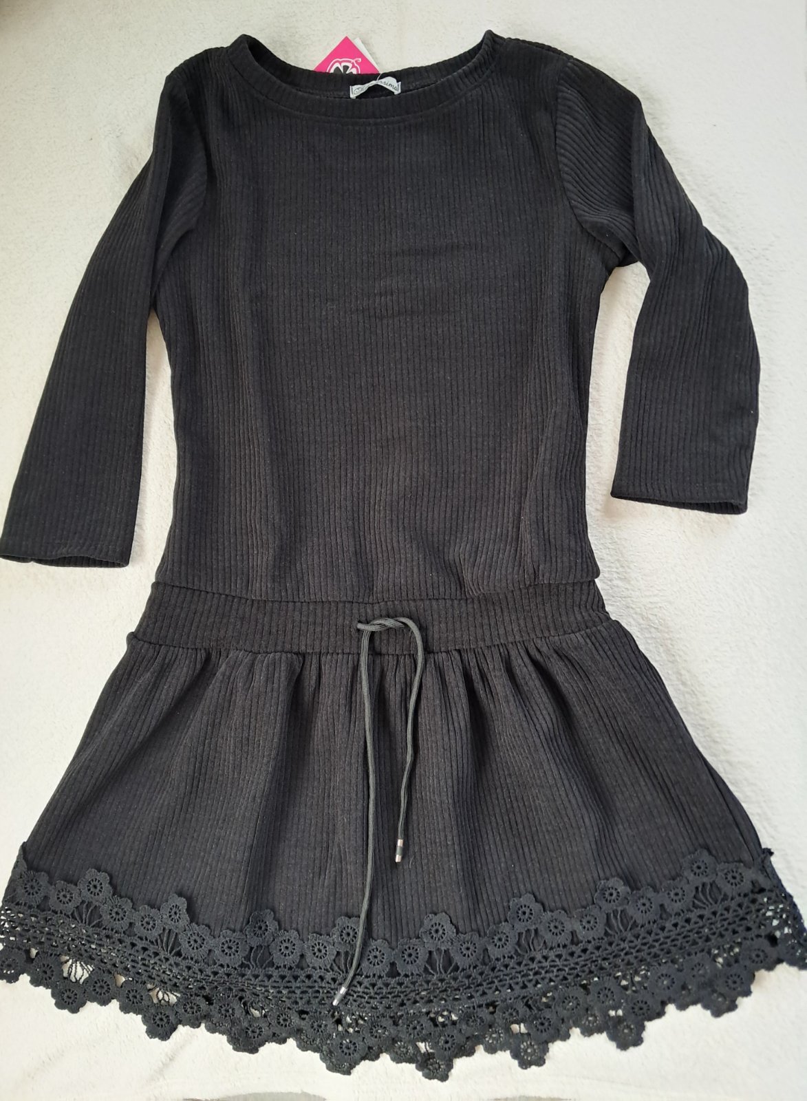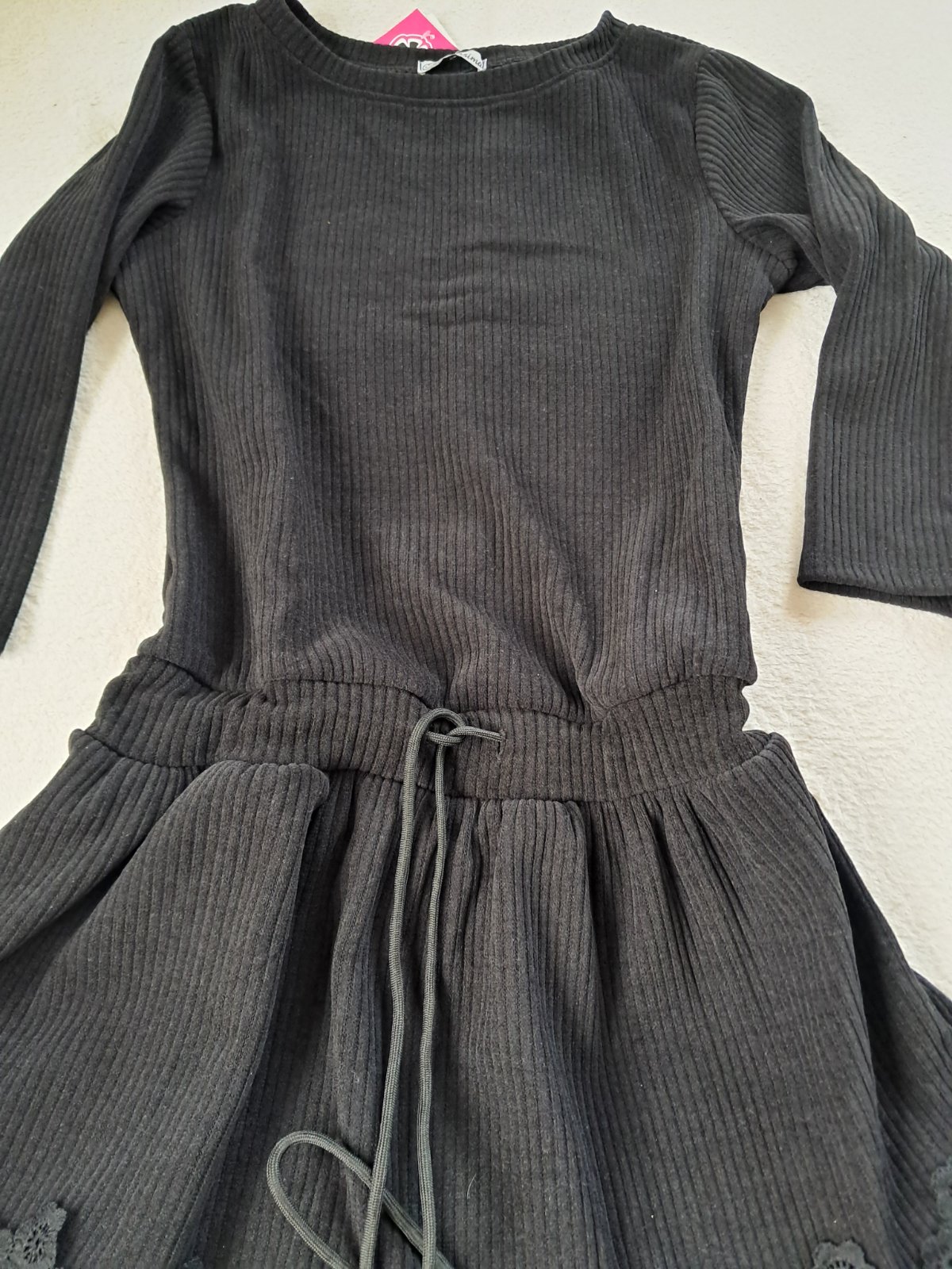 SkladomKrásne dámske NOVÉ šaty, univerzálna veľkosť. Farba krásna čierna, krajšia ako na fotke. Neboli ani prané, sú ešte s visačkou. Celková dĺžka je 87cm. Rozmery sú na fotkách. V páse je funkčná šnúrka pre prispôsobenie postavy. Materiál je veľmi príjemný, rebrovaný. Sú mäkké.