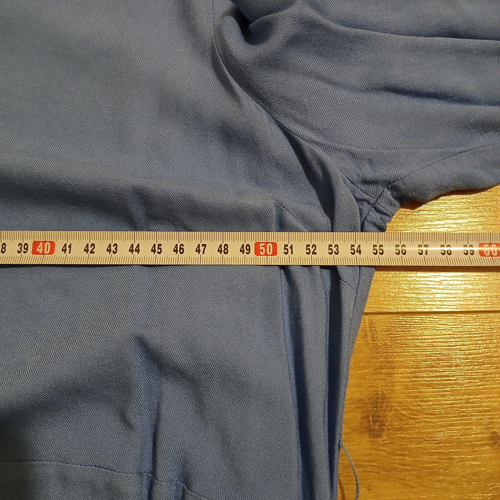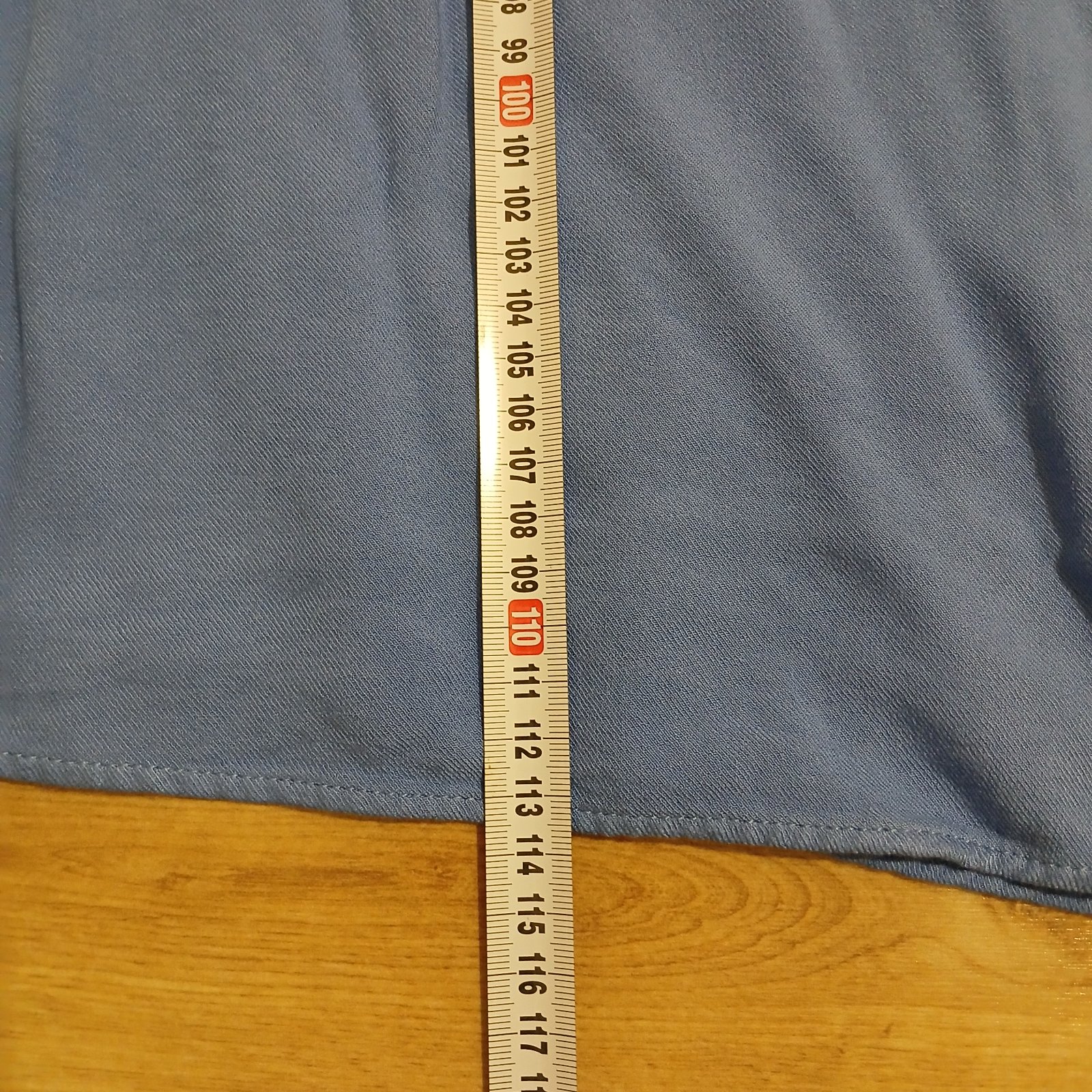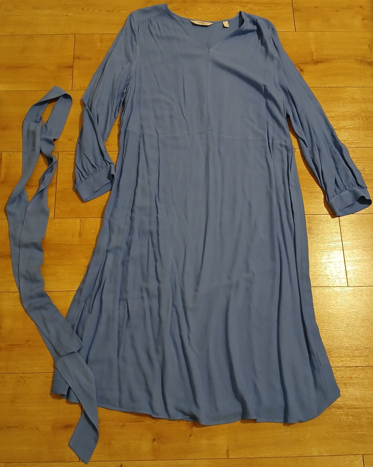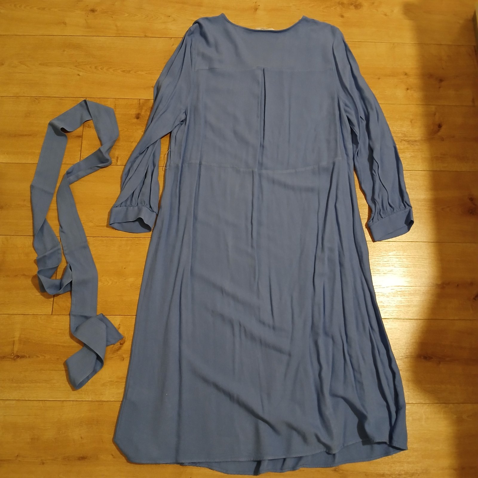 Praktické modré šaty s dlhým rukávom a opaskom na bežné nosenie
