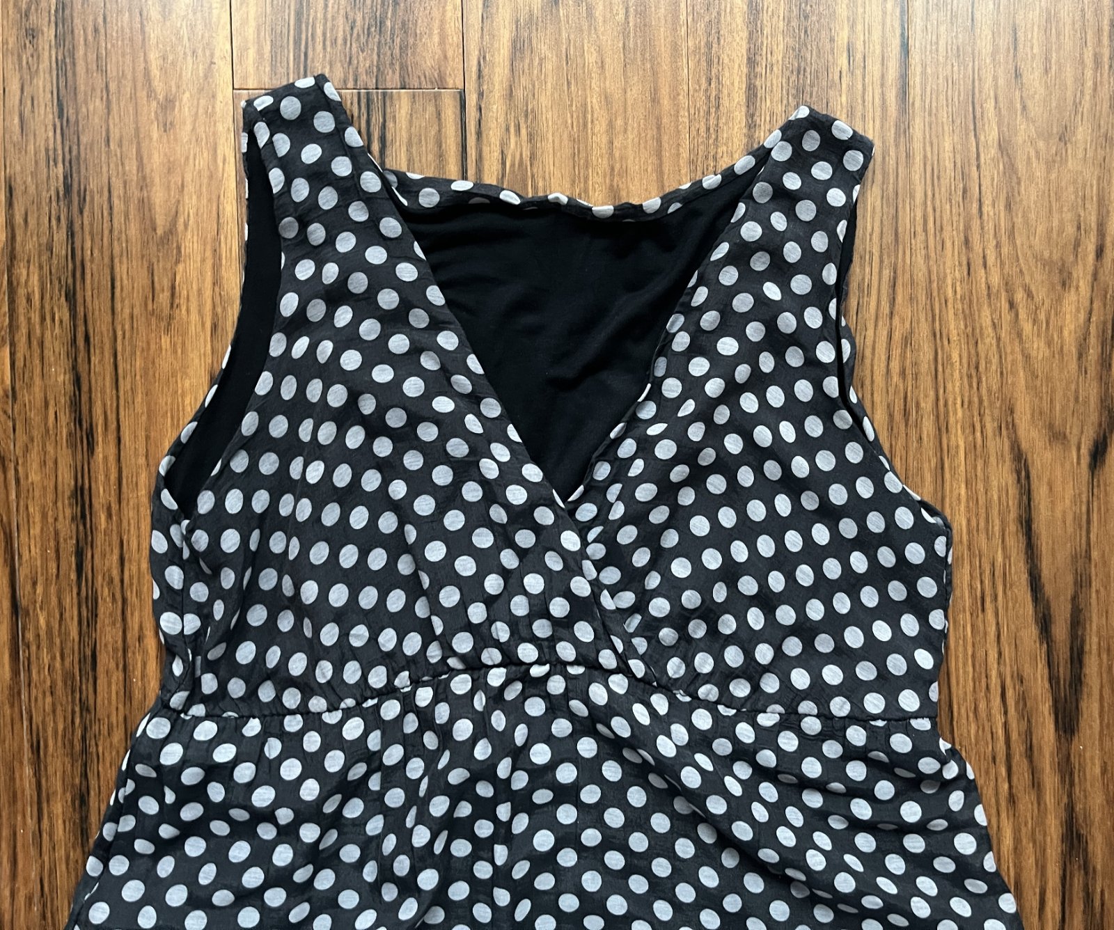 Letné čierne bodkované šaty, strih do áčka, pod prsiami prestrihnuté s gumičkou. Celková dĺžka 89cm, šírka v prestrihnutí 41cm, šírka spodného lemu 73 cm. Zloženie 95% viskóza, 5% elastán.