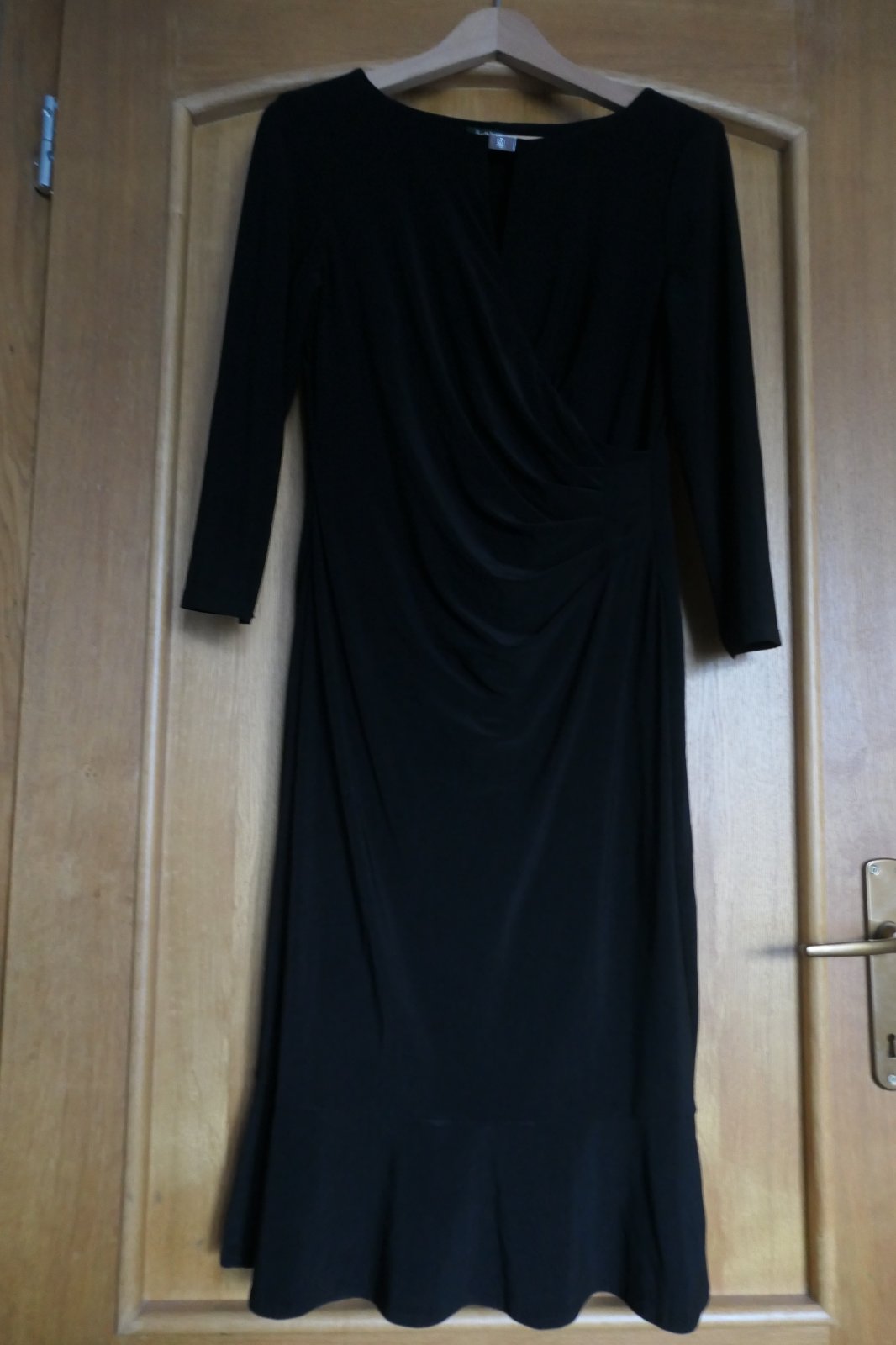 nadherne cierne luxusne saty Ralph Lauren, malicko nosene, krasne a nadcasove, na spodku jemnucky volanik, na brusku nazberkane, skryju nedostatky nad dekoltom krasny luxusny pliesok s vytepanym LRL, odporucam, krasne, velkost 8 sedia na M/L, max. pruzne