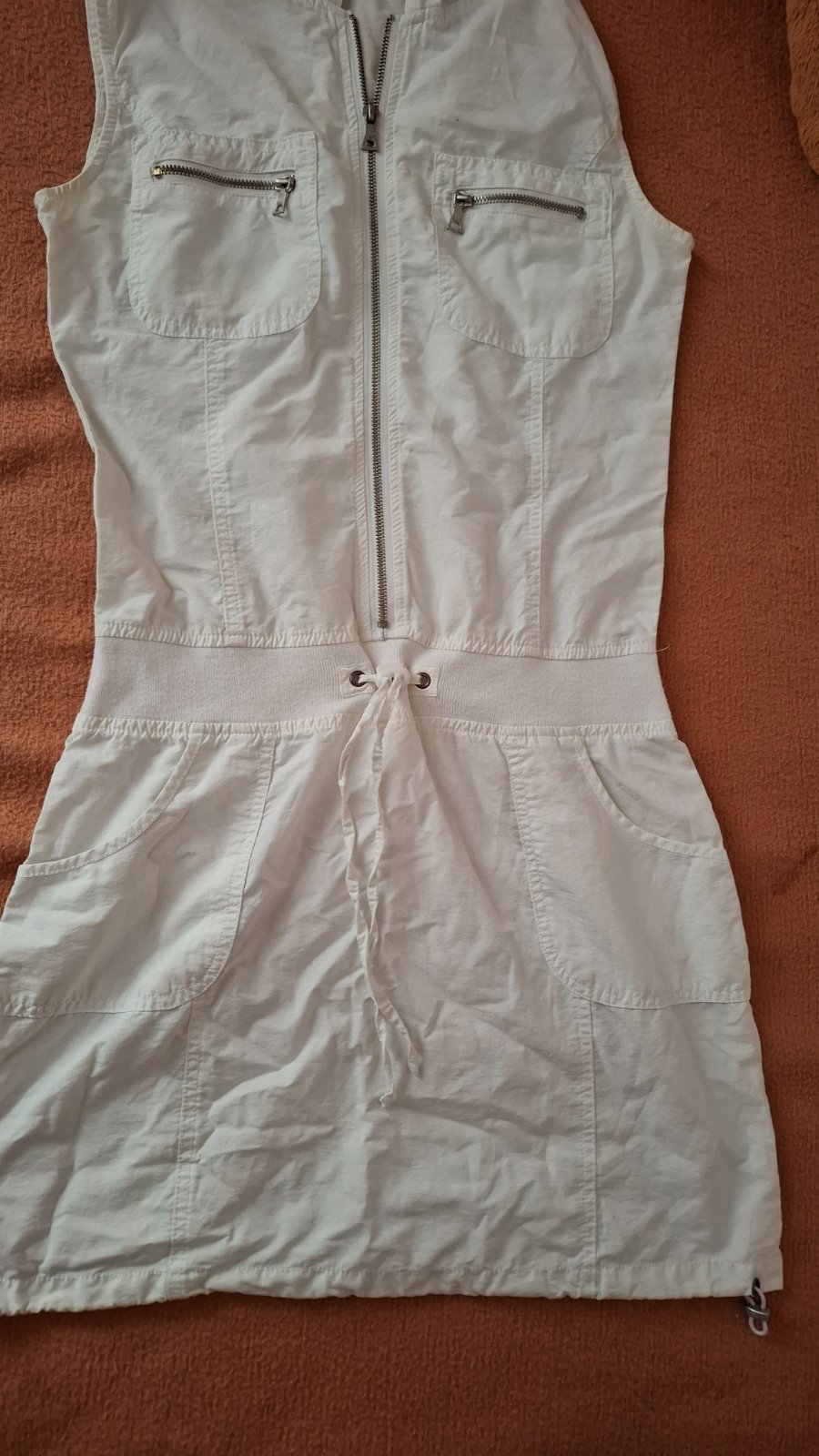 Dámske biele šaty. Dĺžka 90 cm, v páse nastaviteľné na gumičku cca 80-90 cm. Zapína ie na zips. Veľmi dobrý stav.