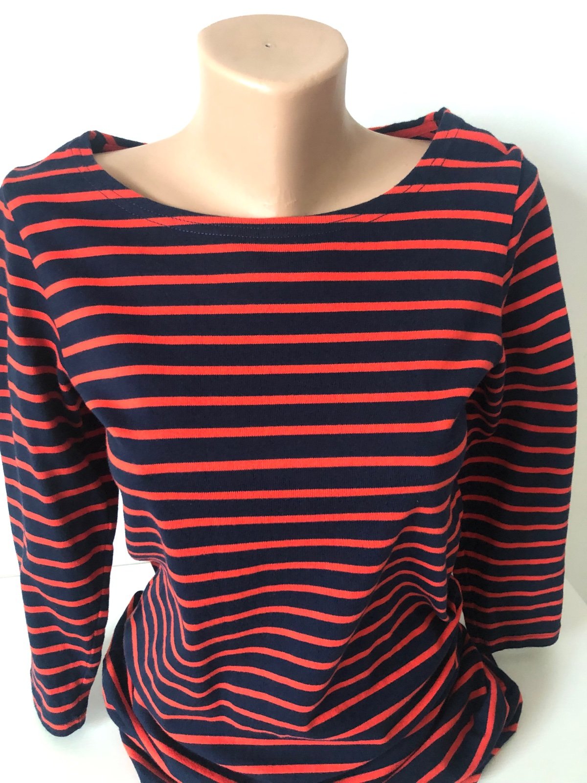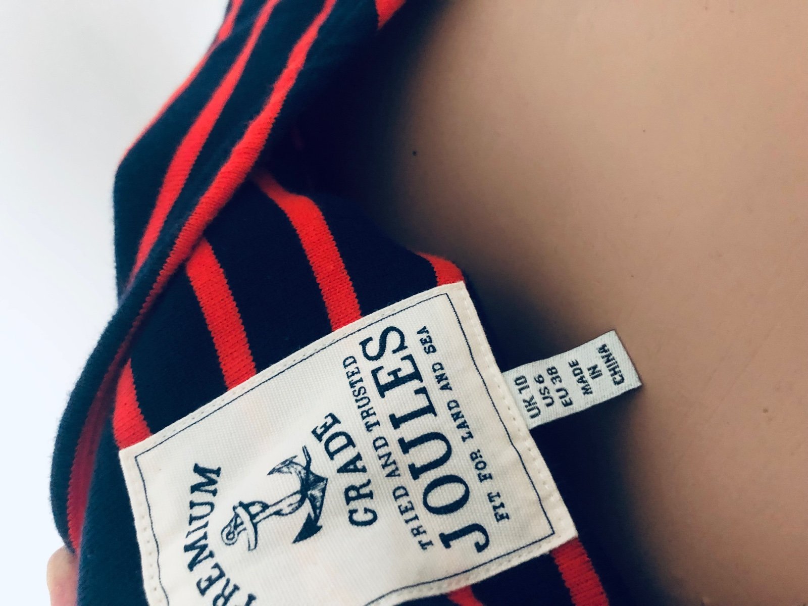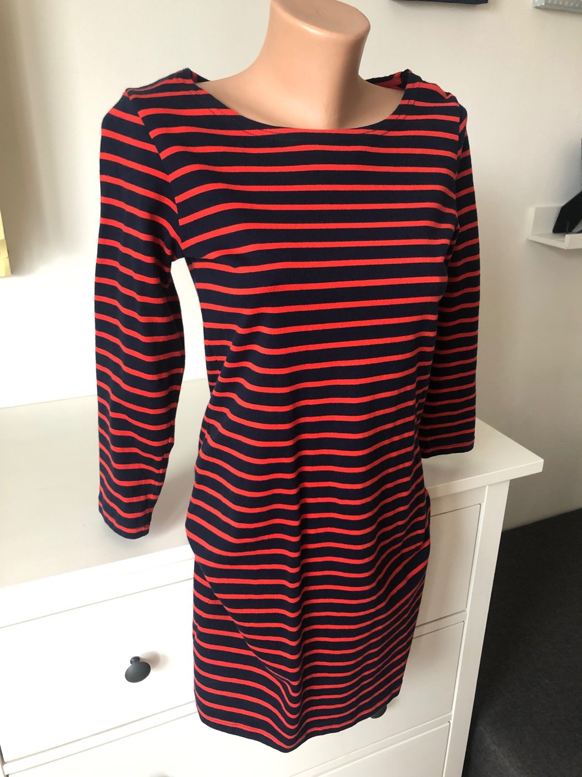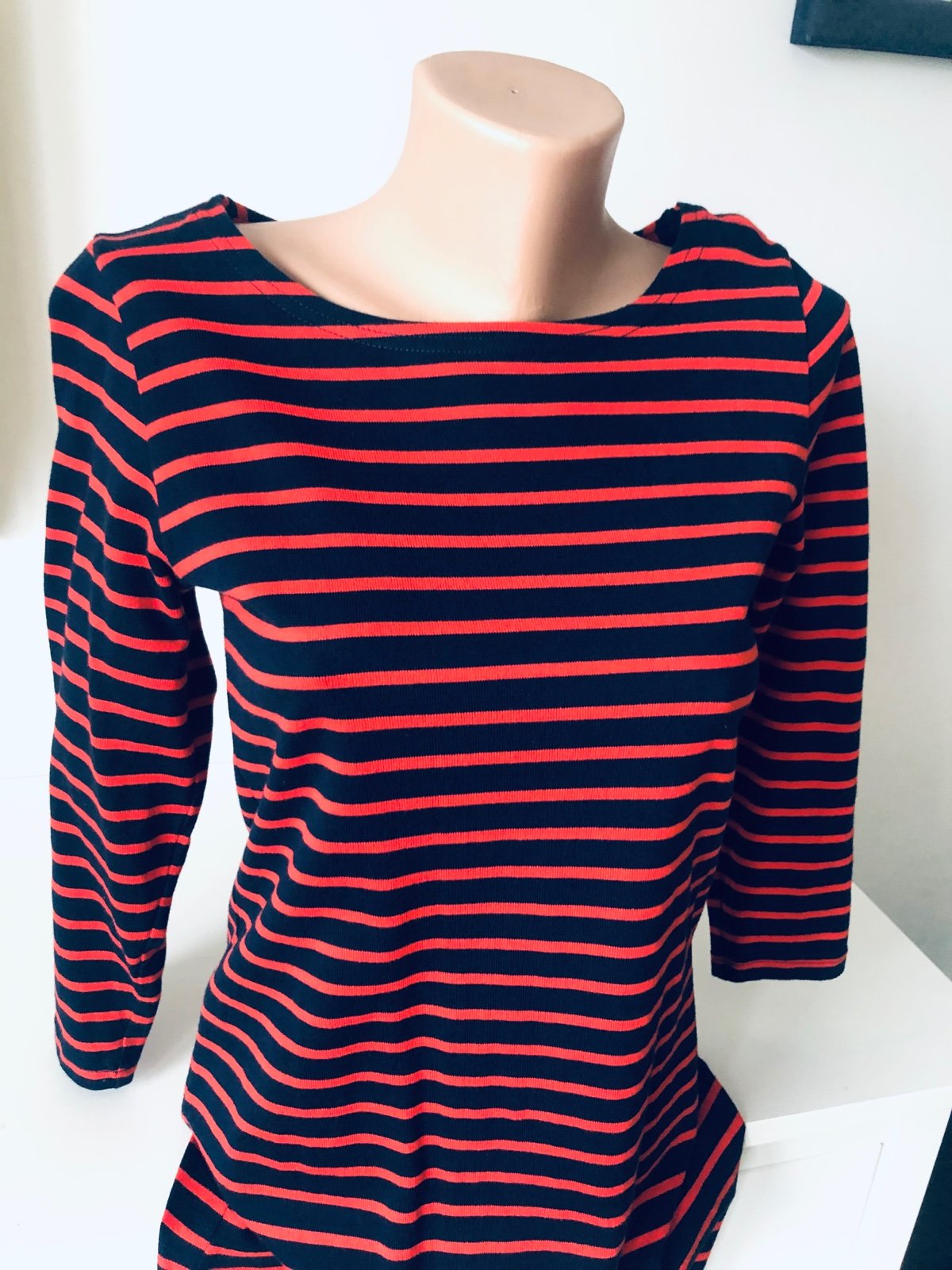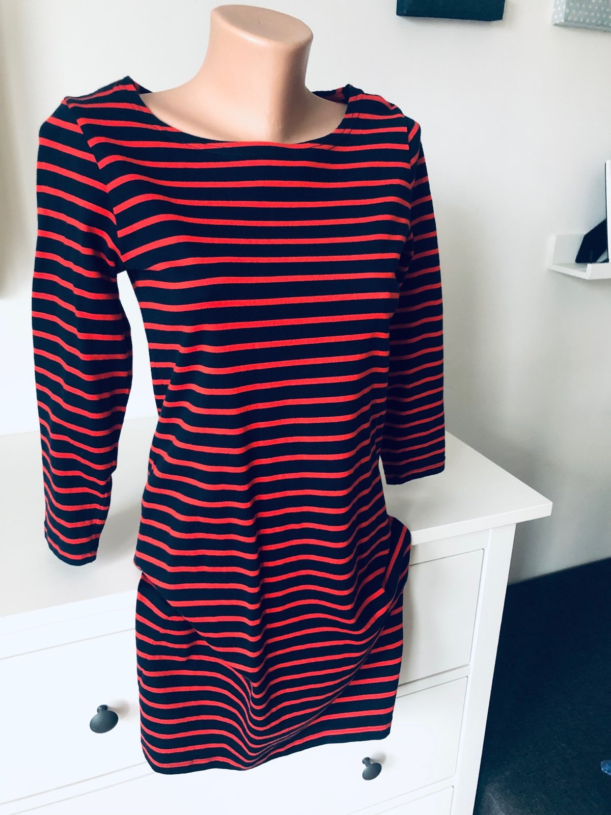 Ponúkam na predaj tieto nádherné džerzejové šaty od prémiovej britskej značky Joules. Ide o absolútnu klasiku, ktorá kombinuje tmavomodrú (navy) s výraznou červenou, čo vytvára svieži a neprehliadnuteľný námornícky vzhľad.