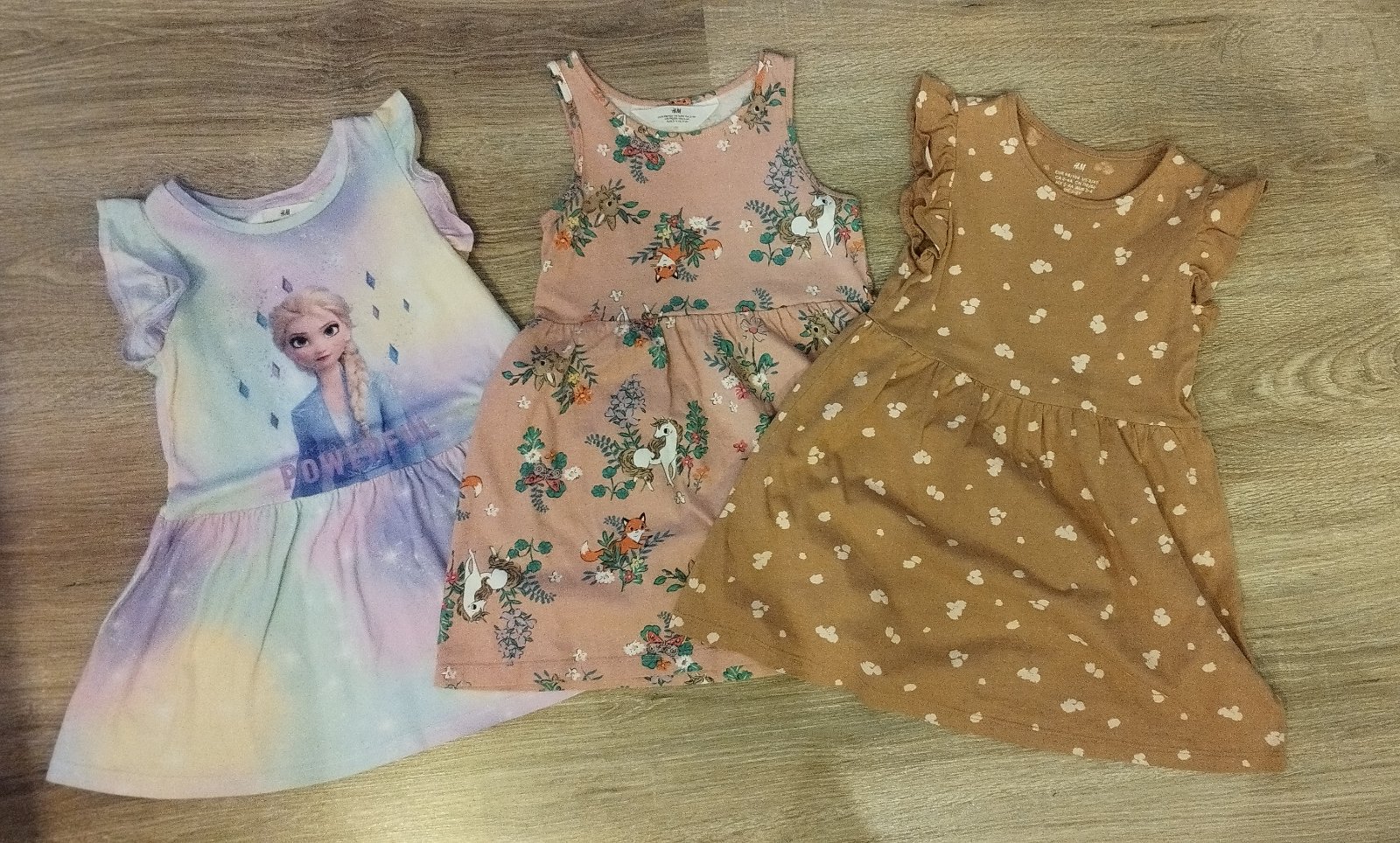 Pekné šatky. Nosene no bez poškodeni. Na motylovych uvedena velkost 4-6 rokov ale su užšie. Nosili sme od 2 rokov. Cena spolu s poštou