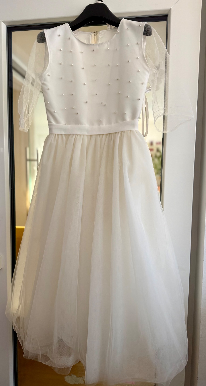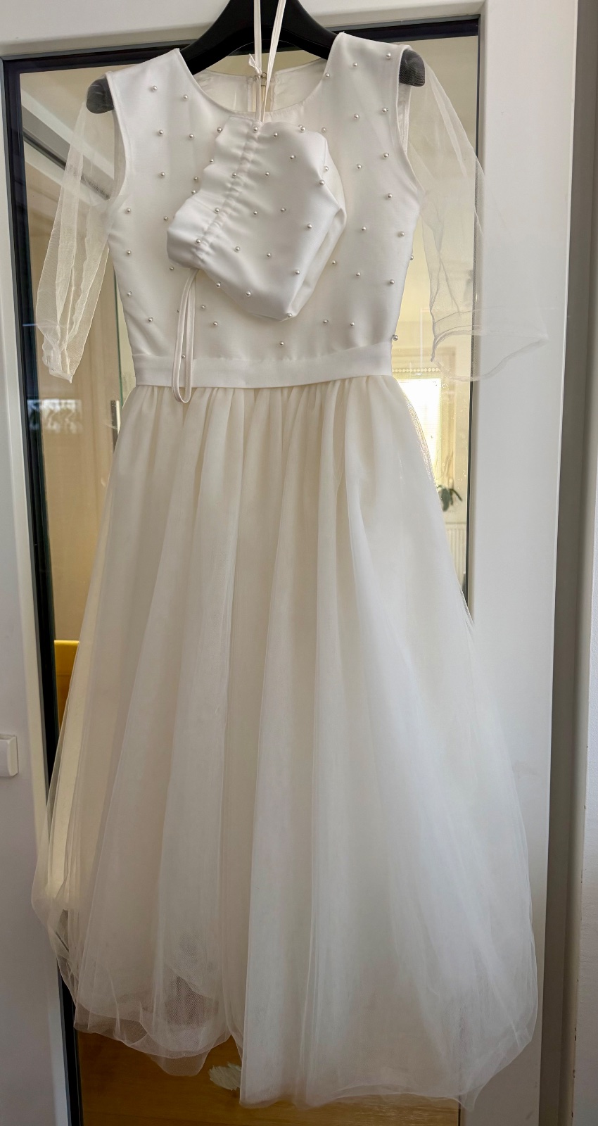 Predam krasne tylove saty na prve svate prijimanie alebo na svadbu, perlickovy vrsok, vzadu zapinanie na skryty zips a gombicek. Bohata tylova sukna pekne drzi tvar. Sucastou je aj kabelka-vrecusko s perlickami. Dlzka cca109cm, pas cca 34cm, sirka pod pazuskami cca 40cm