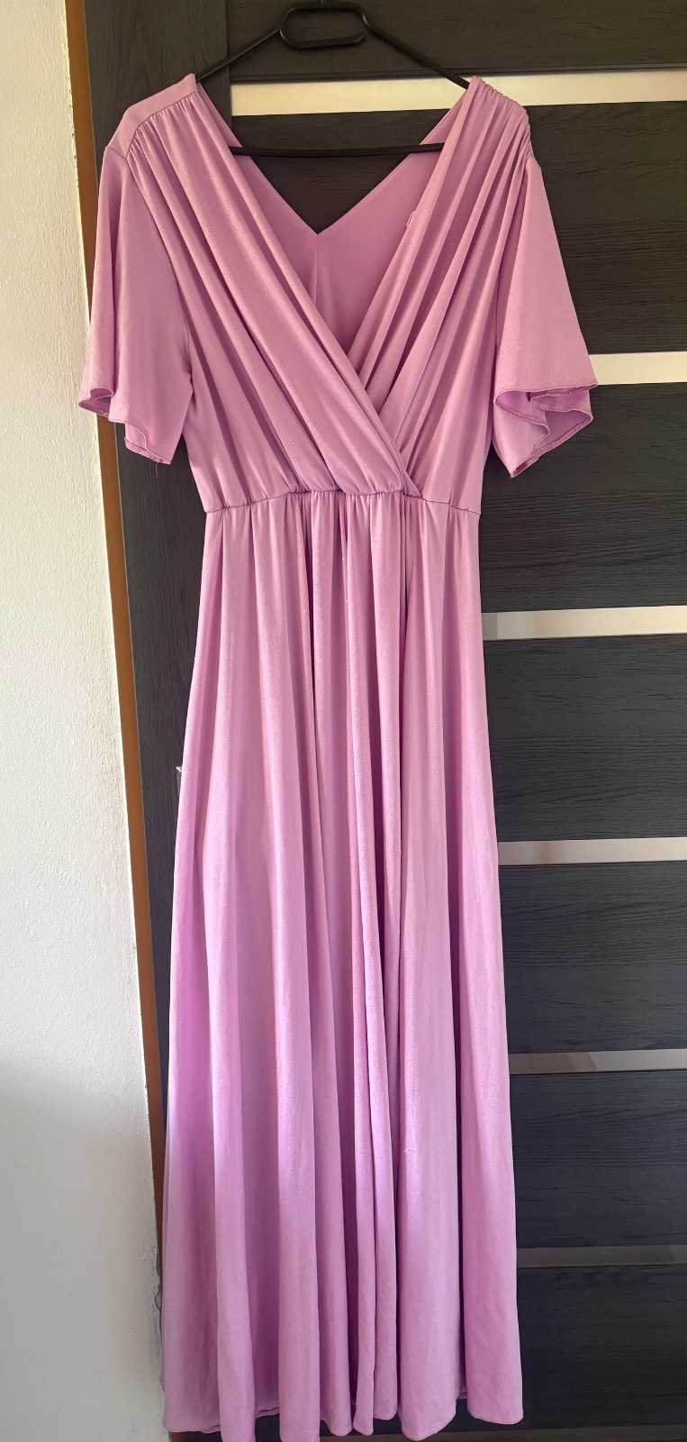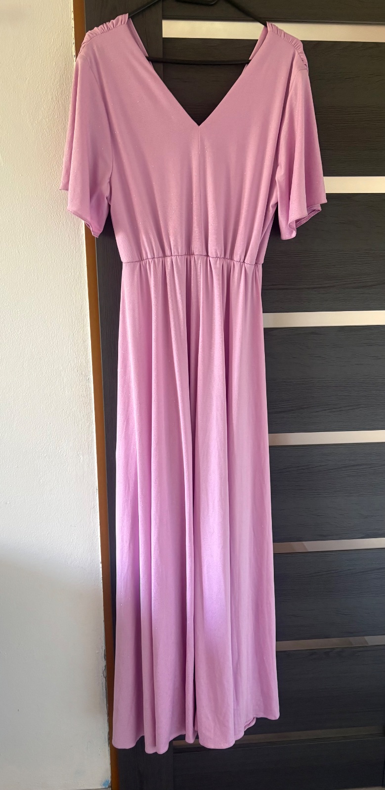Romantické, nežné a elegantné. Fialovoružové s trblietkami. Navyše sa o pohodlný krok pri tanci postará voľná sukňa a rozparok. Materiál šiat je elastický a v páse majú gumičku.Zakryjú všetko potrebné, sadnú v pohode aj na L aj XXL s gumou, a v prsiach je miesto. Šaty majú trblietky, sem tam opadávajú.
