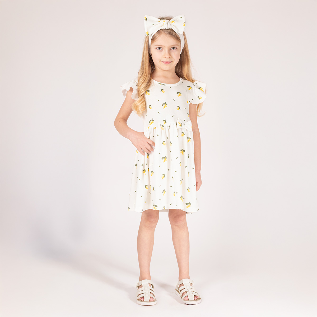 Tieto rozkošné dievčenské šaty s krátkym rukávom sú ideálnou voľbou na letné dni. Vyrobené z mäkkej a priedušnej bavlny, poskytujú maximálne pohodlie počas celého dňa. Maslový podklad je ozdobený jemným vzorom citrónikov, ktorý dodáva svieži a hravý vzhľad. Šaty majú volánikové rukávy a mierne nariasenú sukňu pre dievčenský šmrnc.