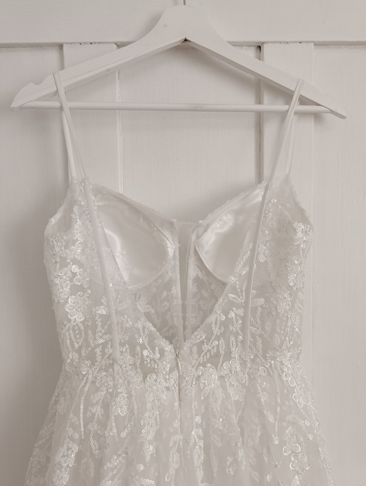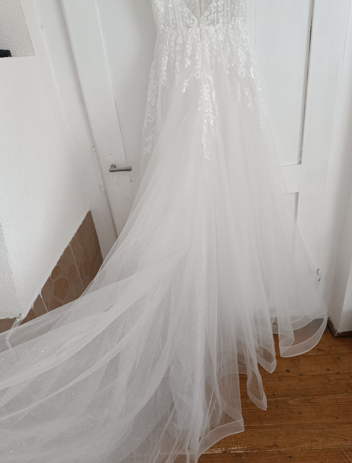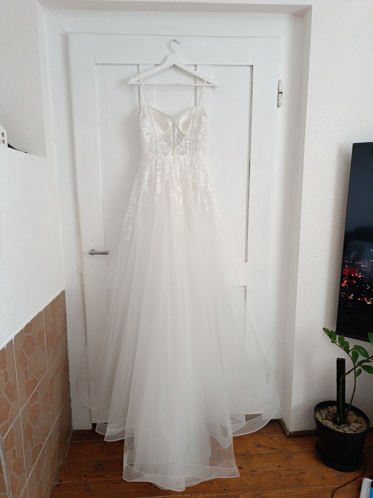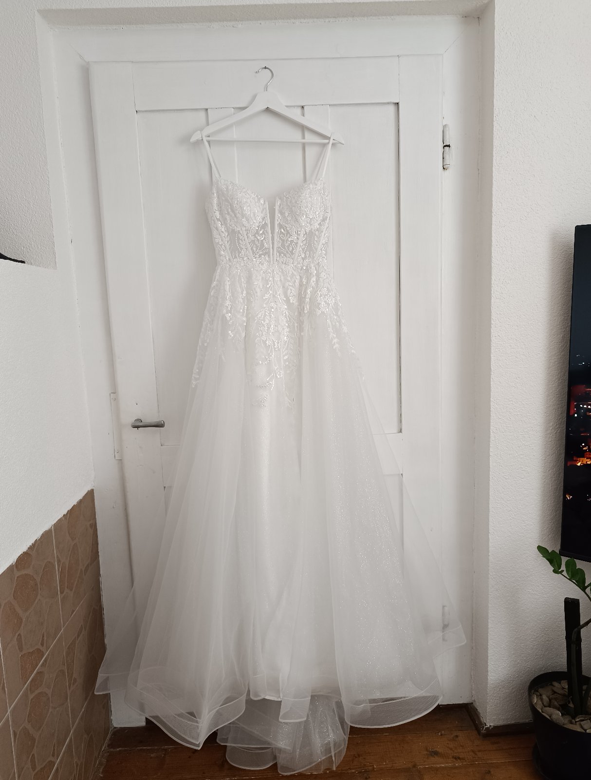 Svadobné šaty, neboli nakoniec oblečené, veľkosť uvedená M, upravené na S (zúžený pás).