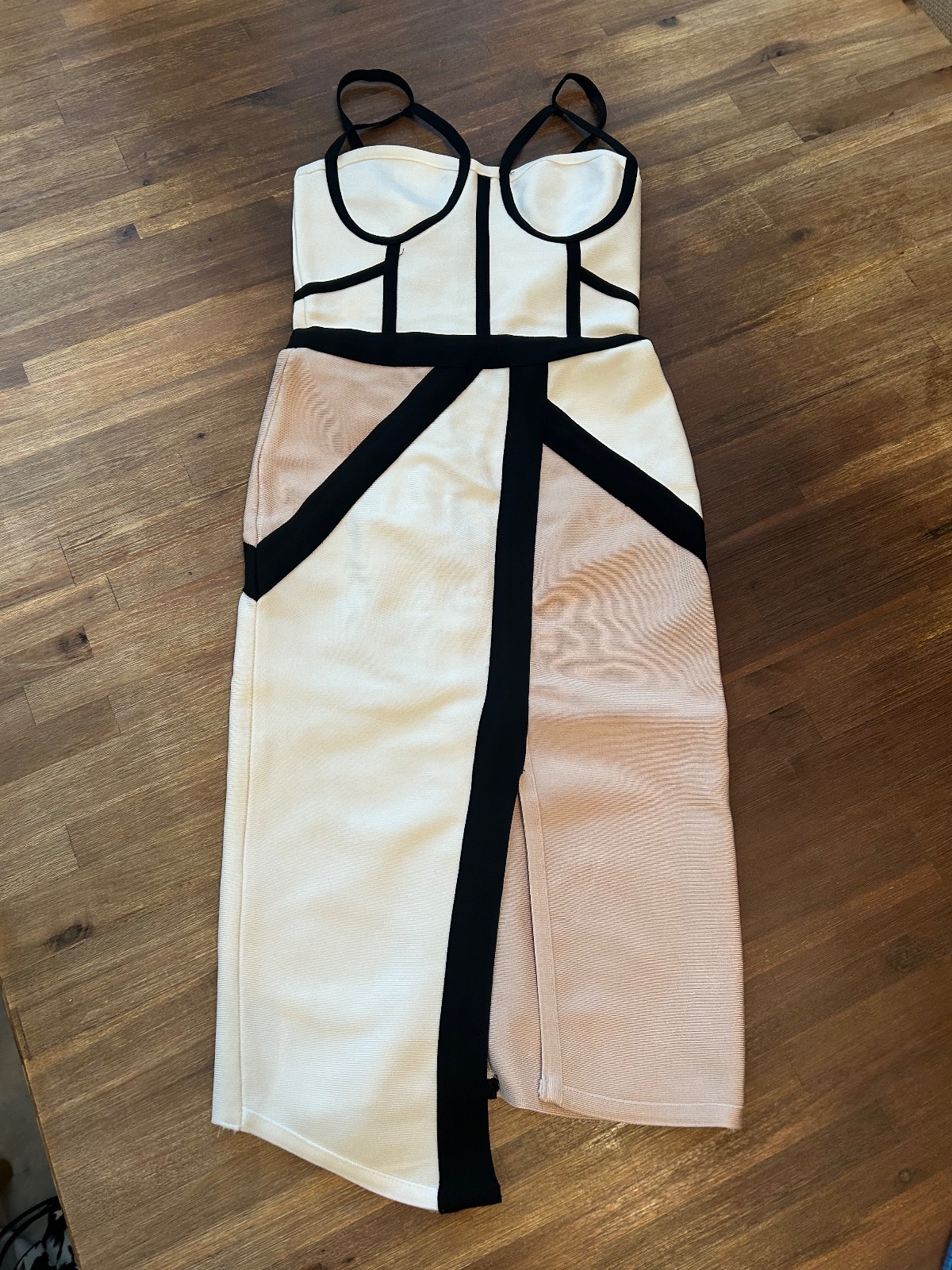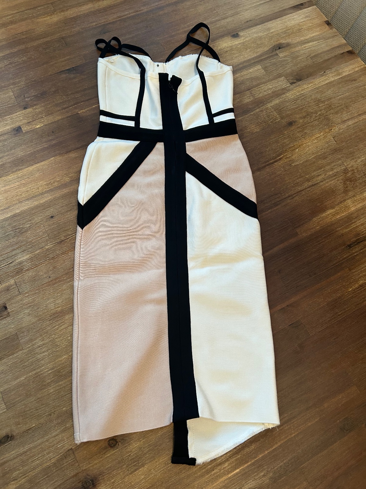 Sťahujúce bandážové šaty , tip stav , raz oblečené .