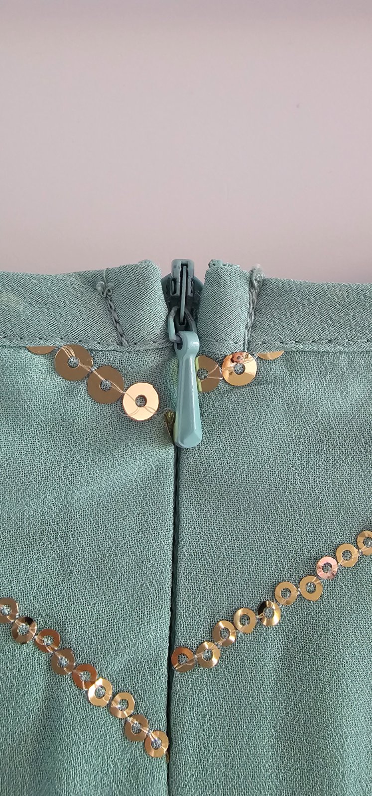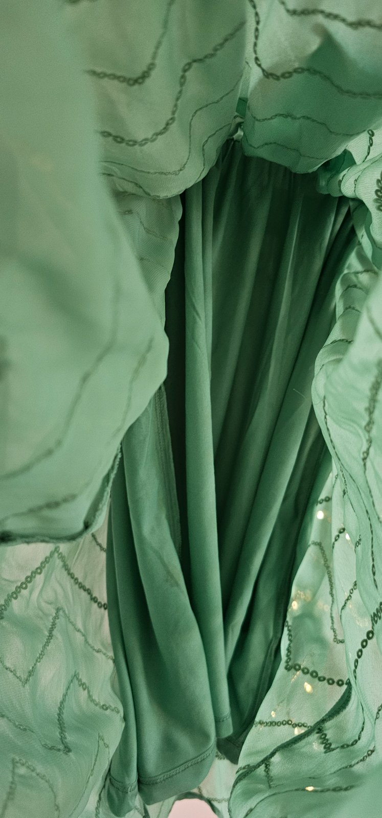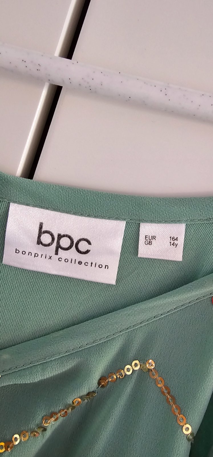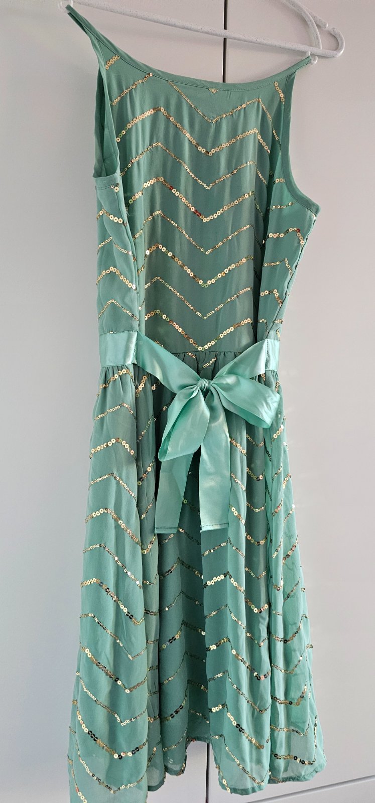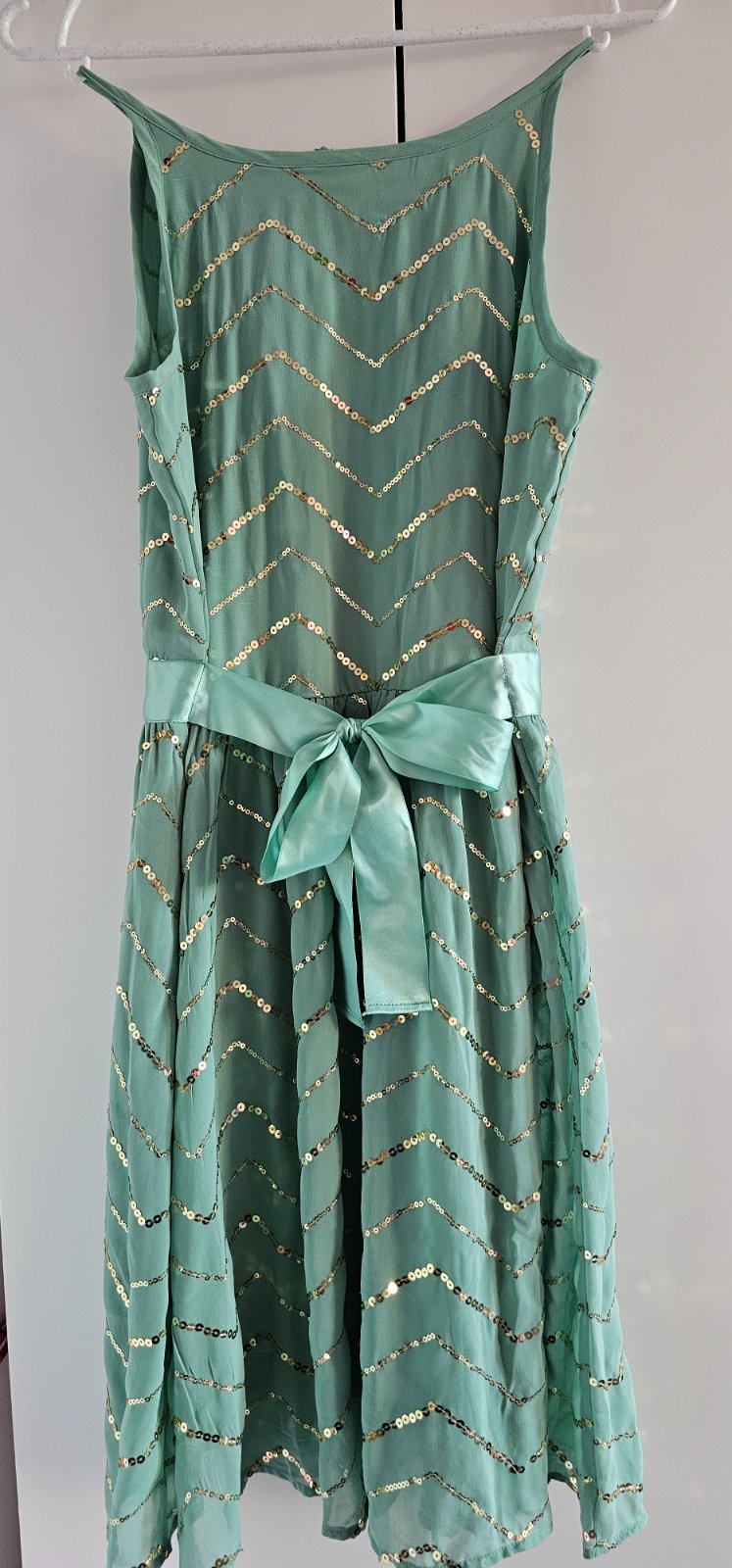Krásne letné šaty s trblietkami. Pri dlhšom nosení odporúčam bolerko alebo svetrík, lebo tie trblietky trošku škriabu. Veľkosť na štítku 164 ale v skutočnosti menšie. Odhadujem 158.