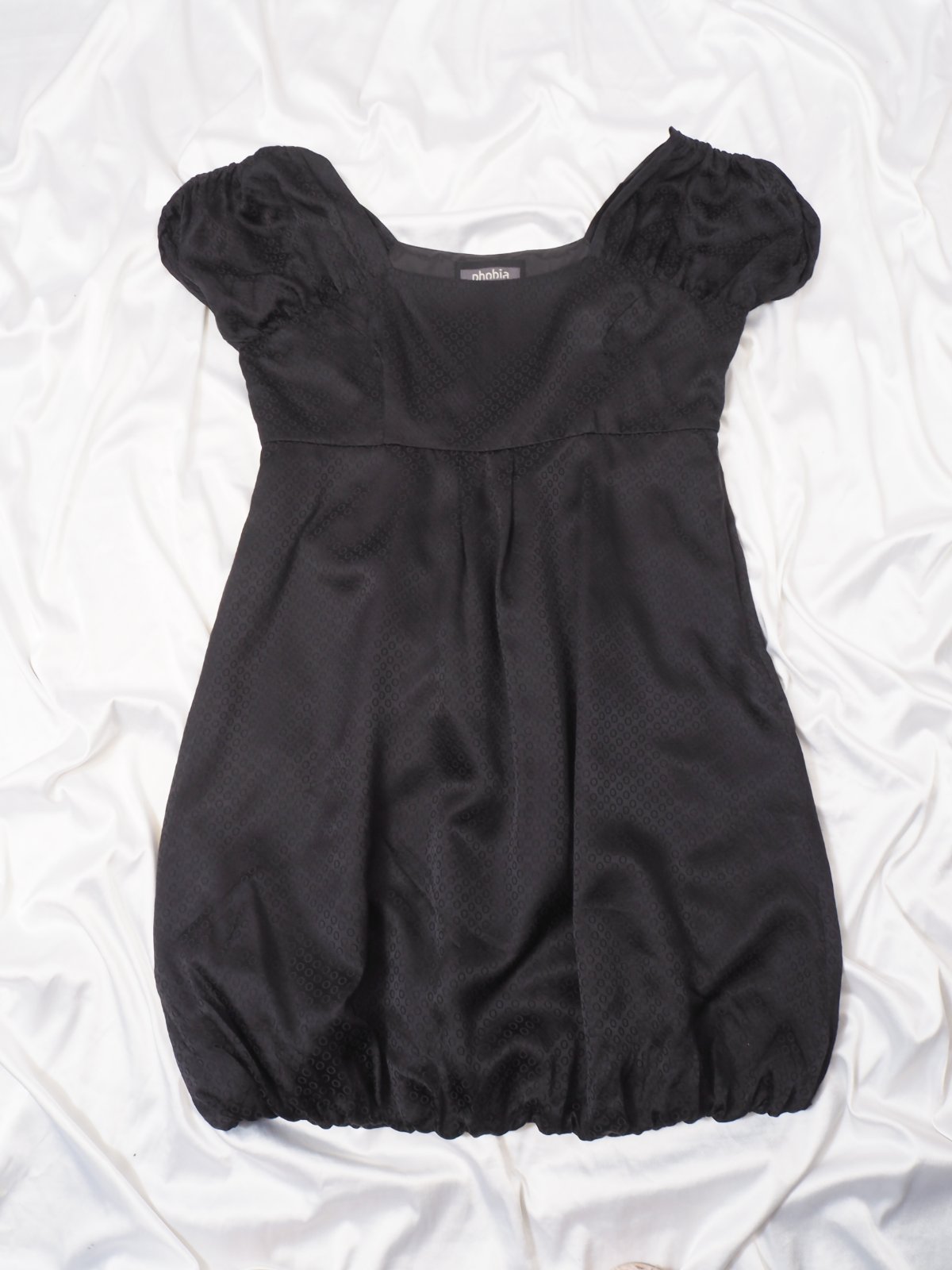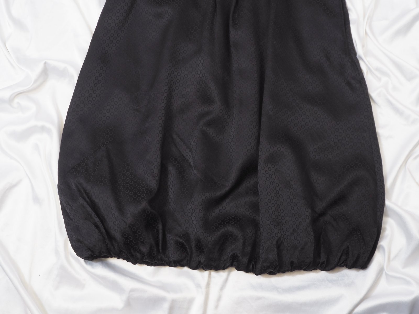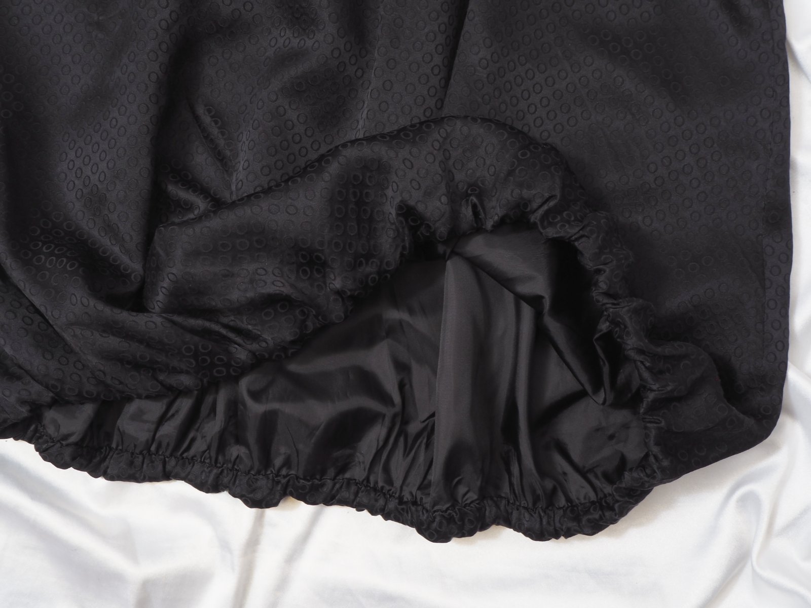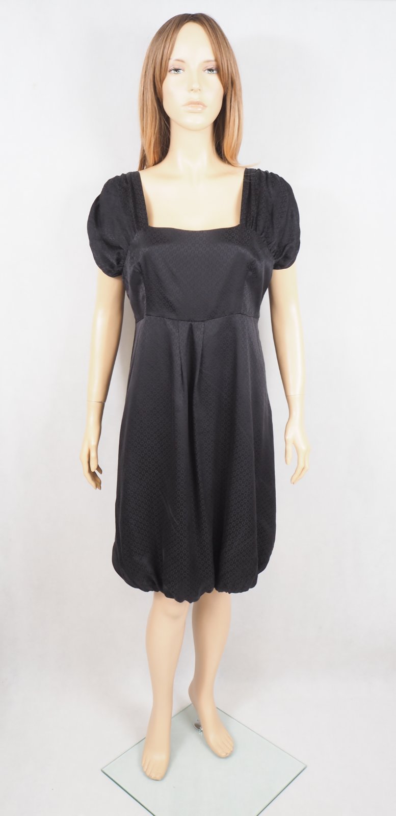 Luxusné hodvábne šaty čierneje farby s potlačou, bočný zips, nariasené rukávy, puf efekt na spodku, materiál 100% hodváb, super stav.