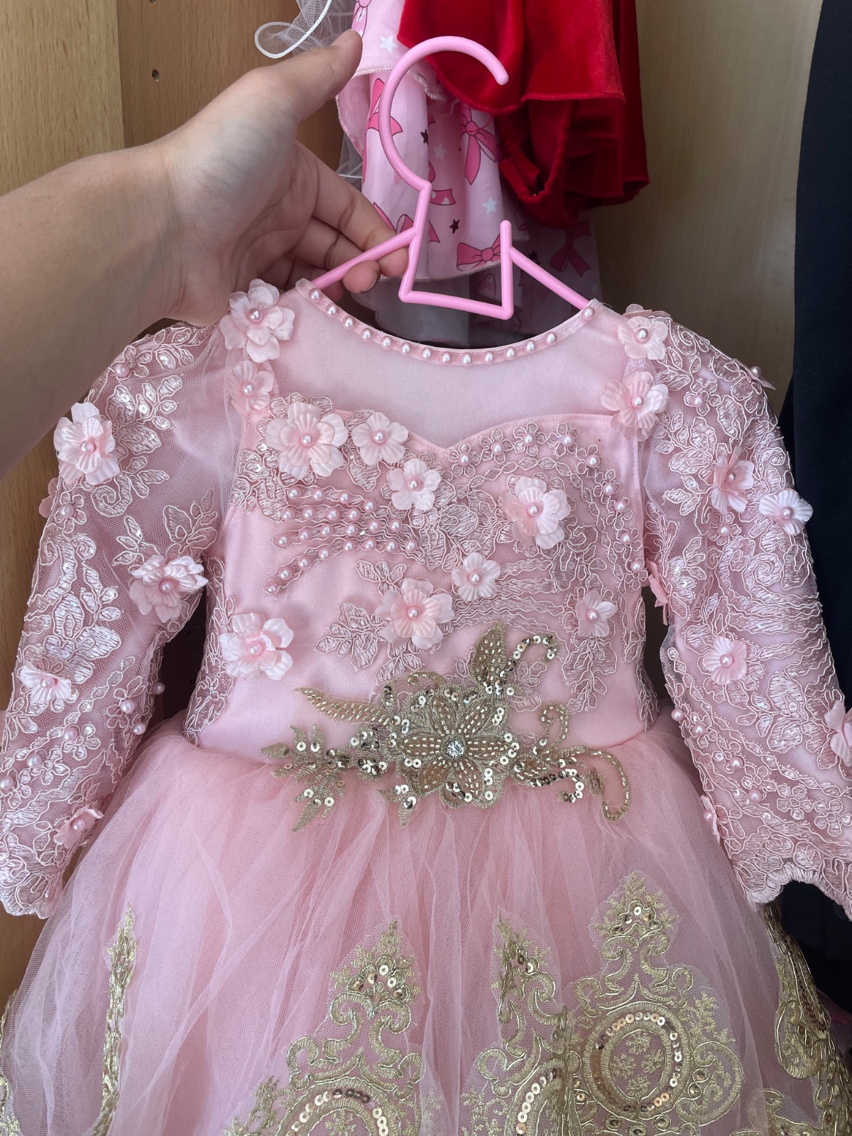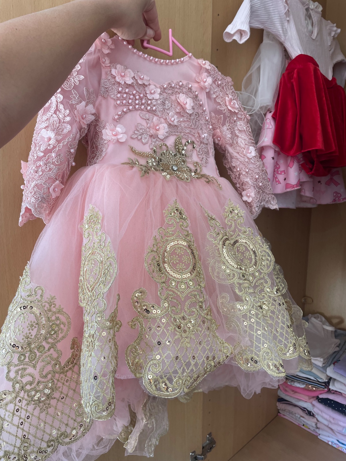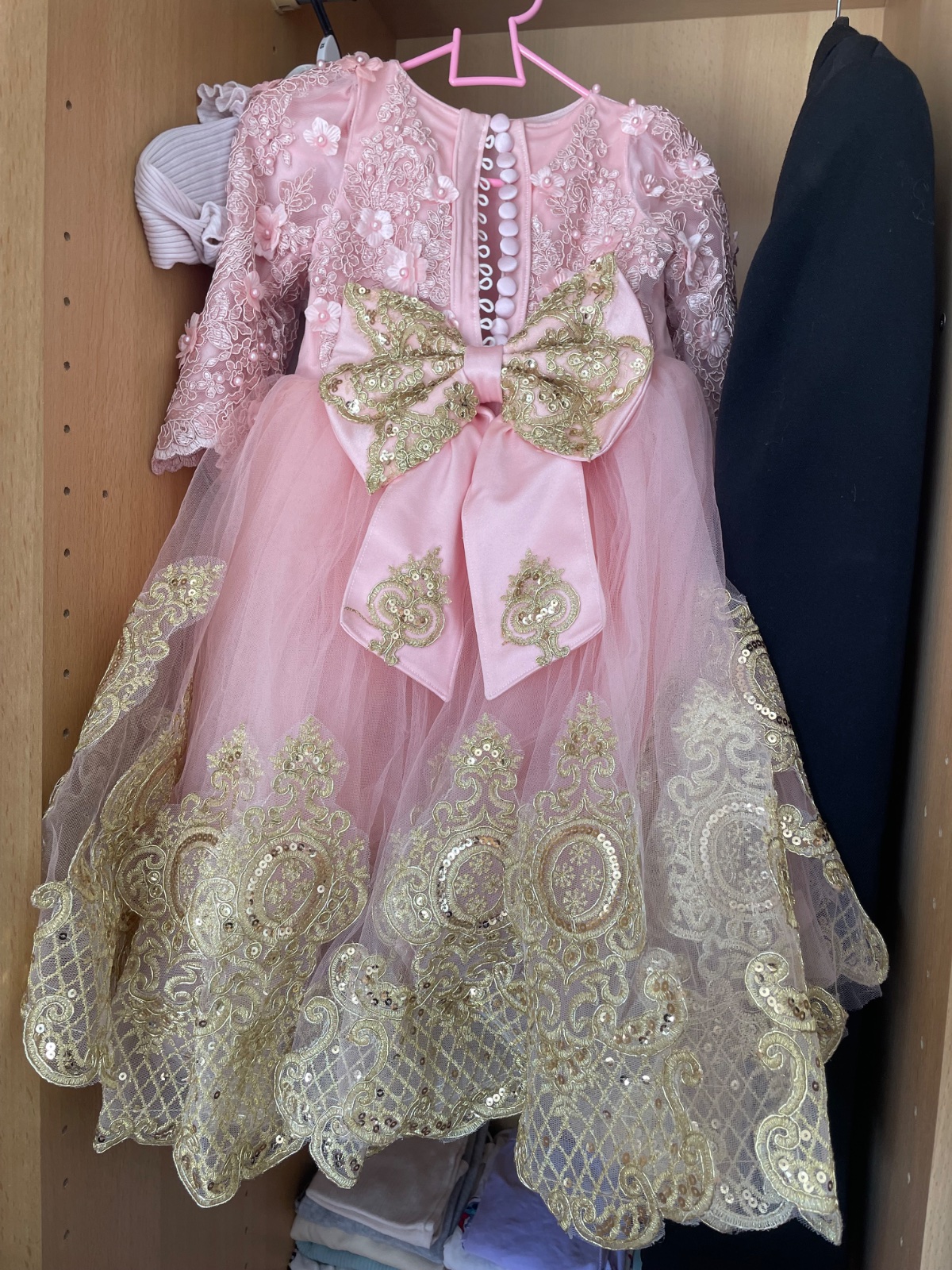 Dobrý den predam krasne dievčenské saty šité na mieru podľa môjho želania. Saty boly oblečené len raz. Sú vhodne na svadby/narodeniny/fotenie. Rozmery Predná sukňa ma 30cm