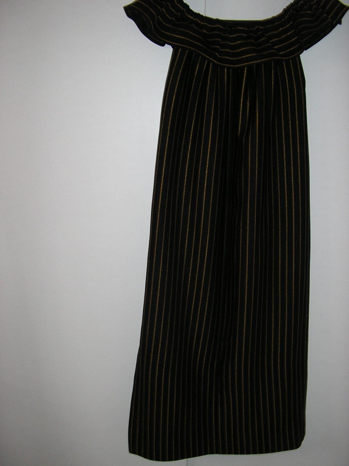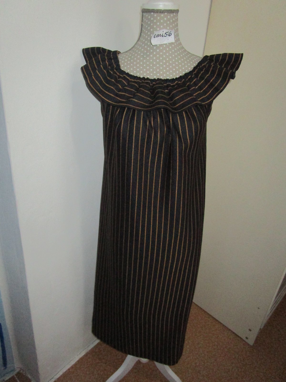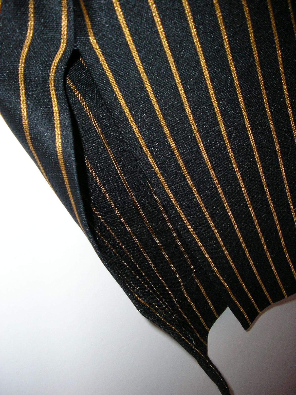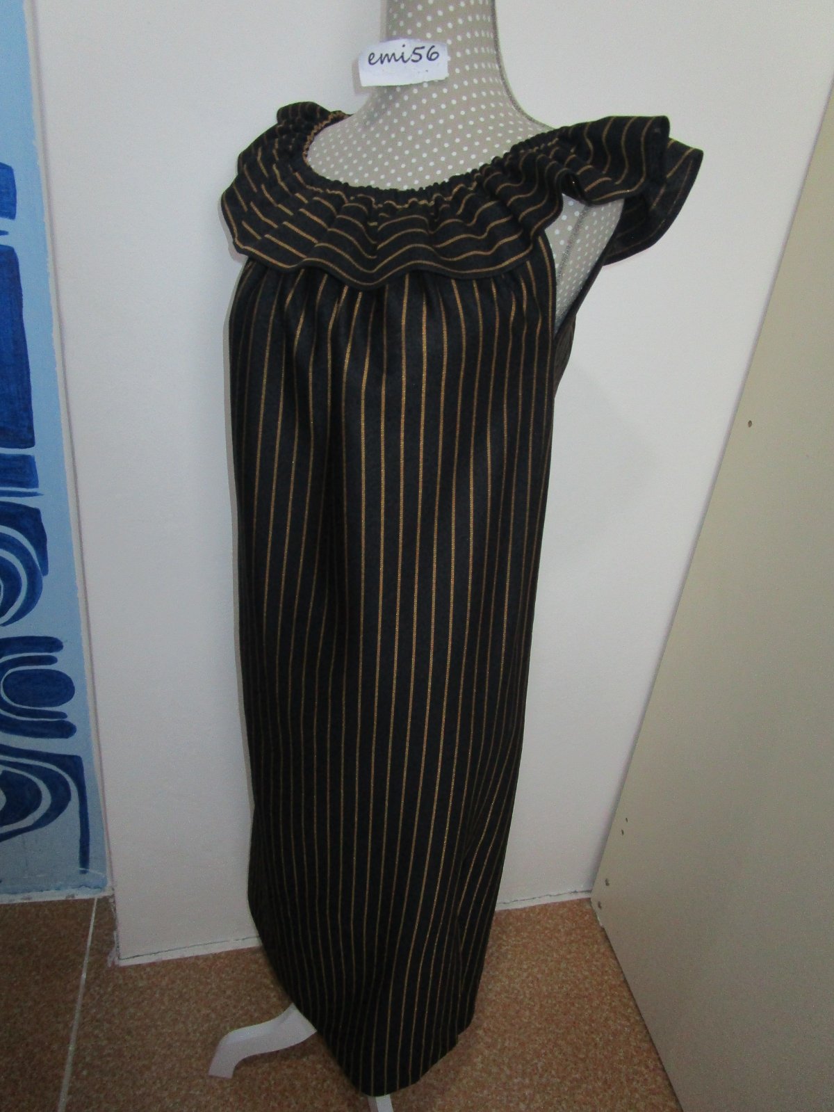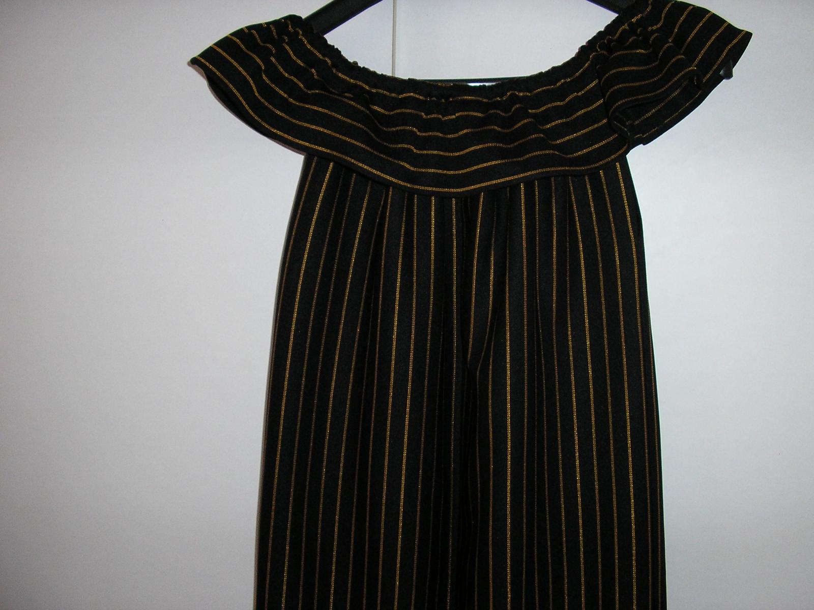 Šaty sú rovného strihu, na boku – rozparok. Jedinou ozdobou je nazbieraný 9 cm volánik okolo výstrihu. Je možné nosiť aj ako znížene – voľné ramená. Nekrčivá kvalitná čierna látka so zlatými prúžkami. Šaty sú elegantné, zaujímavé, šité na mieru.