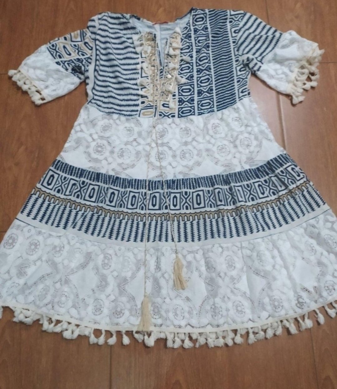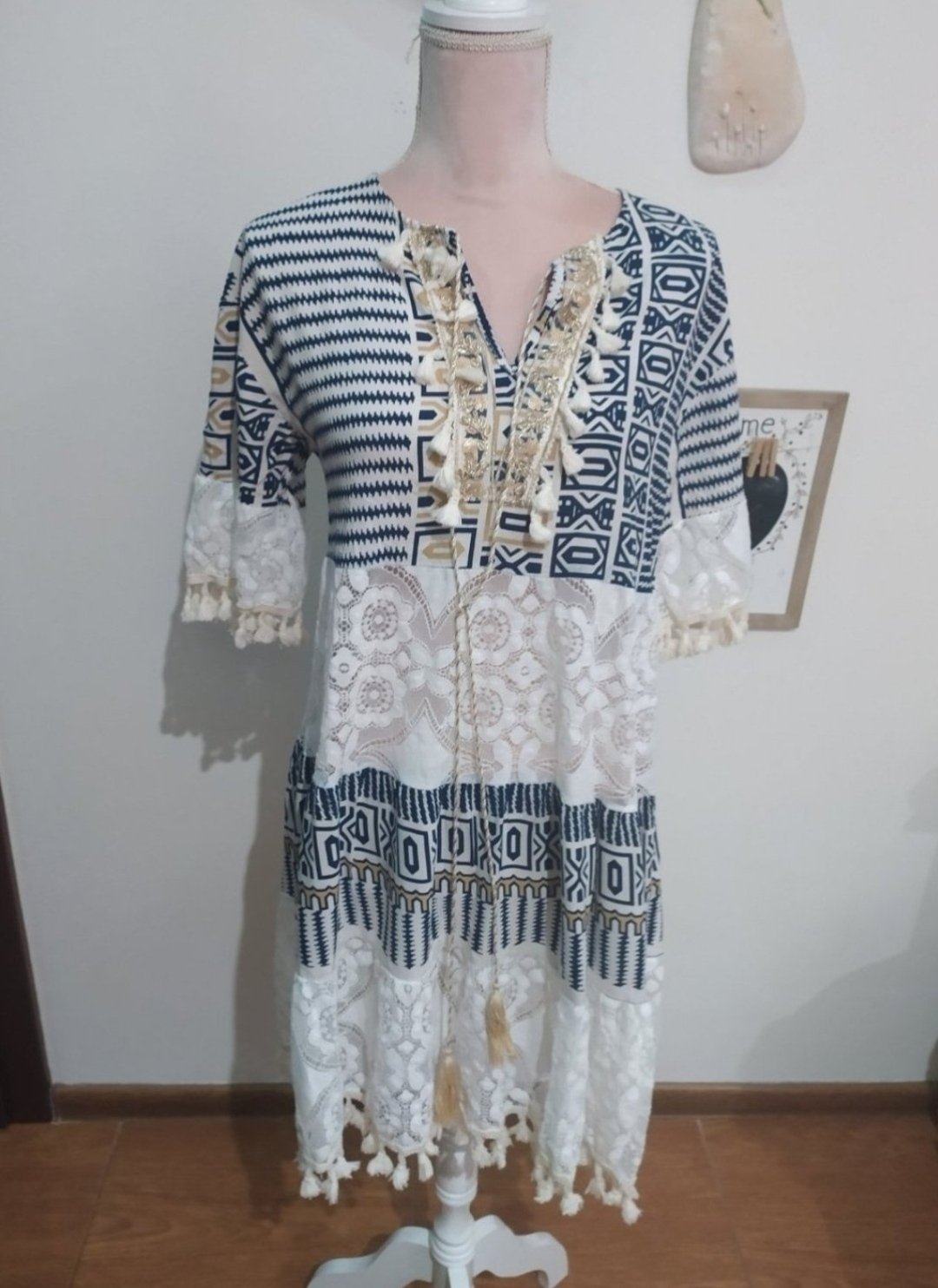 Predám šaty,látka kombinovaná s krajkou,farba krémová s tmavomodrou,zdobené strapcami,veľ Uni vhodné od S-L