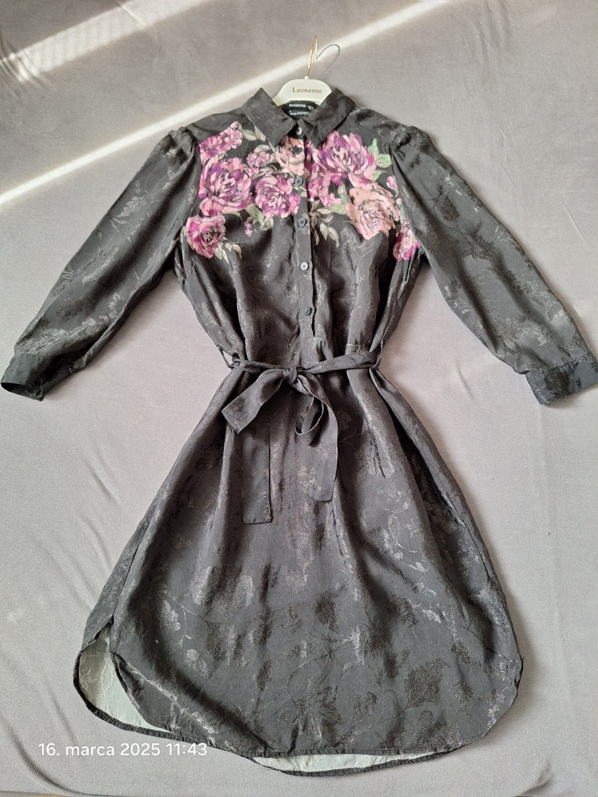 Predám čierne dámske šaty so zapínaním na gombíky a viazaním v páse. Látka, z ktorej sú ušité, pripomína kašmír.