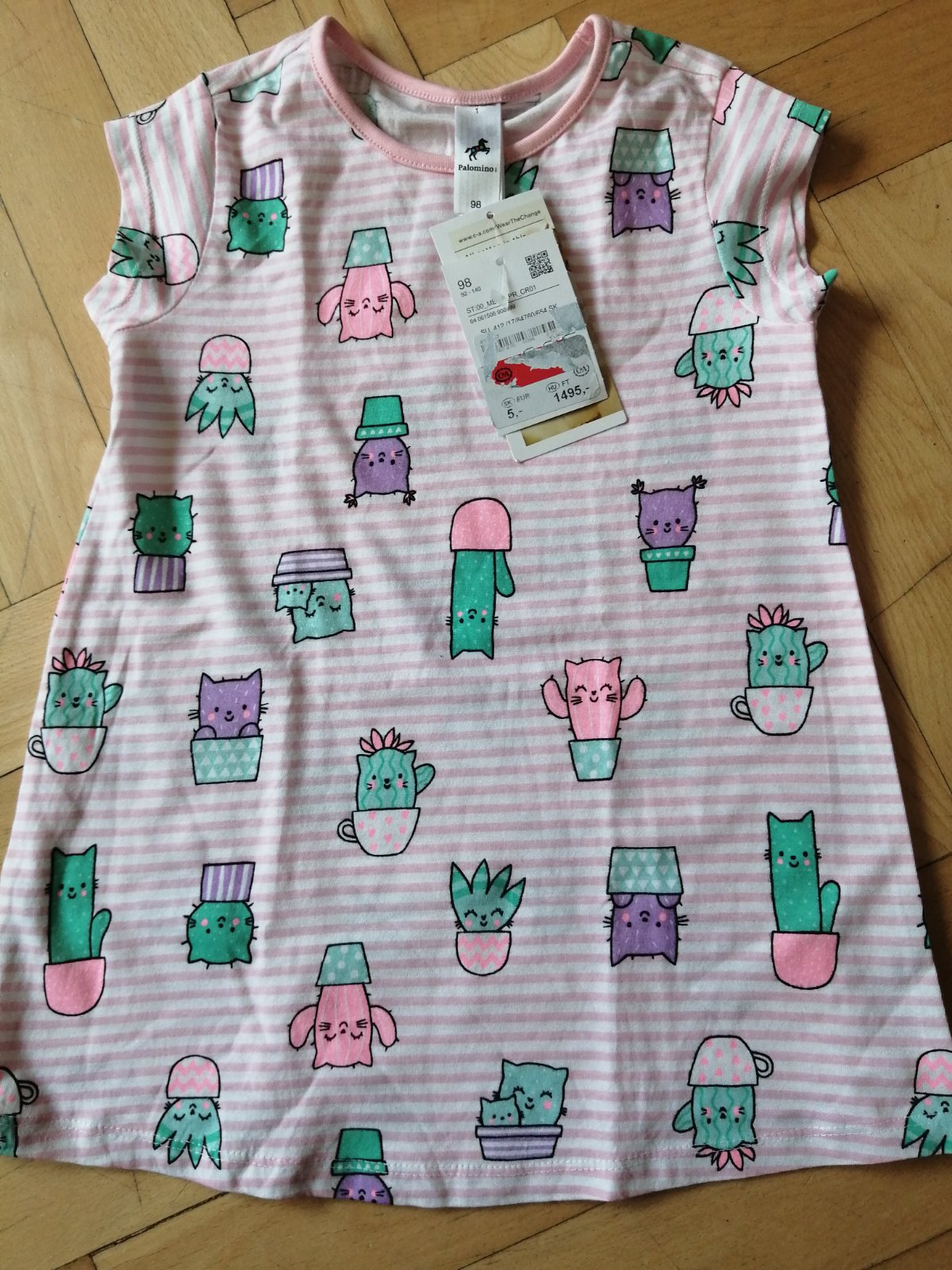 Nenosené detské tričko ci šatky. Vynositelne dlhšie, neskôr sa dá nosiť ako tričko. Píše až do 140, ale to je už asi prehnane😁. Inak sú veľmi pekné. Lahucky bavlnený materiál.