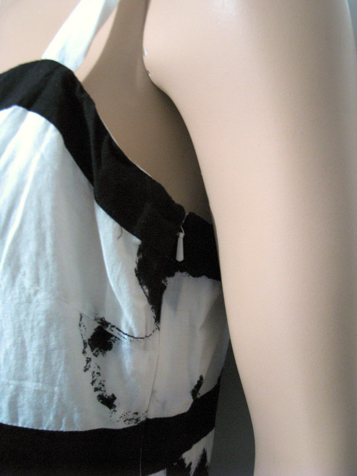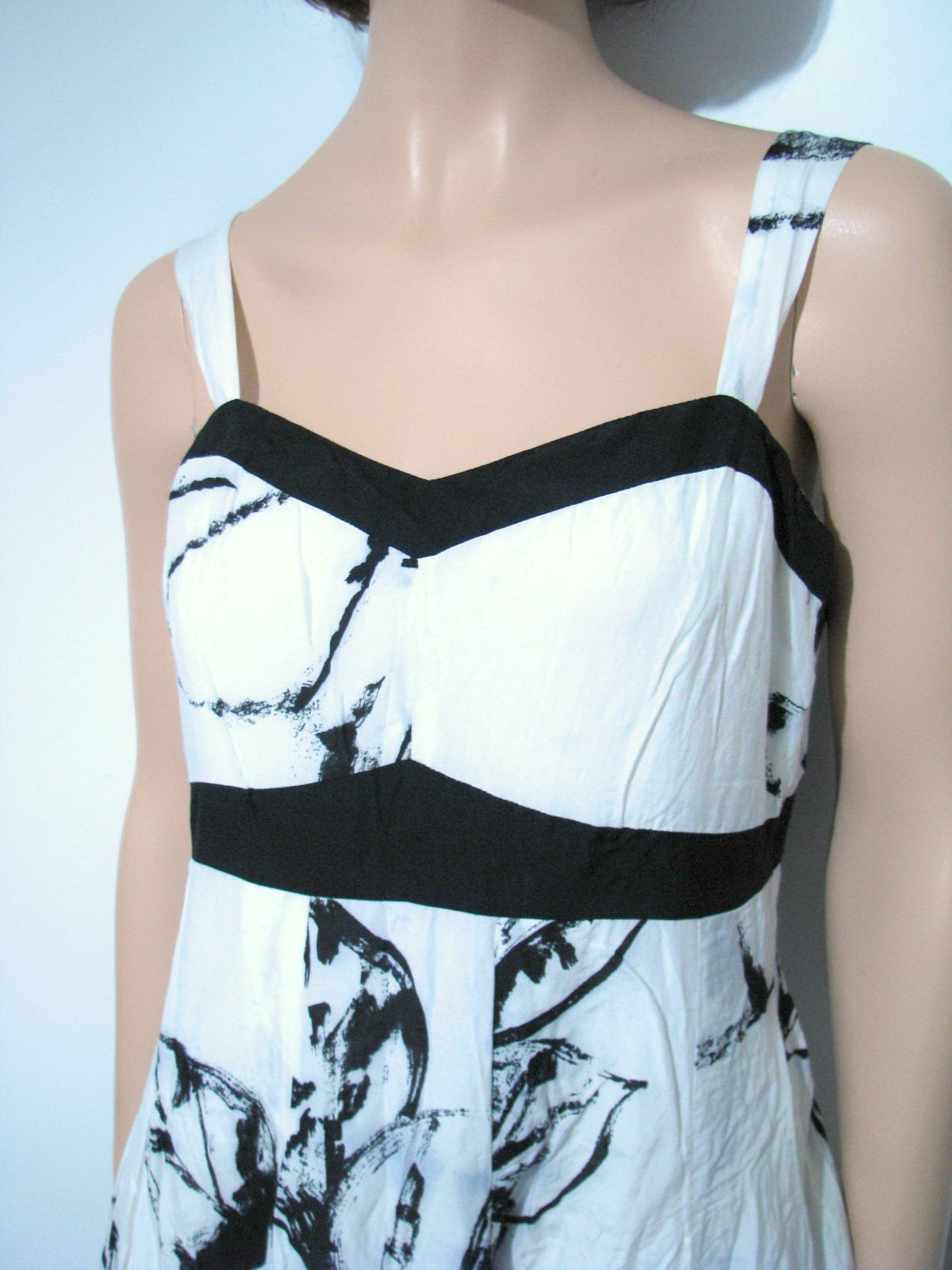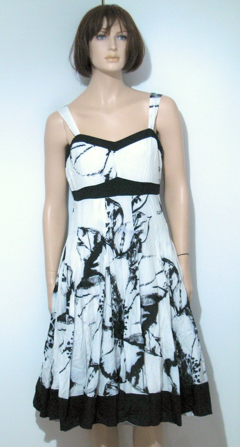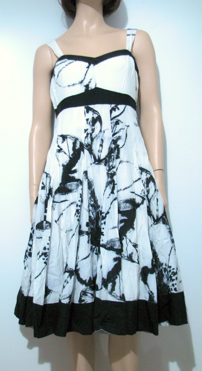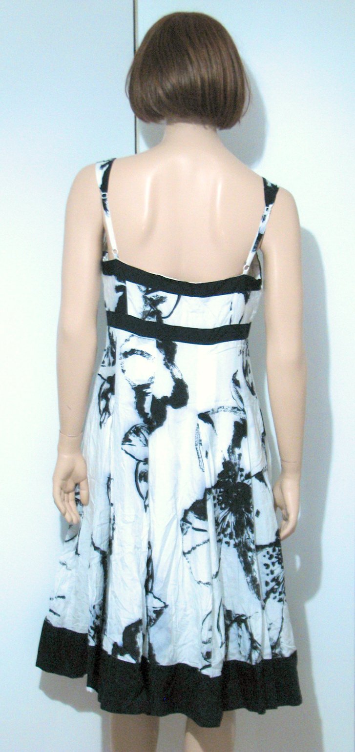 Čiernobiele kvetované letné šaty, s veľkou rozvlatou sukňou, ktorá sa pekne točí :) Vhodné na nejakú spoločenskú príležitosť, napr. na svadbu. Materiál 70% bavlna, 30% hodváb, acetátová podšívka. Sú výborne zachovalé, bez poškodení. Píše na nich, že sa nemajú prať, no vyprala som ich, sú pokrčené, no nemyslím, že by mal byť problém ich vyžehliť. Veľkosť je uvedená 14, čo zodpovedá 42, myslím, že sadnú skôr na 40. V prípade záujmu premeriam.