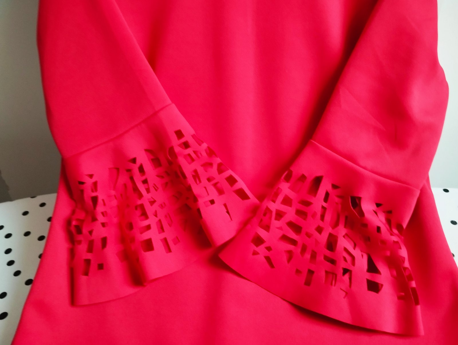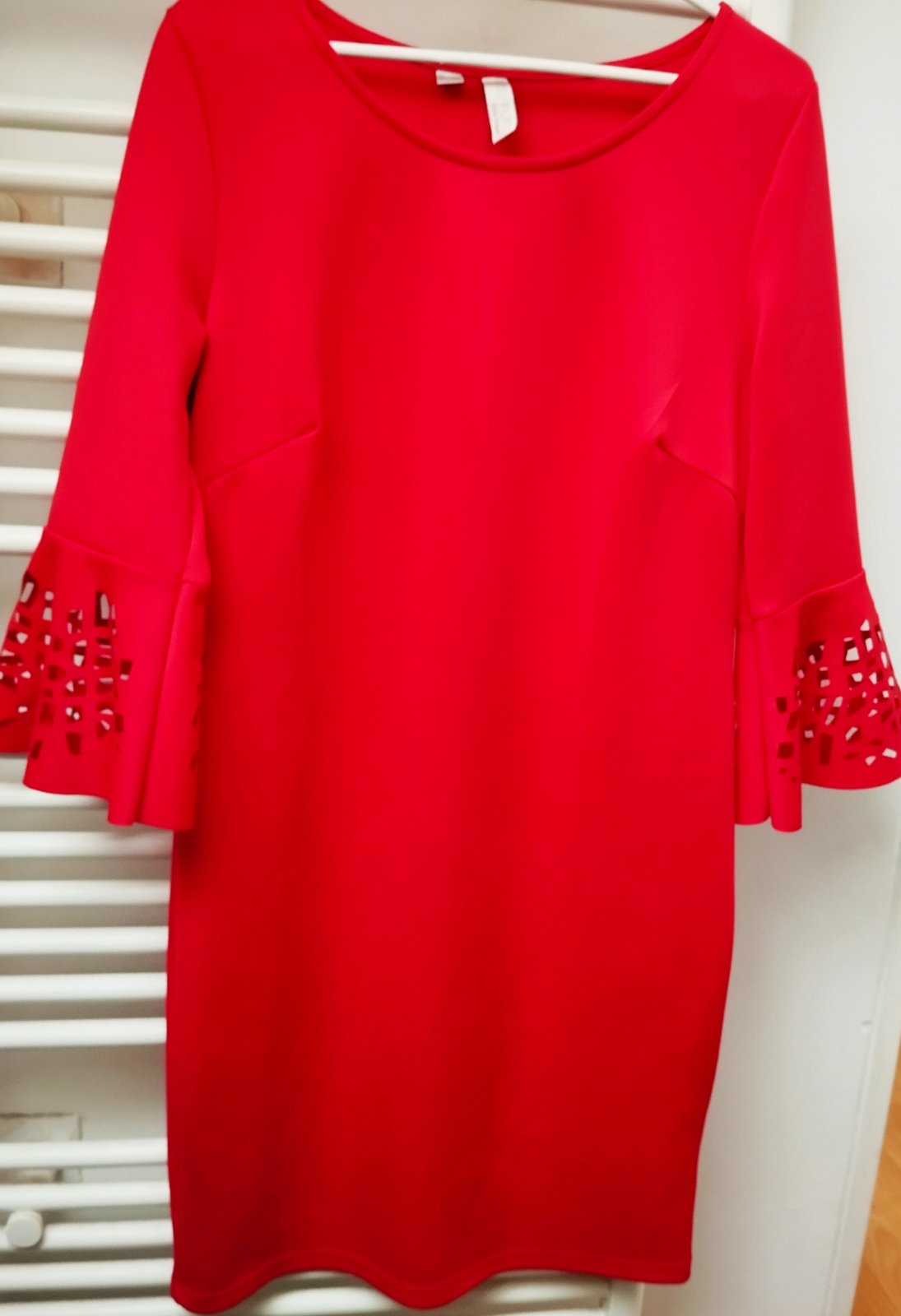 Jeden krát oblečené. Nekrčivé šaty nad kolená. Ozdobné rukávy zvonovité. jemné lesklé.