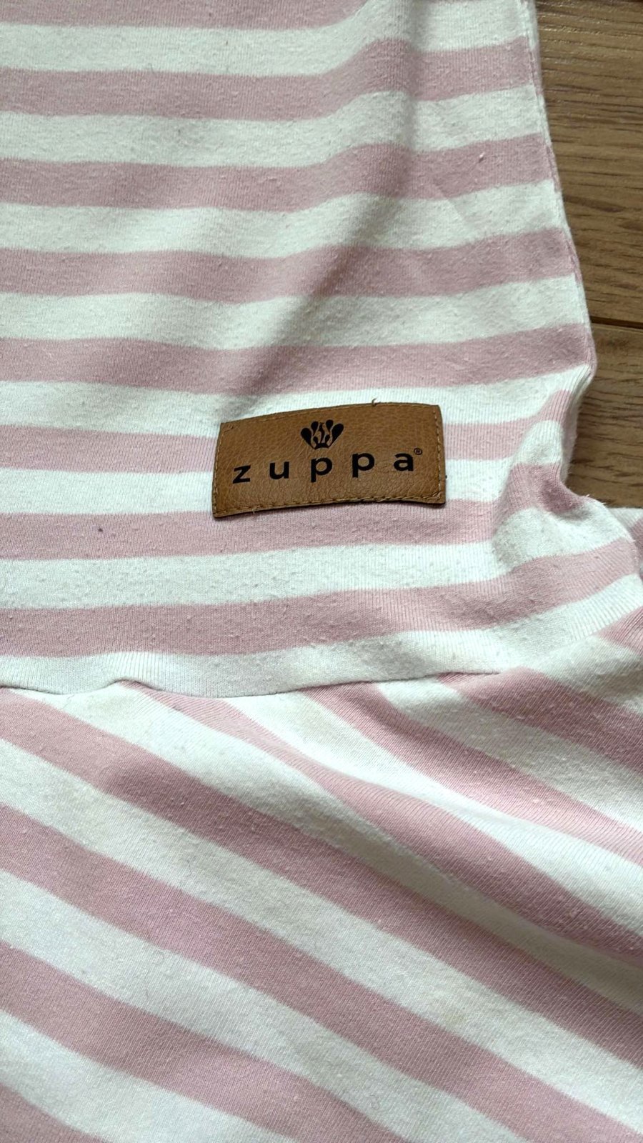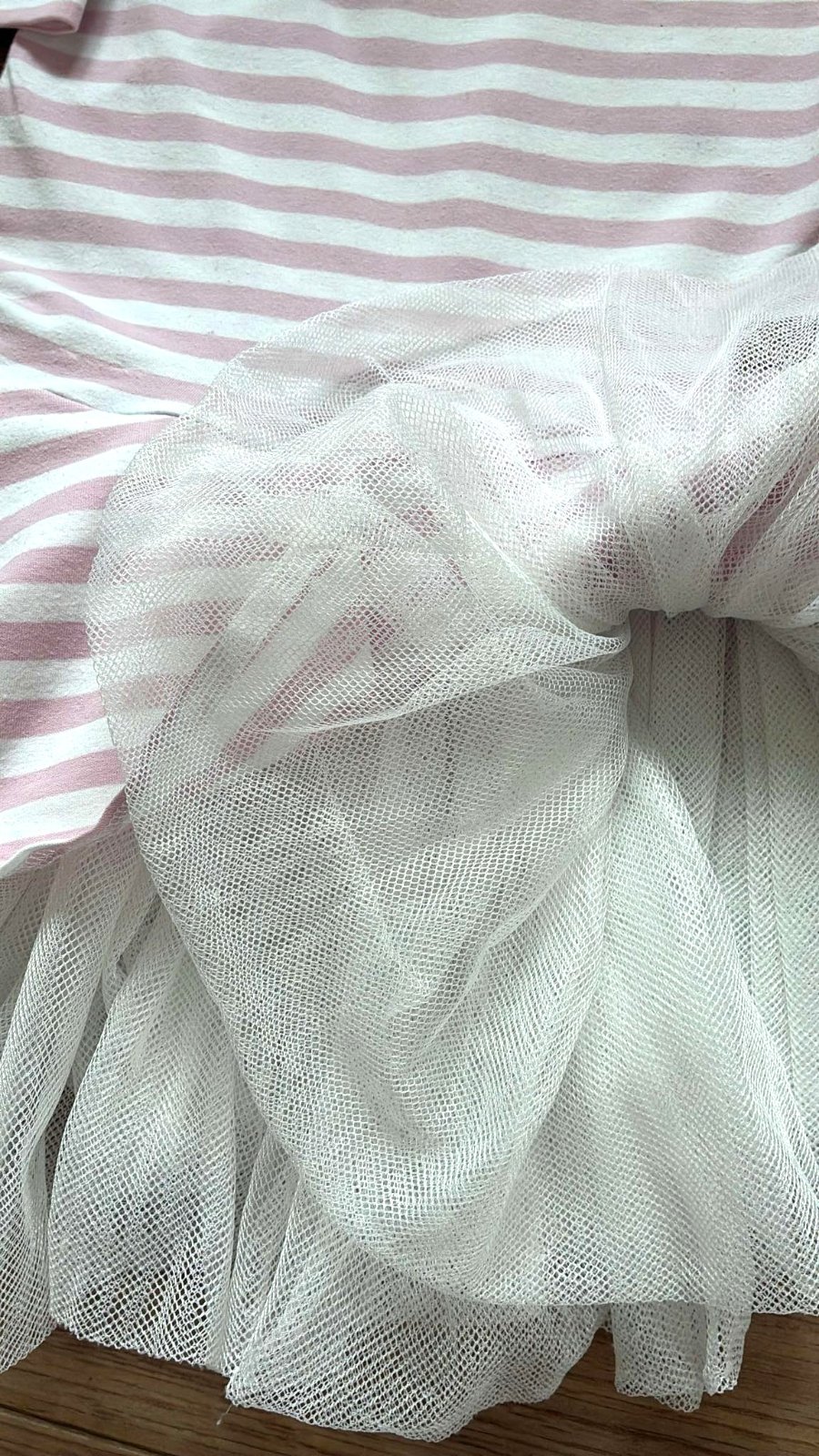 Predám šaty s 3/4 rukávmi v jemnom ružovo-bielom prúžkovanom dizajne, majú moderný strih so zníženým pásom a bohatú sukničku tvorenú 4 radmi tylu, čo vytvára nadýchaný efekt, sú bez zapínania. Materiál bavlnený úplet s prímesou elastanu (horná časť) a polyesterová sieťovina (volány). Dĺžka po znížený pás=44cm, šírka pod pazuchami=33cm, rukáv=30cm. Veĺmi dobrý stav, bez poškodení.