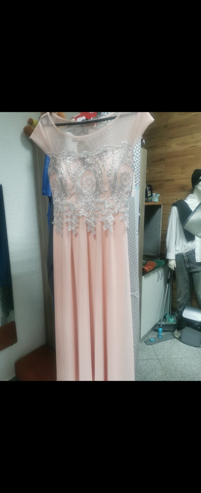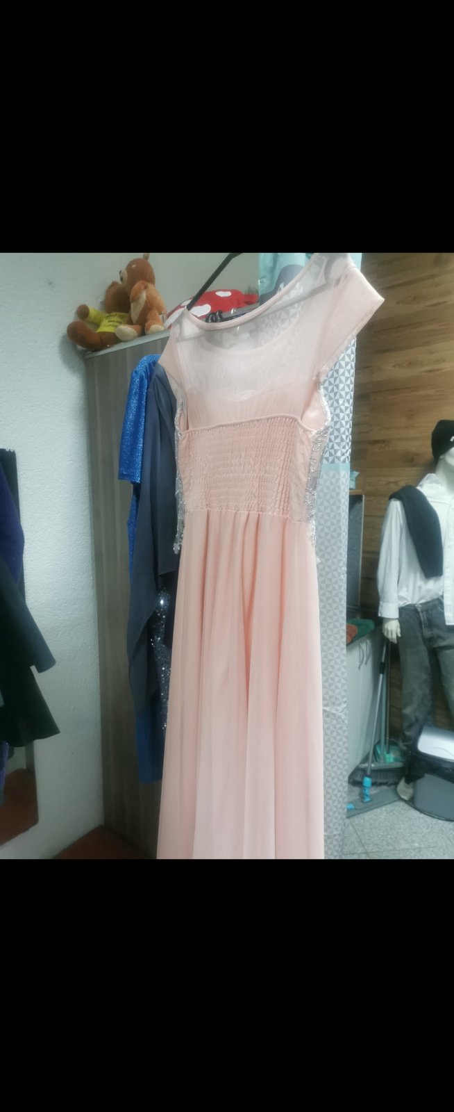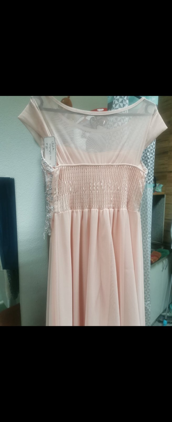 Nádherné šifónové šaty v bledučko ružovej farbe, ľahučké, s podšívkou. Pod prsiami nariasené do gumičky, schovajú aj menšie tehotenské bruško. Zapínanie vzadu na krku na gombičku, okolo celého krku...