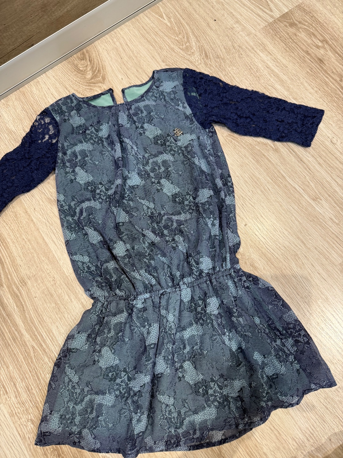 veľmi pekné šatočky pre parádnice v peknom stave bez poškodení, látka je tenká - vyzerá ako riflovina, veľkosť na 7-8 rokov, dĺžka 64cm, šírka pod pazuchami 34cm, cez boky 38cm.
