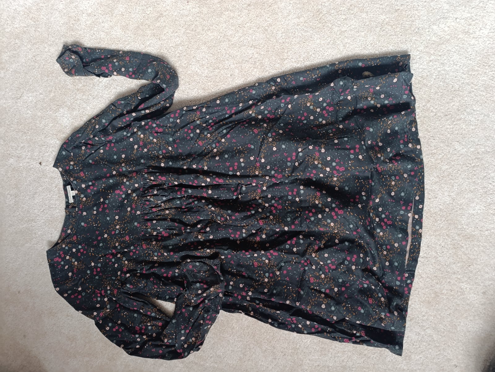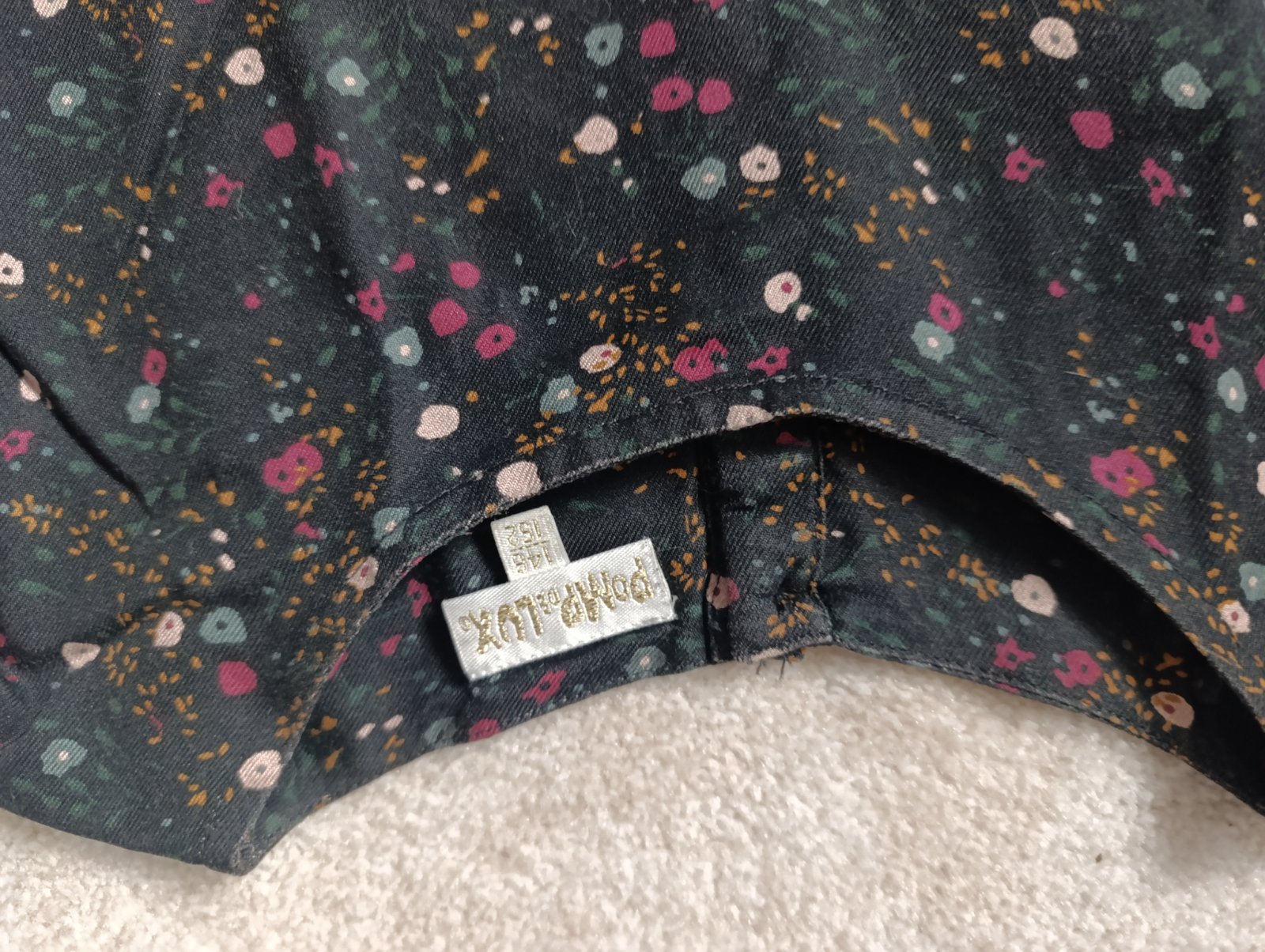 Šaty zn. Pompdelux veľ. 146/152, 100% bavlna, podšívka 100% bavlna, v páse stiahnuté gumičkou, po bokoch vrecká, farba hnedo-ružová. Dĺžka: 80 cm Šírka pod pazuškami: 42 cm Rukáv: 54 cm Asi 2x oble...