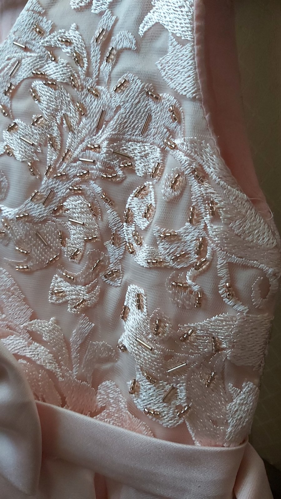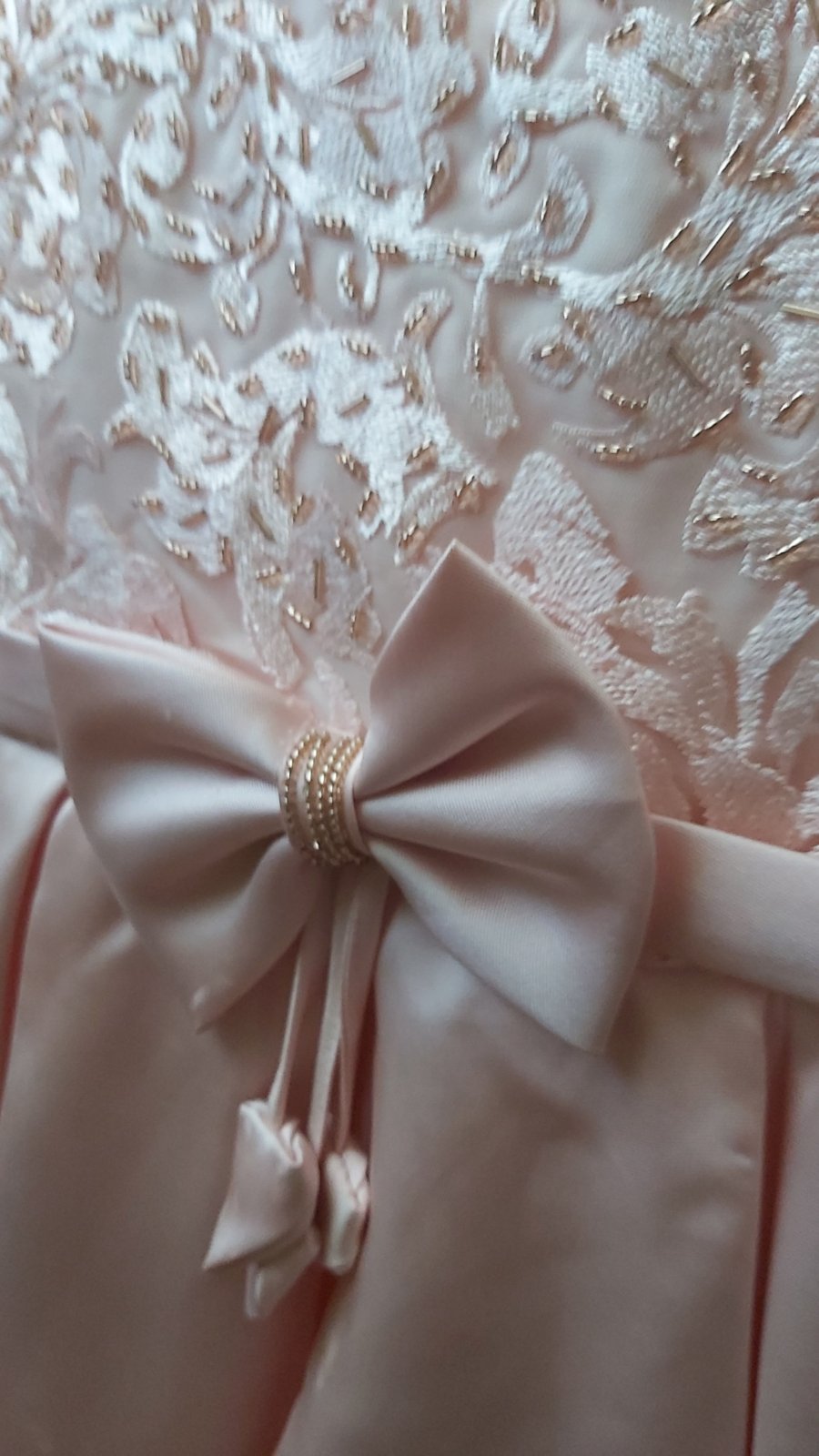 Farba bledolososová/bledoružová, tj. teplá farba. Podšívka z príjemnej bavlny. Celková dĺžka 85 cm, šírka v páse 70 cm.
