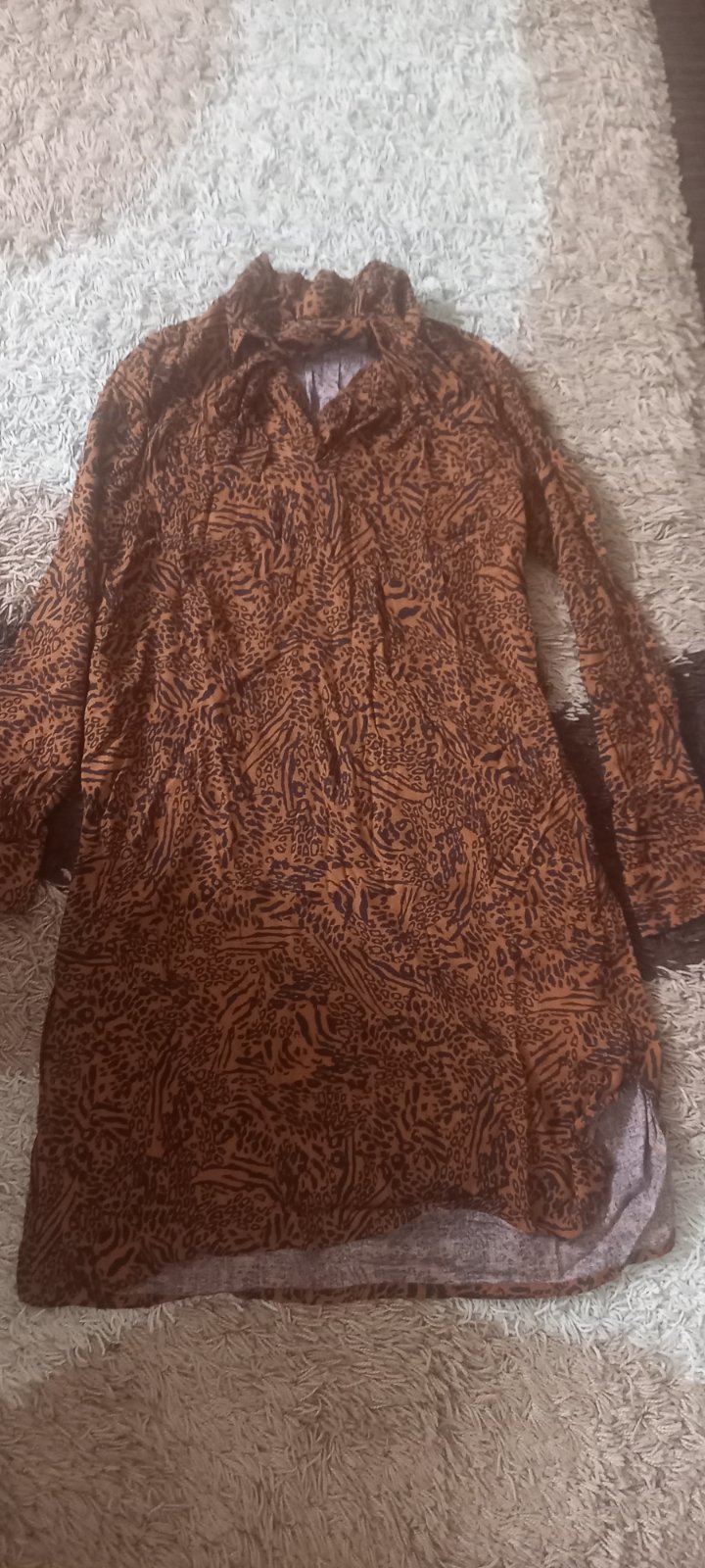 Krasne hnede tigrovane saty volnejsieho strihu. Velkostne sedia na S, M, L - uni. Pekne ukazu s opaskom.