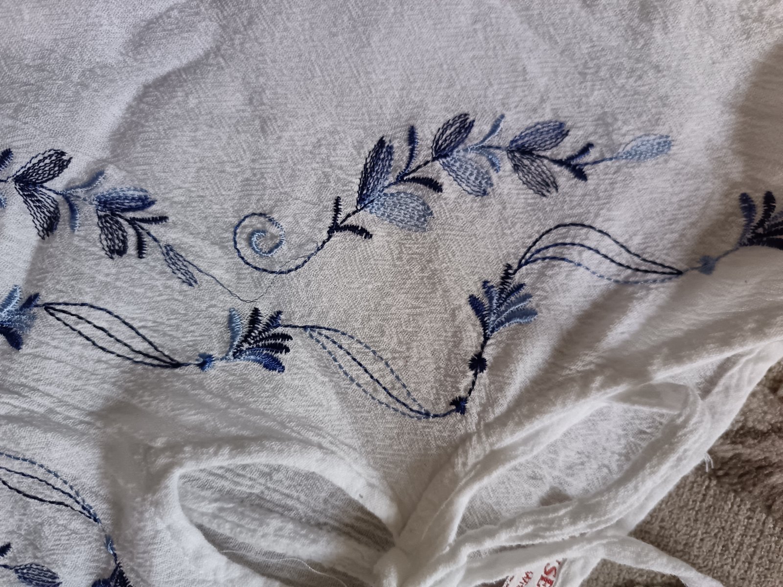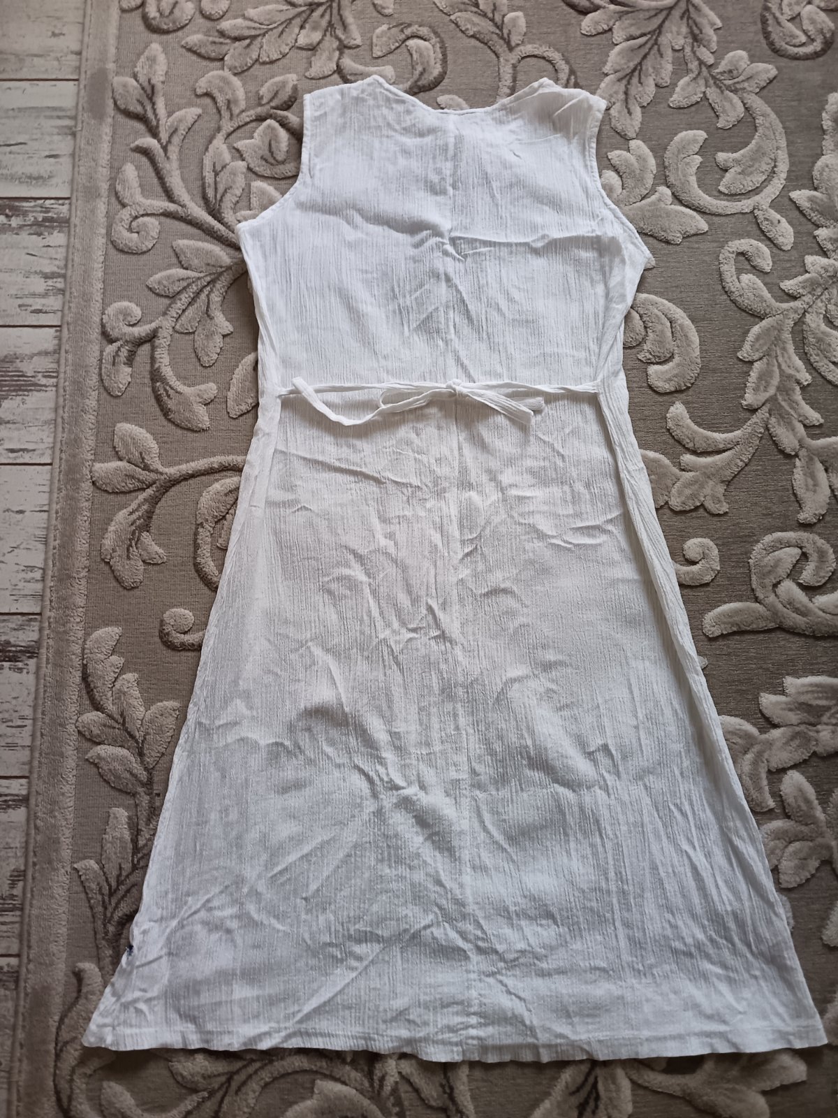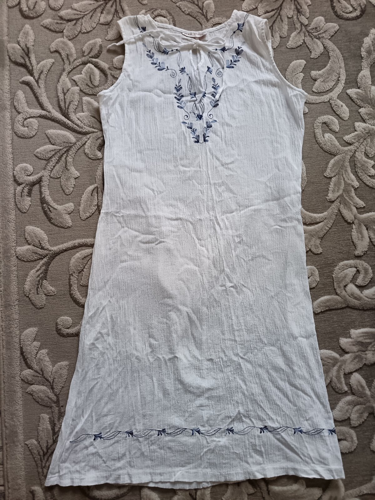Predám dámske alebo dievčenské šaty z ľanovej látky. Krásne vyšívané. Vyrobené v Taliansku. Šírka pliec je 35cm. Celková dĺžka šiat je 103cm. Cena je bez poštovného.
