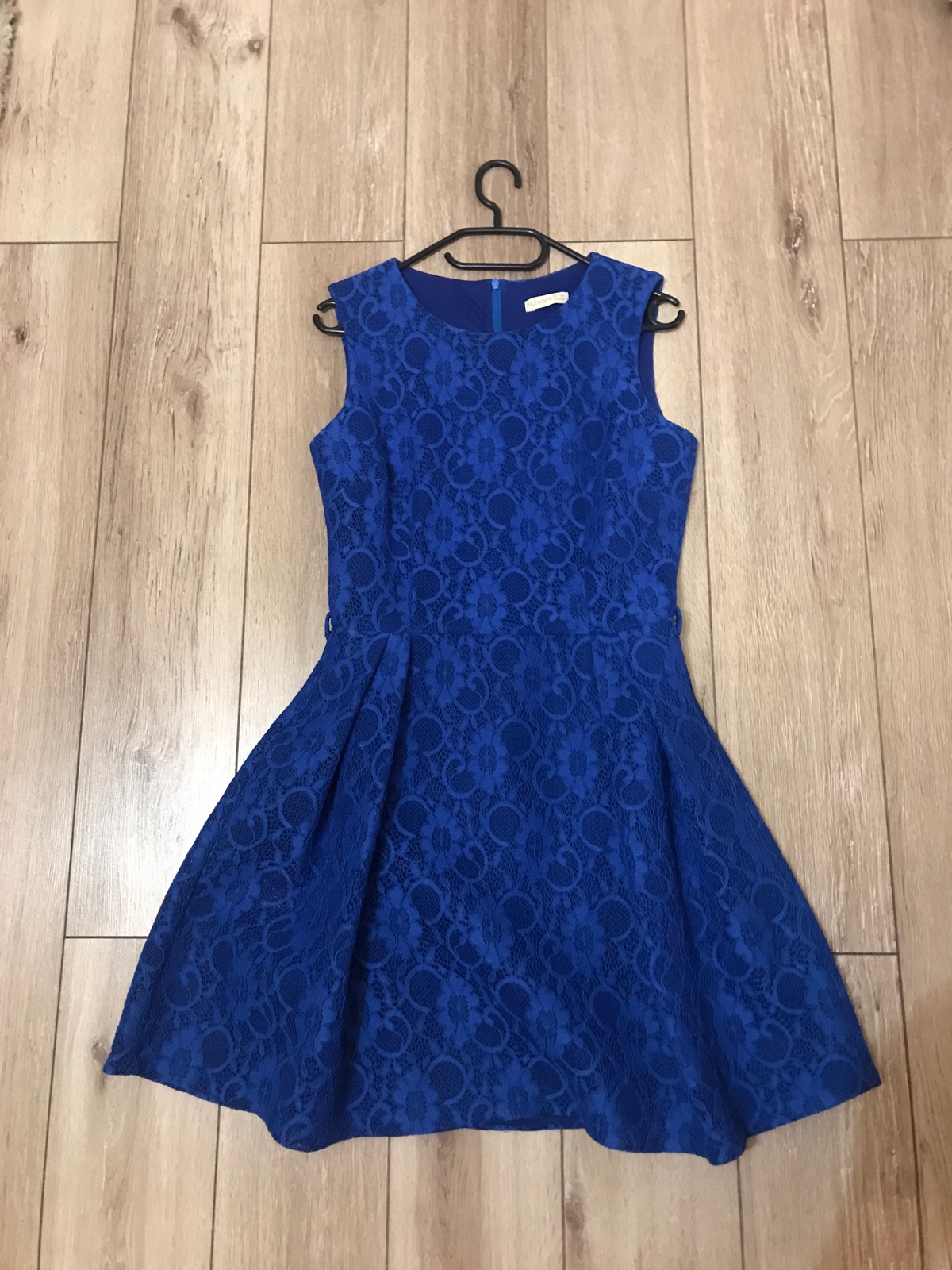 Krásne spoločenské šaty, jedenkrát oblečené na pár hodín. Farba kráľovská modrá s viazaním vzadu. Veľkosť odhadom, riaďte sa prosím rozmermi v páse 40 cm, dĺžka šiat 80 cm.