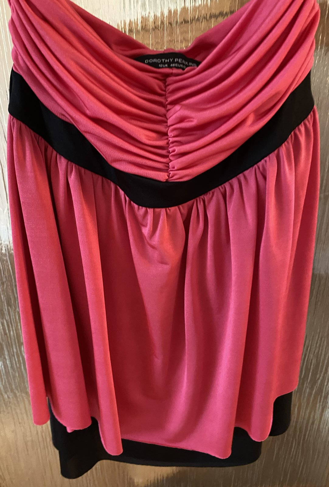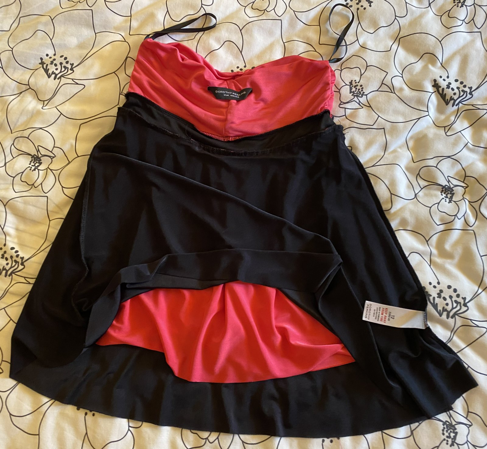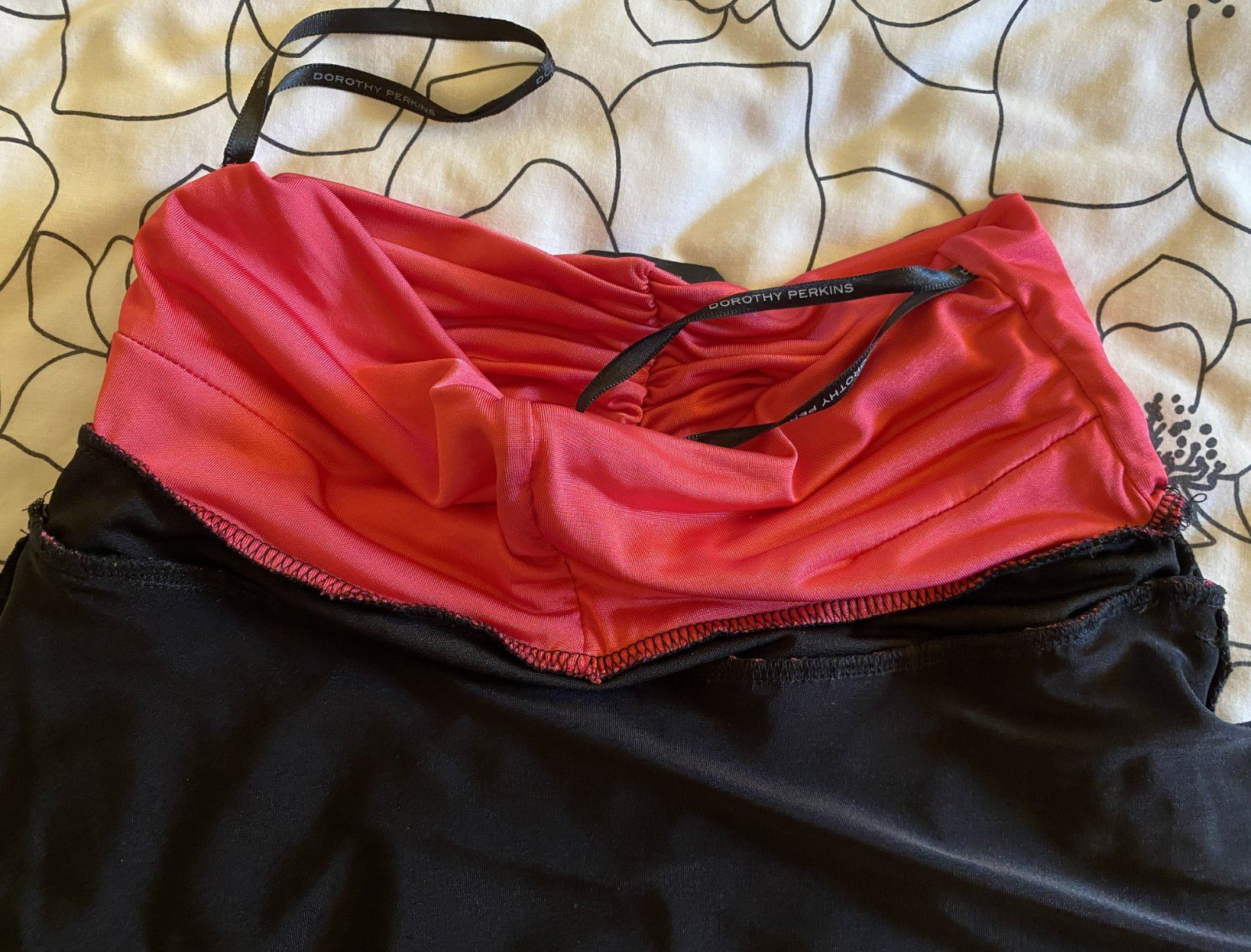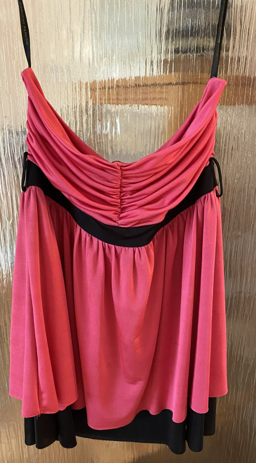 Predĺžený top Dorothy Perkins v. 40, príjemný nekrčivý padavý materiál - 95% polyester, 5% elastan, farba malinová v kombinácii s čiernou, vrch aj spodný diel dvojitá látka, bez ramienok, asi 2x oblečený, bez poškodenia. Miery merané v kľude: dĺžka vpredu cez stred: 51cm, horná časť: 32-40cmx2, pás- čierna časť: 33-40mx2, spodná časť bohato riasená - viď detail. foto.