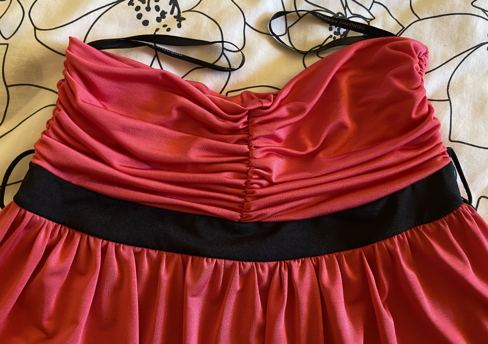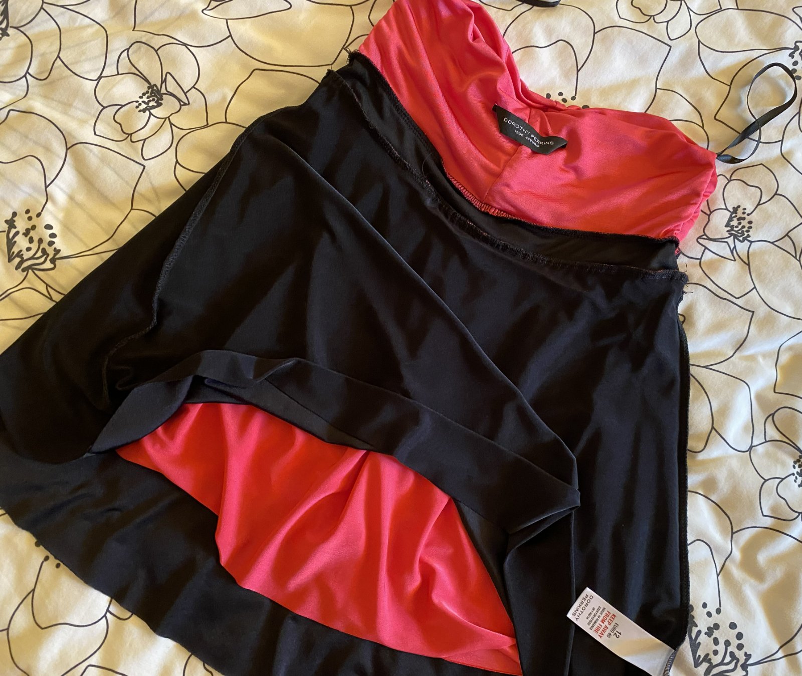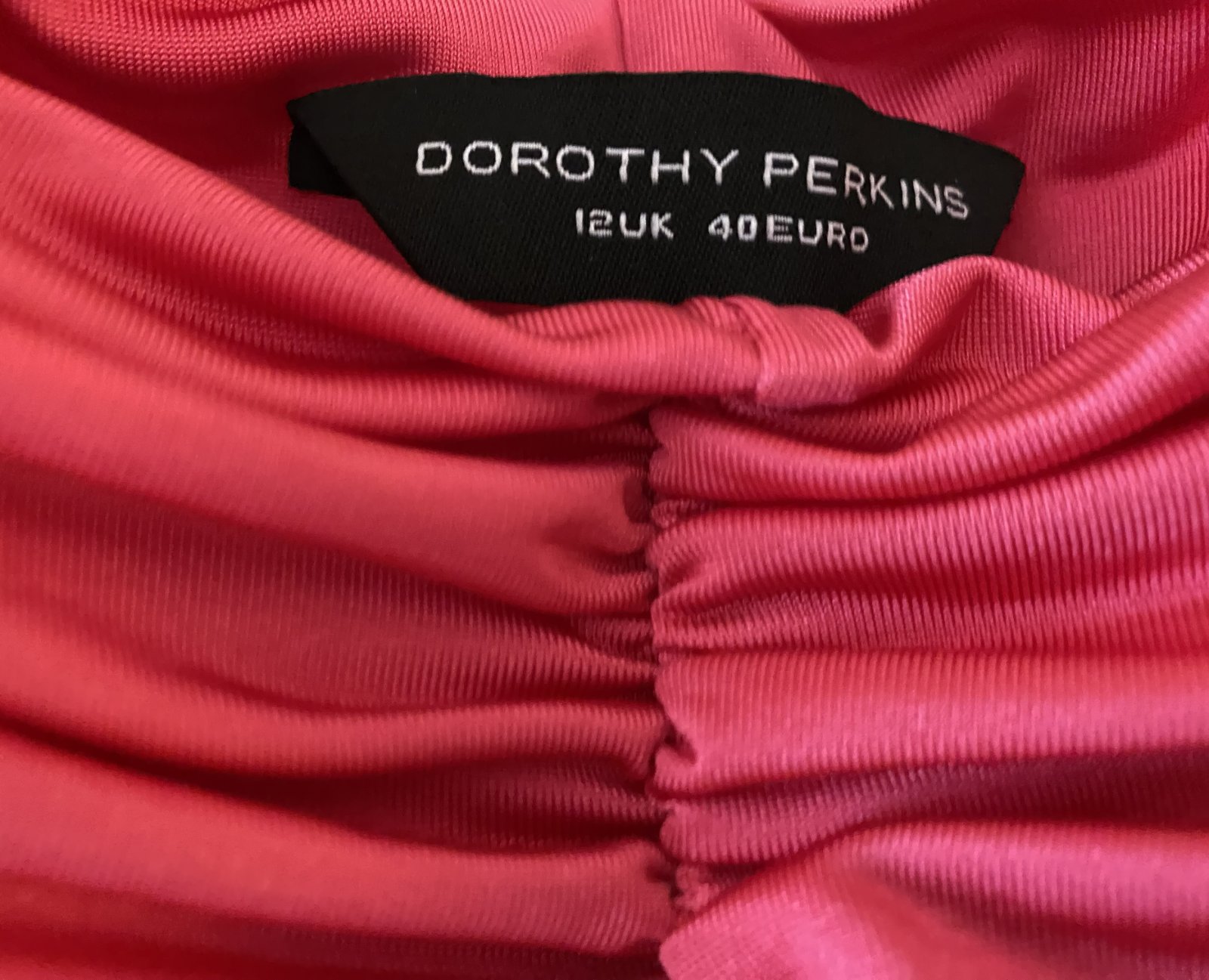 Predĺžený top Dorothy Perkins v. 40, príjemný nekrčivý padavý materiál - 95% polyester, 5% elastan, farba malinová v kombinácii s čiernou, vrch aj spodný diel dvojitá látka, bez ramienok, asi 2x oblečený, bez poškodenia. Miery merané v kľude: dĺžka vpredu cez stred: 51cm, horná časť: 32-40cmx2, pás- čierna časť: 33-40mx2, spodná časť bohato riasená - viď detail. foto.