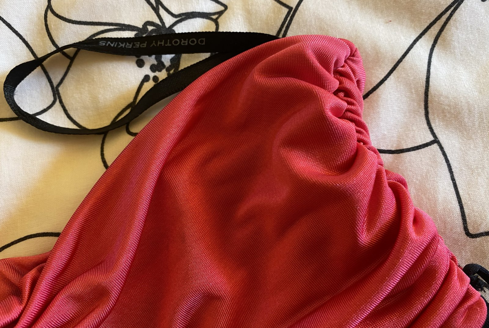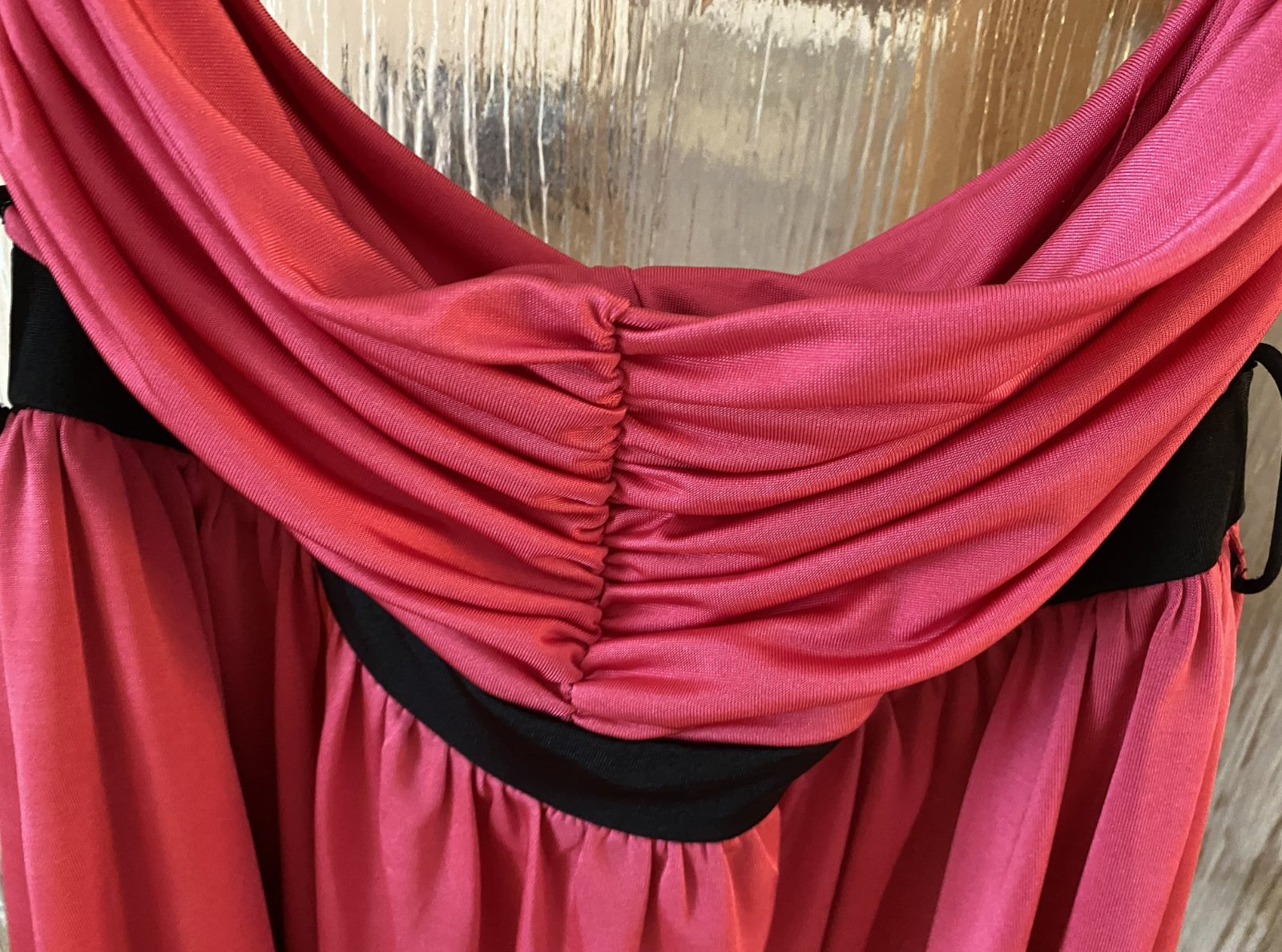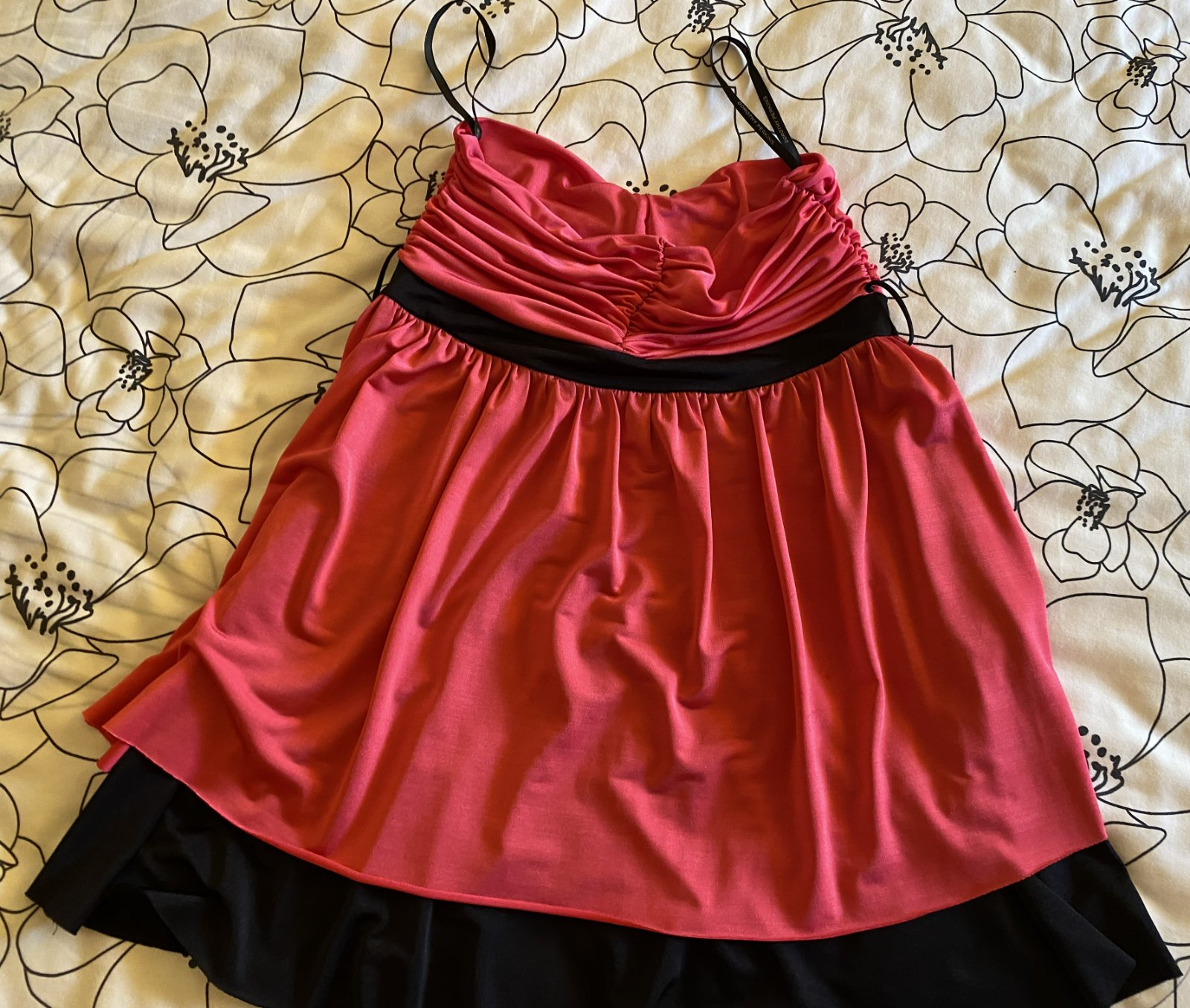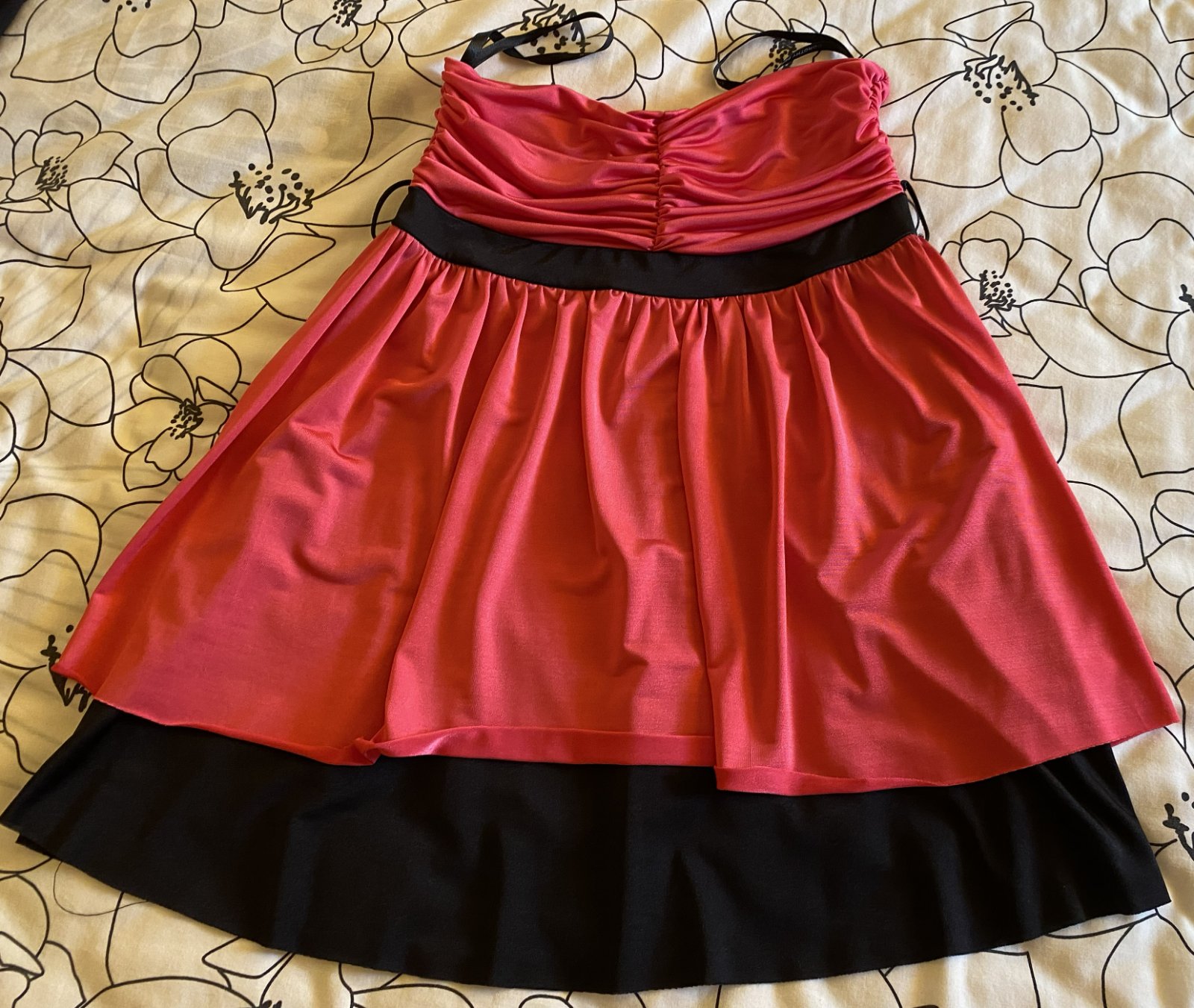 Predĺžený top Dorothy Perkins v. 40, príjemný nekrčivý padavý materiál - 95% polyester, 5% elastan, farba malinová v kombinácii s čiernou, vrch aj spodný diel dvojitá látka, bez ramienok, asi 2x oblečený, bez poškodenia. Miery merané v kľude: dĺžka vpredu cez stred: 51cm, horná časť: 32-40cmx2, pás- čierna časť: 33-40mx2, spodná časť bohato riasená - viď detail. foto.