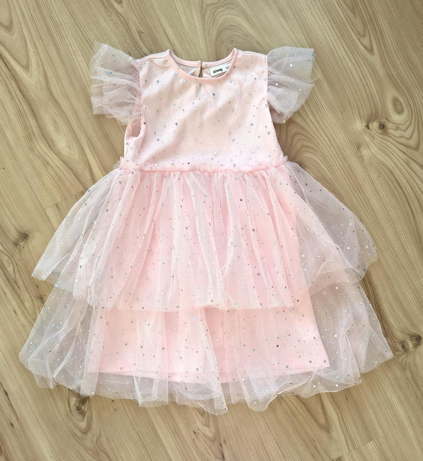 Veľkosť 122, celková dĺžka 65cm, šírka 2x32cm. Šaty boli oblečené len 1x, perfektný stav, nepoškodené.