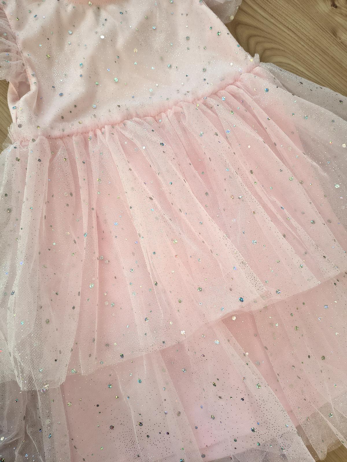 Jemné dievčenské šaty v dĺžke po kolená, svetlučko ružovej farby, vrchná časť je tylová, posiata striebornými trbietavými ozdobami. Okrúhly výstrih, zapínanie vzadu na krku na gombík. Miesto rukávov jemné tylové volániky.