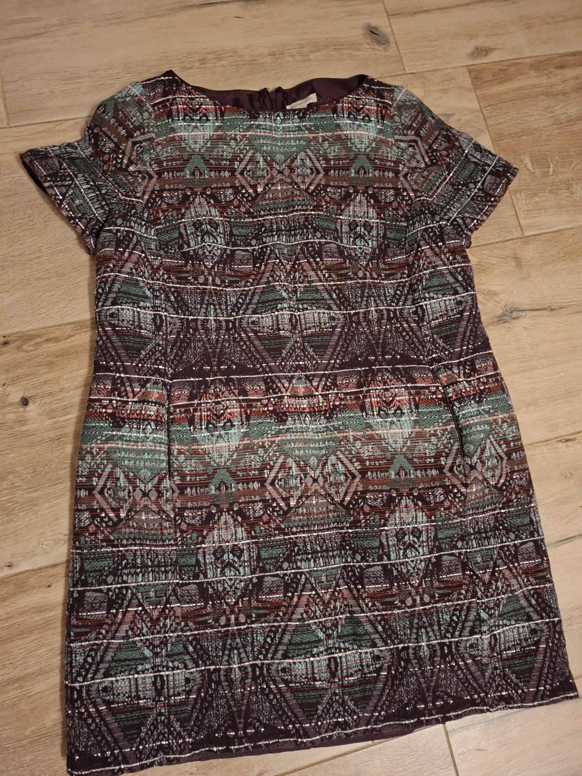 Dlzka 93cm, maju vrecka na bokoch, zips vzadu. Fialovo zeleno ruzovo biele