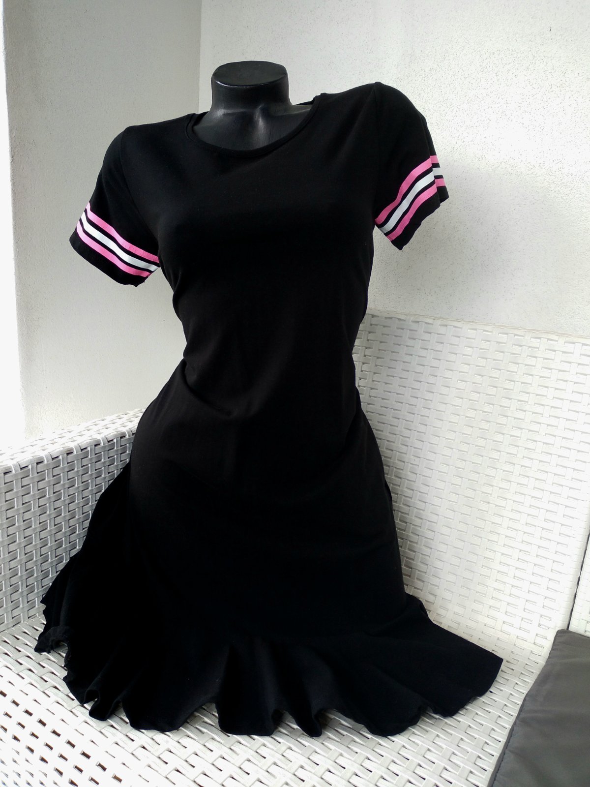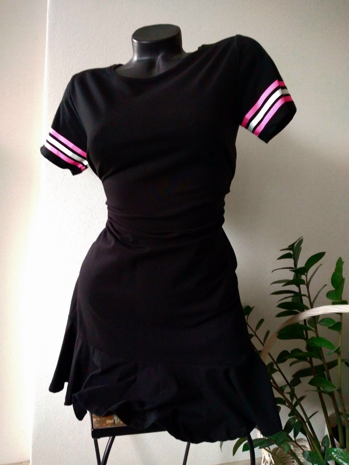 Športové šaty, sú strihané jemne do áčka, ukončené volánom, majú dva vačky.