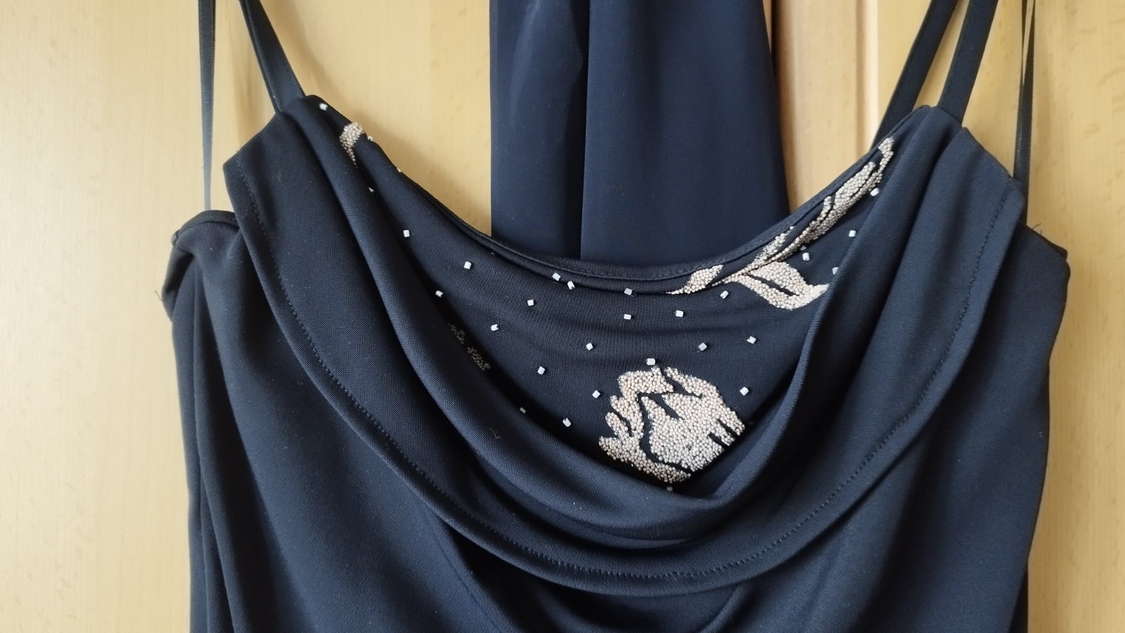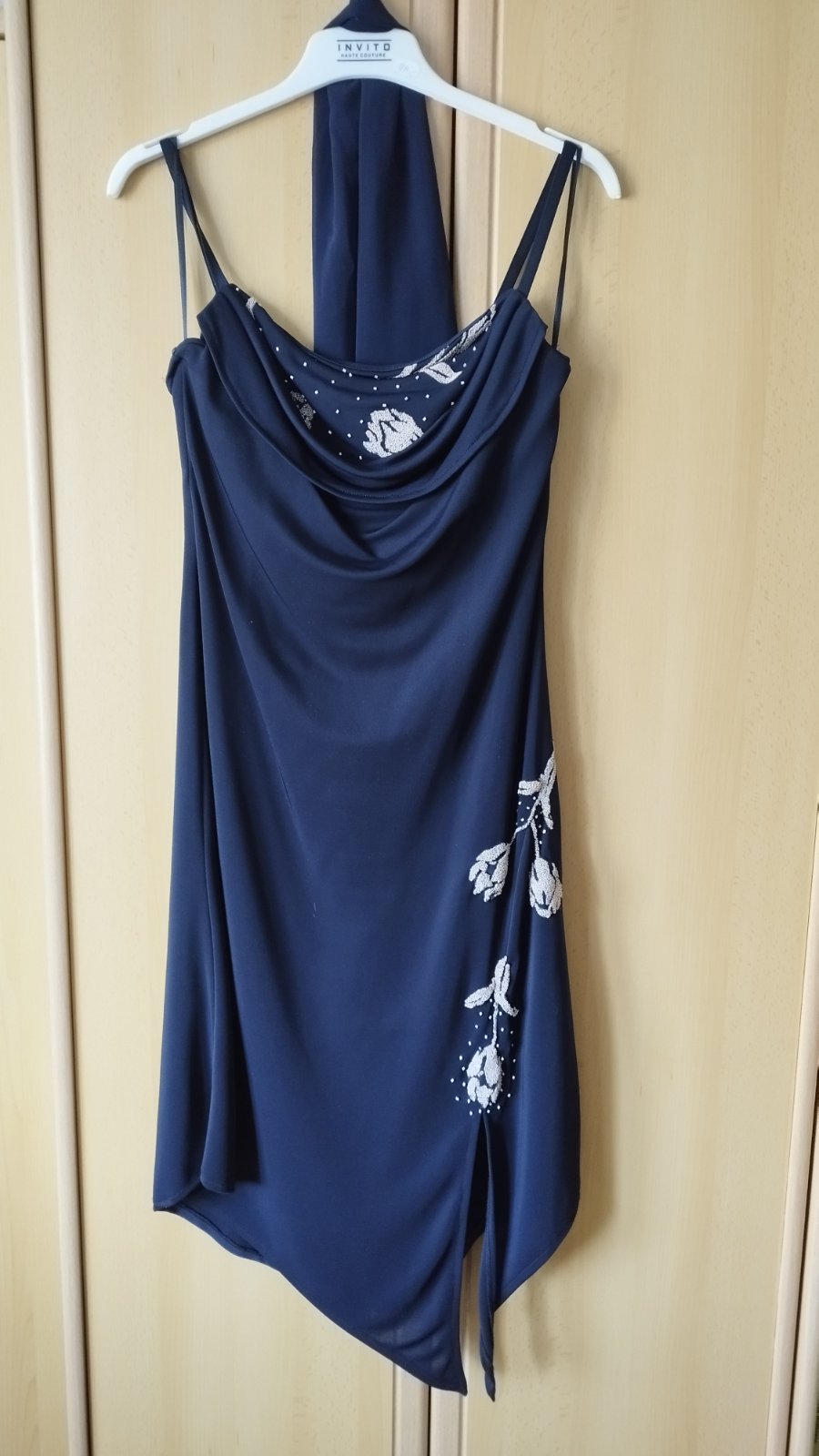Elegantné šaty s krásnymi detailmi kvetov z koralok, zaujímavé riešenie dekoltu, dĺžka trošku pod kolená so zaujímavým strihom, ľahké pohodlné šaty na rôzne príležitosti, párkrát nosené, výborný stav