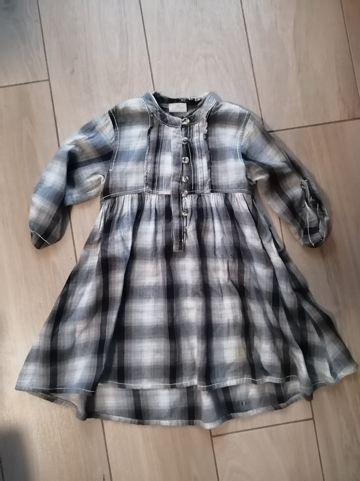 Nosené, s trištvrťovým rukávom, veľmi radi sme ich nosili, sú tenké, nie sú hrubé. Majú dieru, ale z druhej strany sme dali nažehlovačku srdiečko (posledné dve foto). Gombíky sú funkčné, nie sú len dekorácia, zadný diel dlhší. Po nosili sme bez problémov ako 116 a čiastočne aj 122, to už bola tunika. Rozmery sú nafotené.