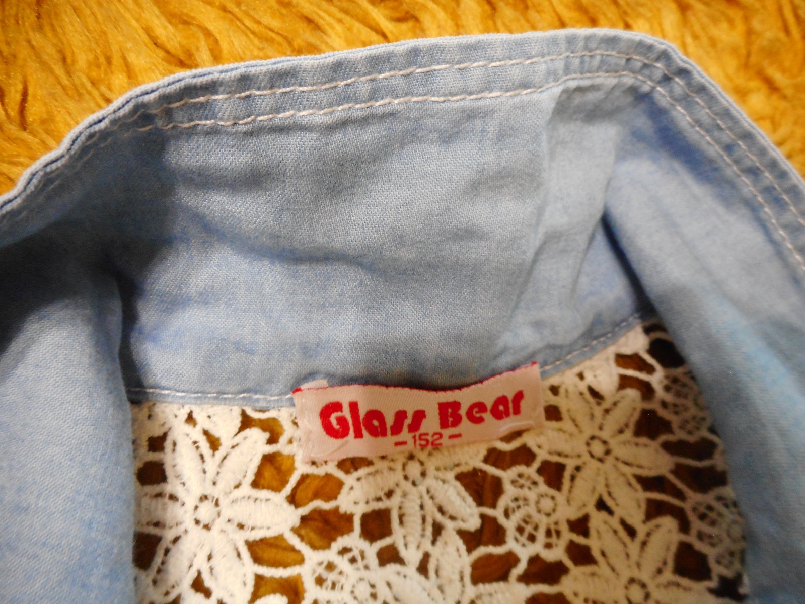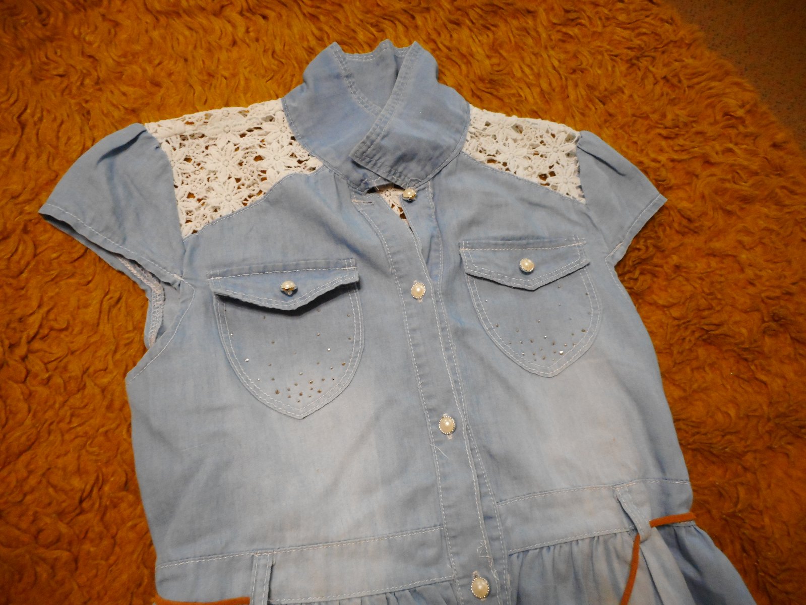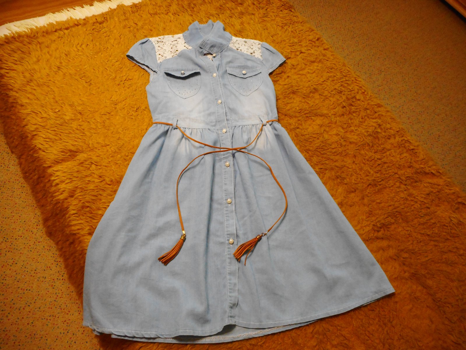 predám používané nepoškodené veľmi pekné letné mäkké riflové šatočky pre dievčatko so zapínaním vpredu na gombičky akoby perleťové s opaskom zn. Glass Bear veľkosť 152cm, svetlomodrej farby s krátkym rukávom, v časti ramien veľmi pekná nápaditá čipka, na hrudníku dve vrecká vybíjanými patentkami ktorá sa trblietajú, suknička mierne rozšírená, celková dĺžka šiat je 83cm, pás 37cm, šírka pod pazuchami je 40cm