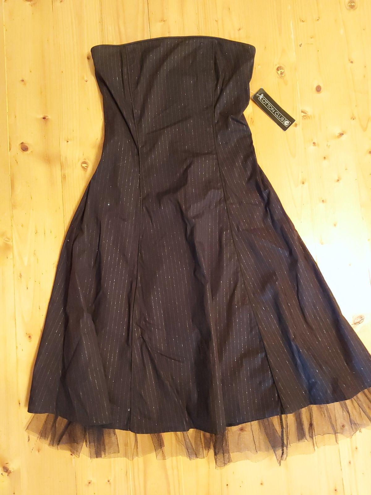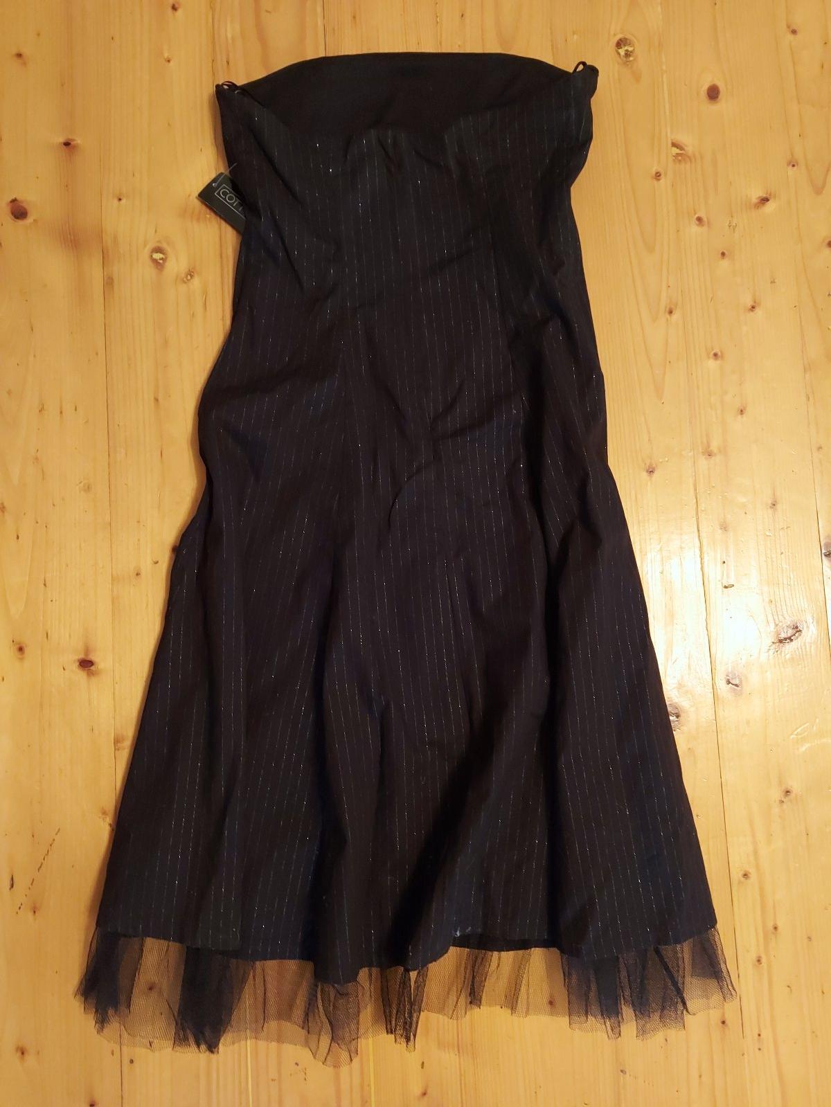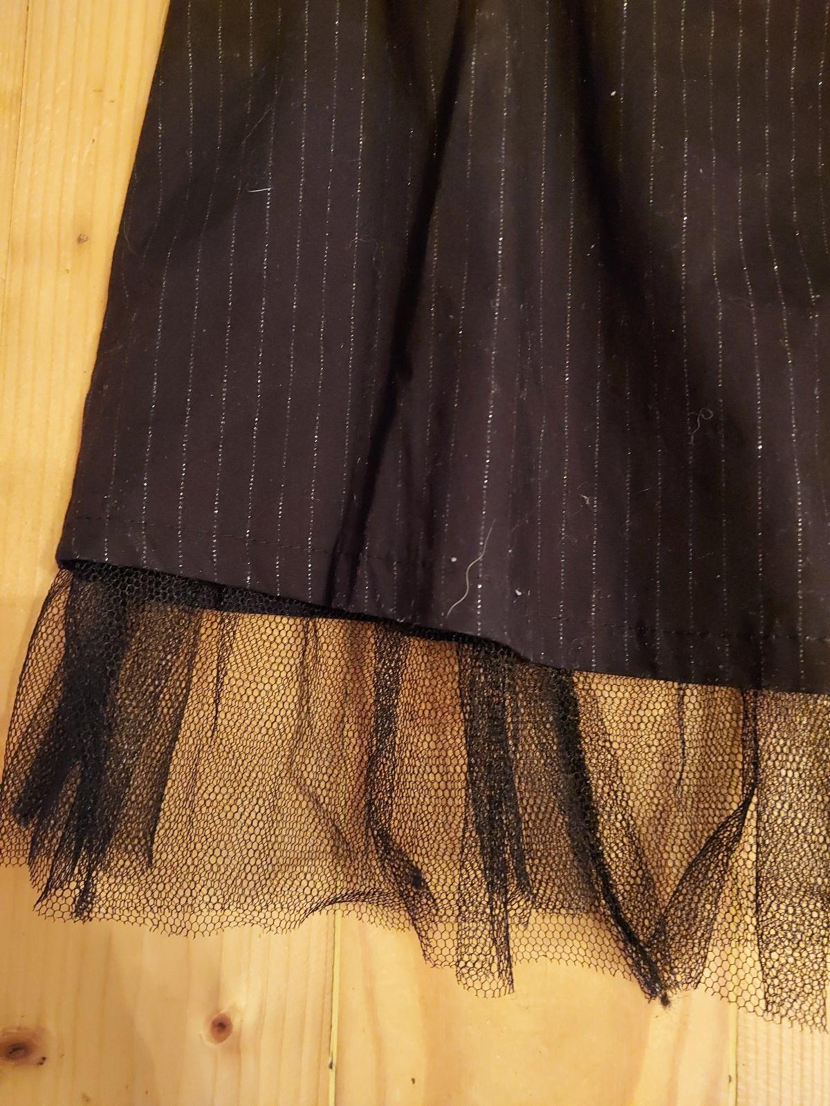 Spoločenské šaty s tylom na spodnej časti, bez ramienok, vzadu na zips, sukňa do "Á-čka", š. pod prsiami 35,5, dĺžka zadného dielu 74,5 bez tylu, sú podšité, šaty nie sú nosené-ešte s visačkou. Veľkosť je 12. Farba je čierna so striebornými jemnými prúžkami.