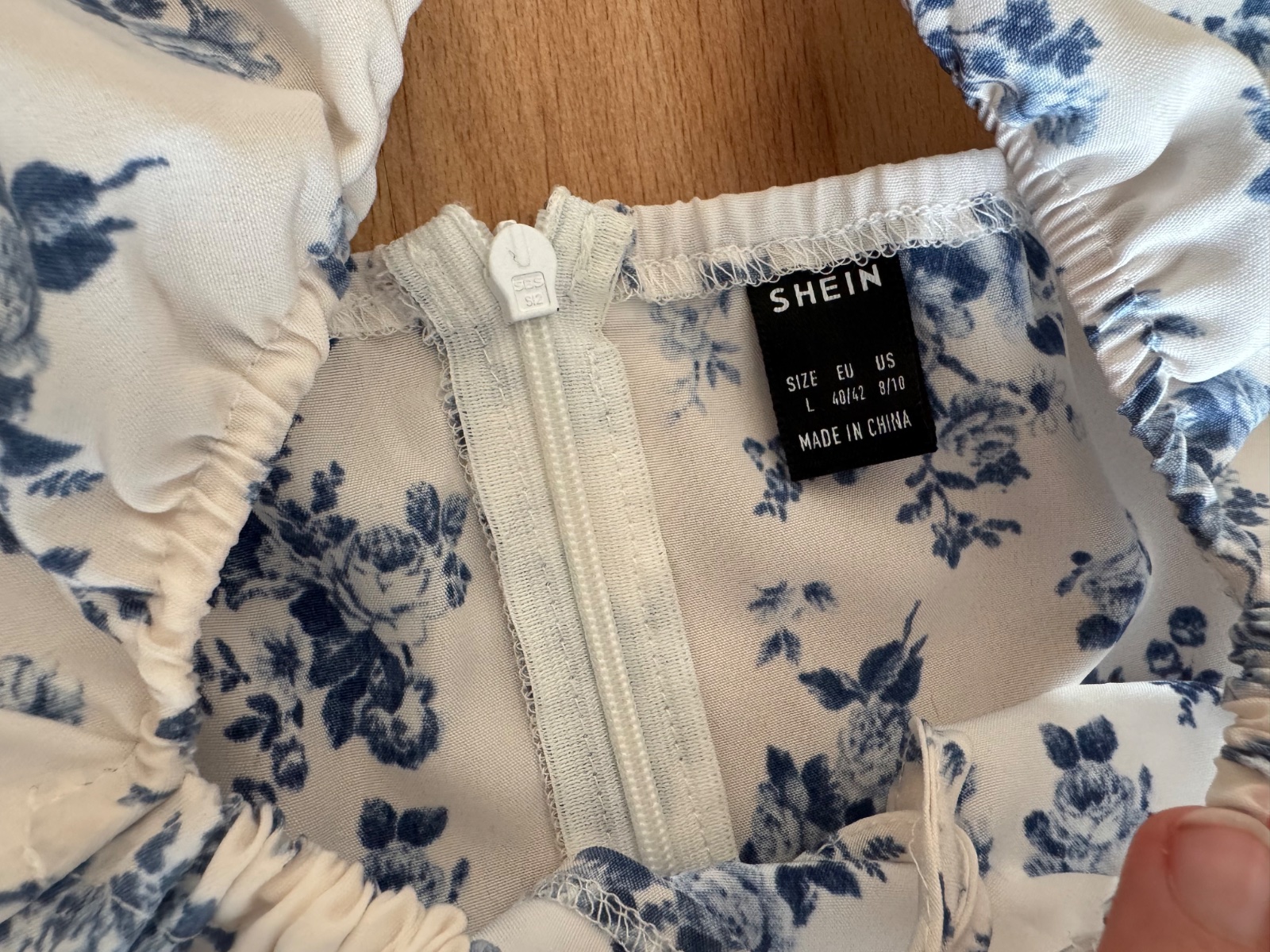 Krásne letné šaty biele s modrými kvietkami. Veľkosť L. Veľmi pekne tvaruju postavu, majú aj rozparok. Zozadu zapínanie na zips. Rozmery: dĺžka 125 cm ( aj s rukávom), pás 38 cm